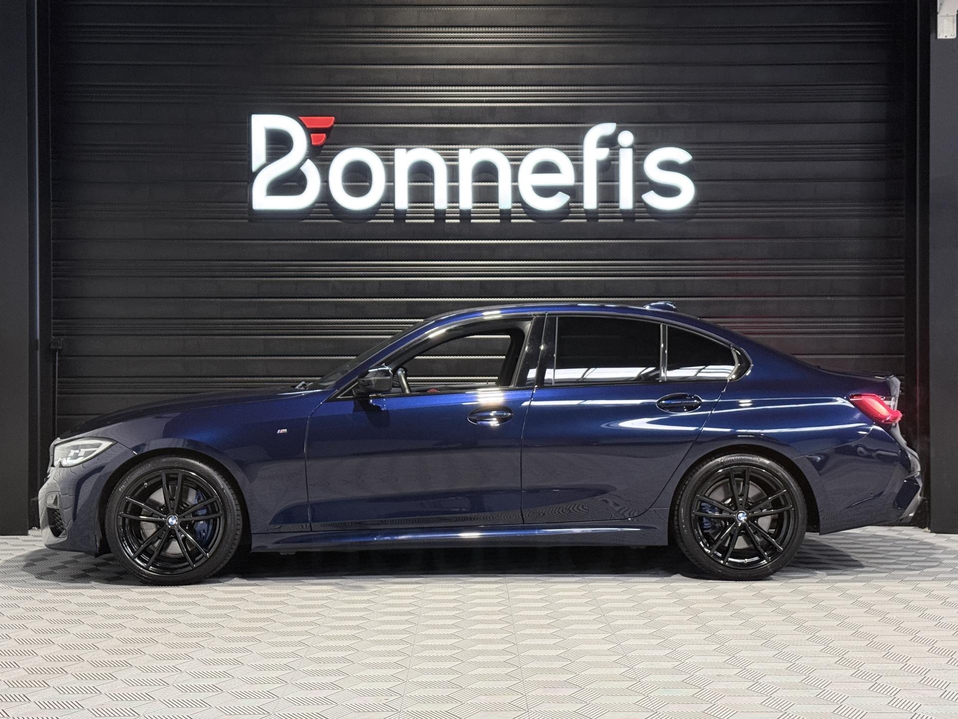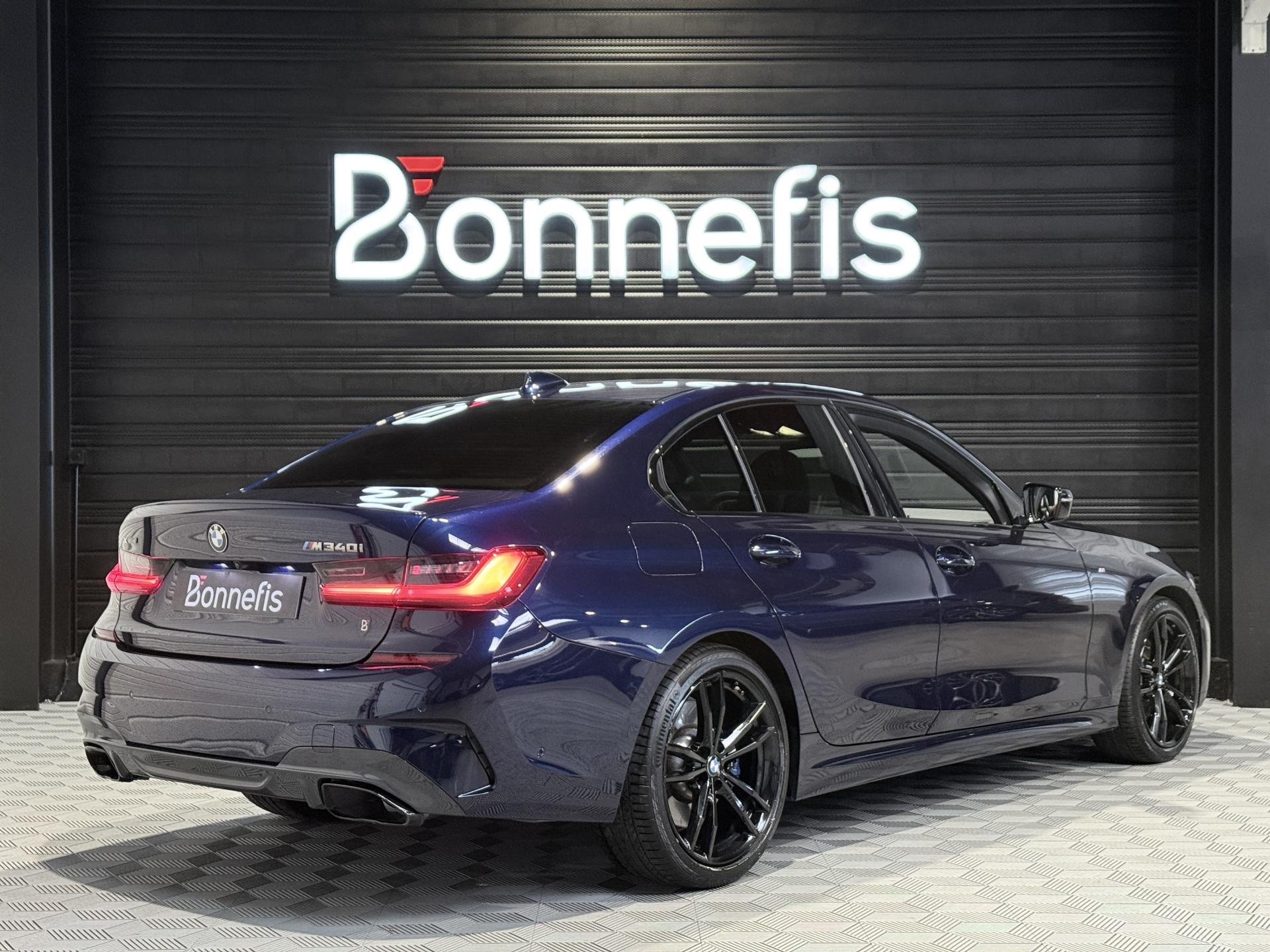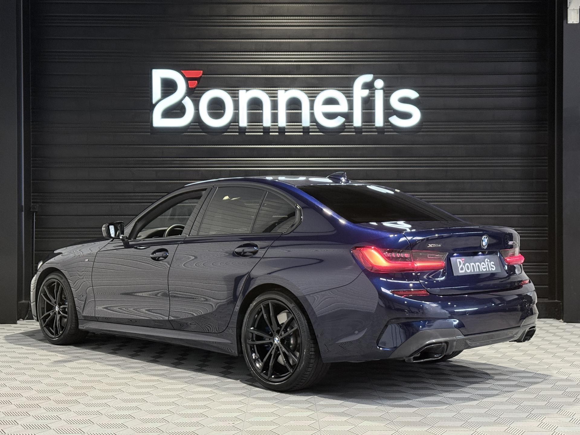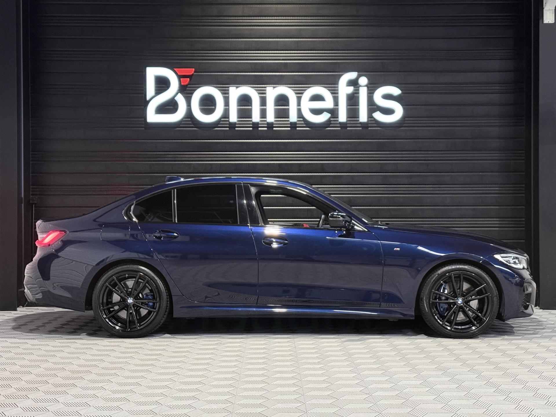 BMW SERIE 3 Berline M340i xDrive 374Ch BVA8 G20, extérieur bleu métallisée ( Tansanitblau Individual )( 1 791 EUR ), intérieur sellerie Cuir "Vernasca" Schwarz avec surpiqûres Bleues / Teinte d'habitacle Schwarz ( 1 541 EUR ), 26 cv, 4 portes, première mise en circulation le 11/12/2020.