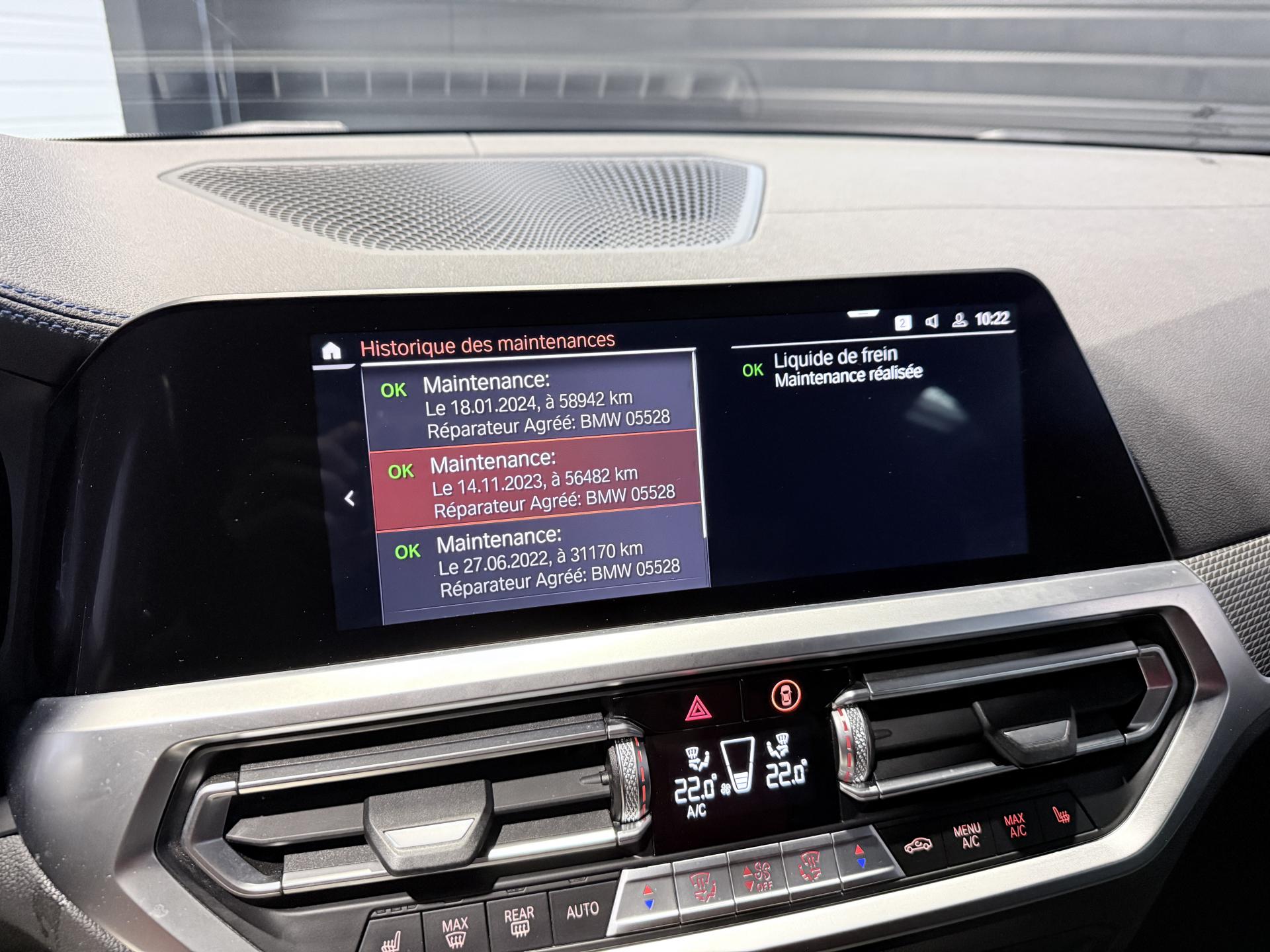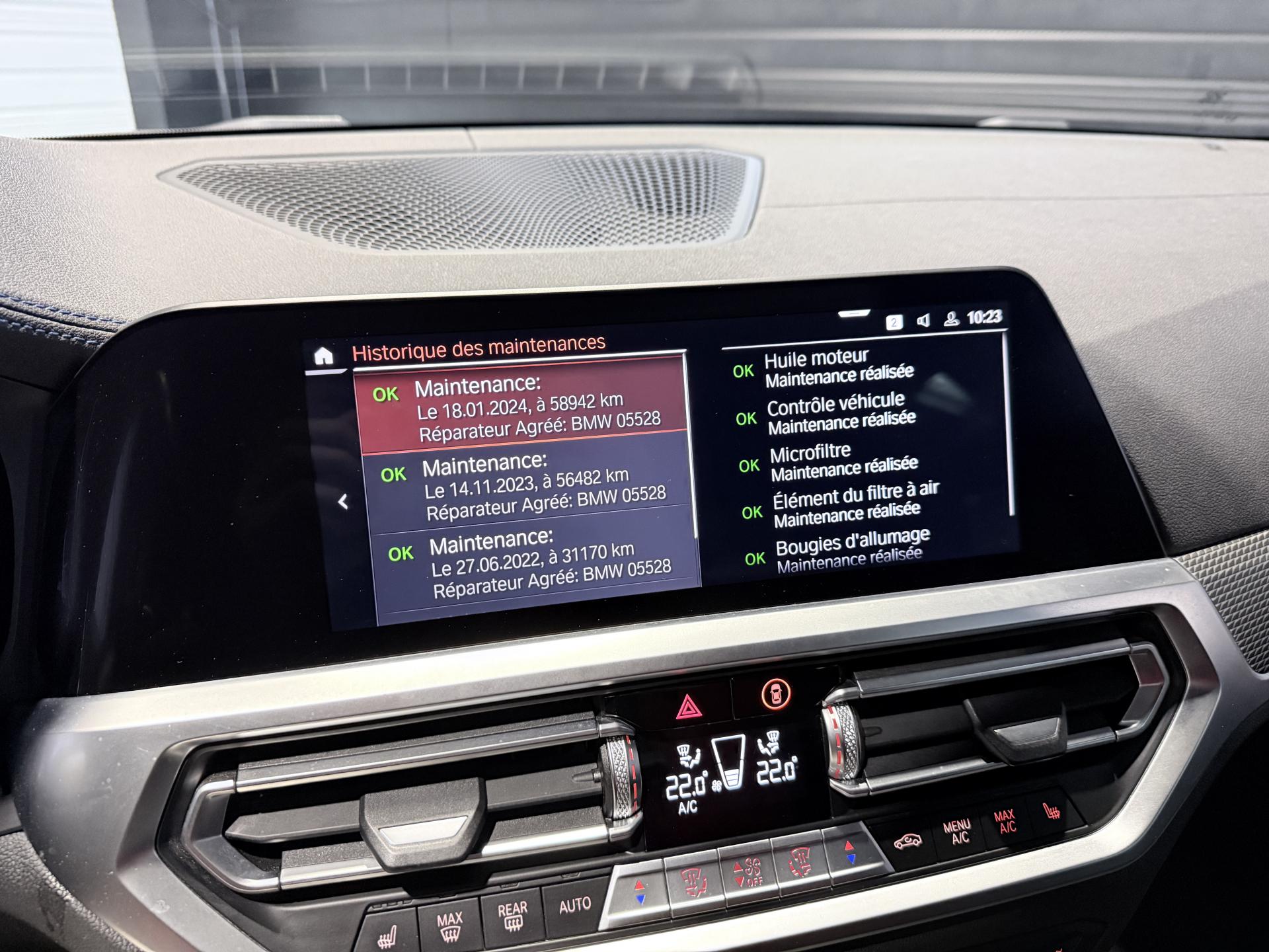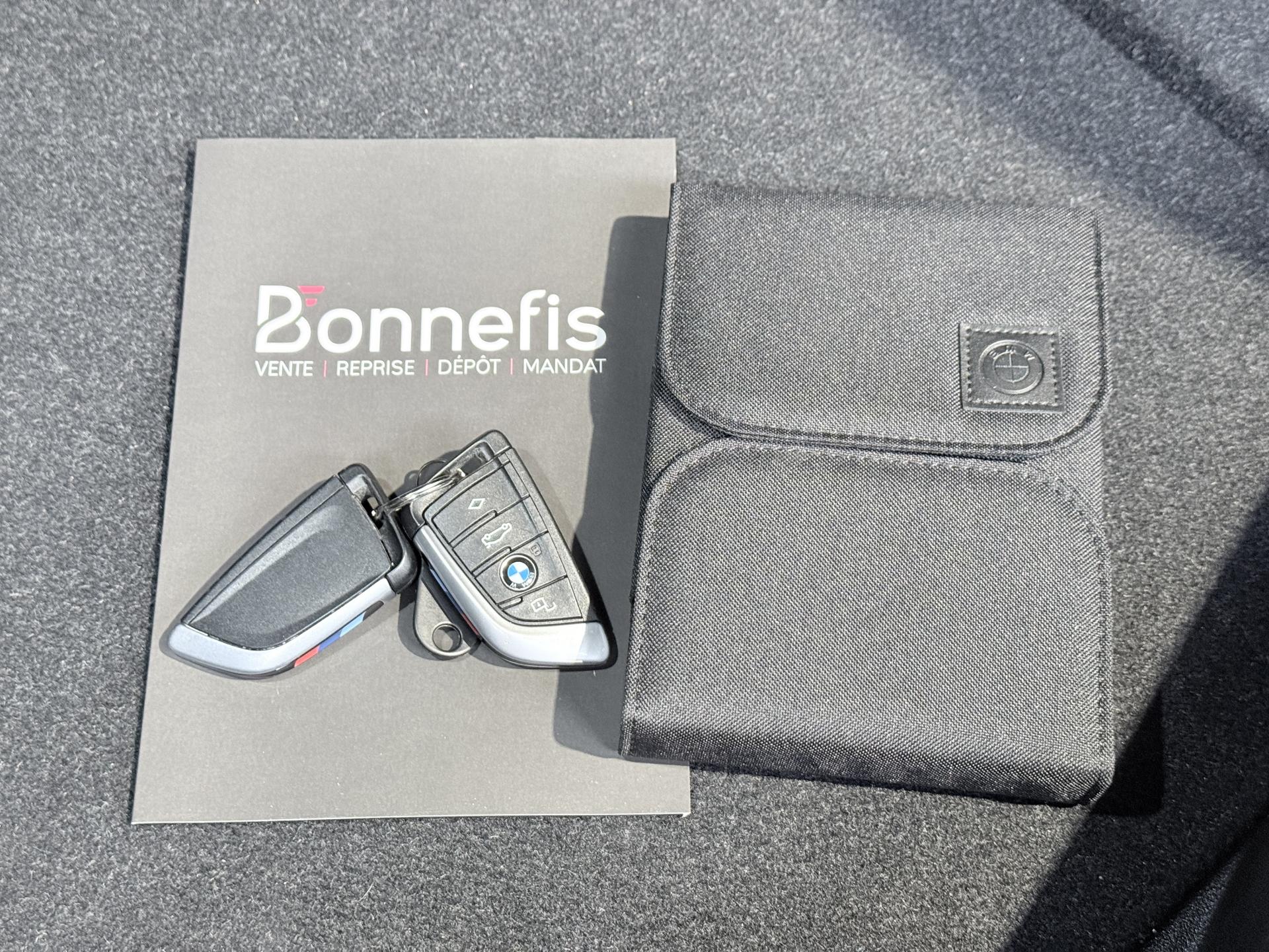 Nombreuses options : GPS, caméra de recul, Apple Carplay, radars avants et arrières de détection d'obstacles, Projecteurs Full LED directionnels ( 833 EUR ), Suspensions SelectDrive ( 541 EUR ), Planche de bord en Similicuir Sensatec ( 458 EUR ), Alarme antivol ( 416 EUR ), Connectivité avancée avec recharge sans fil par induction ( 383 EUR ), Vitrage calorifuge ( 341 EUR ), Sièges AV chauffants Assise et dossier des sièges AV chauffants, Intensité selon 3 niveaux, Fonction de chauffage rapide ( 333 EUR ), Shadow Line brillant BMW Individual étendu ( 216 EUR ), Feux de route anti-éblouissement ( 141 EUR ), Coques de rétroviseurs extérieurs en noir brillant ( 108 EUR ), Appel d'Urgence Intelligent (durée de vie de la voiture), BMW Live Cockpit Navigation Pro, Boîte de vitesses automatique Sport 8 rapports avec palettes au volant, Climatisation automatique 3 zones, Freins Sport M Etriers de freins bleus avec désignation M, Mesure individuelle de pression des pneumatiques, Régulateur de vitesse avec fonction de freinage et limiteur de vitesse, Rétroviseurs extérieurs rabattables électriquement / Rétroviseur gauche électrochrome, ...