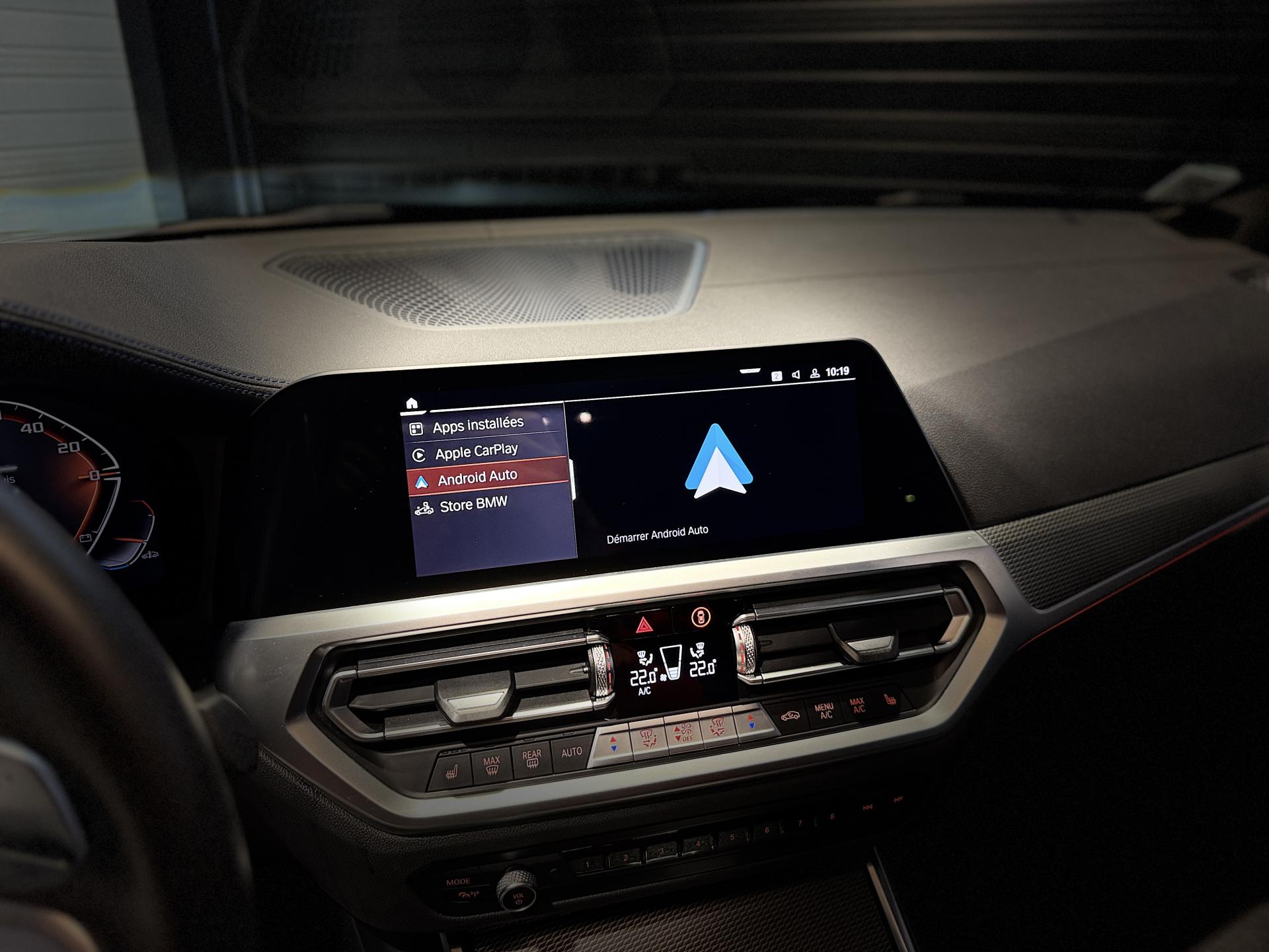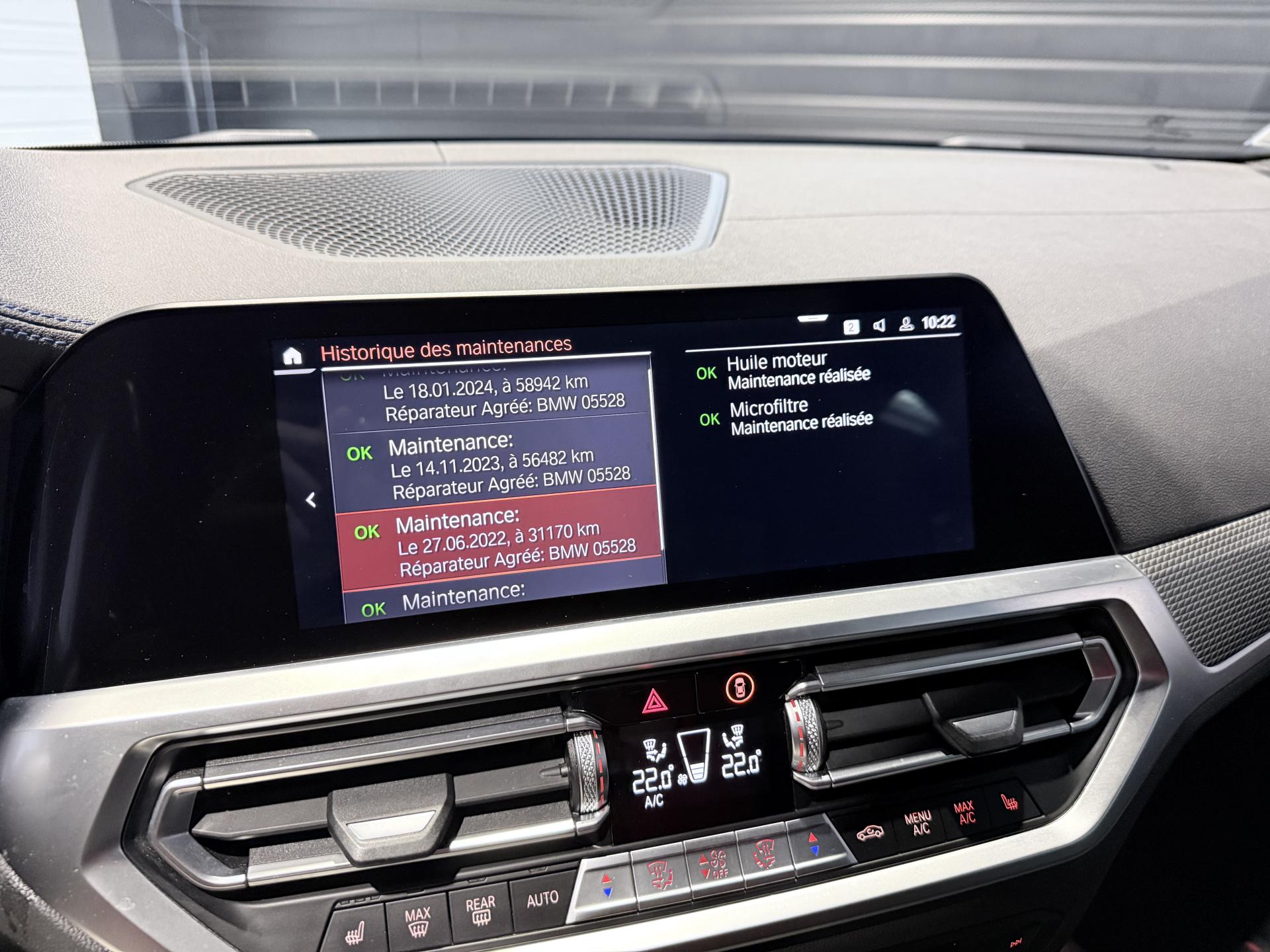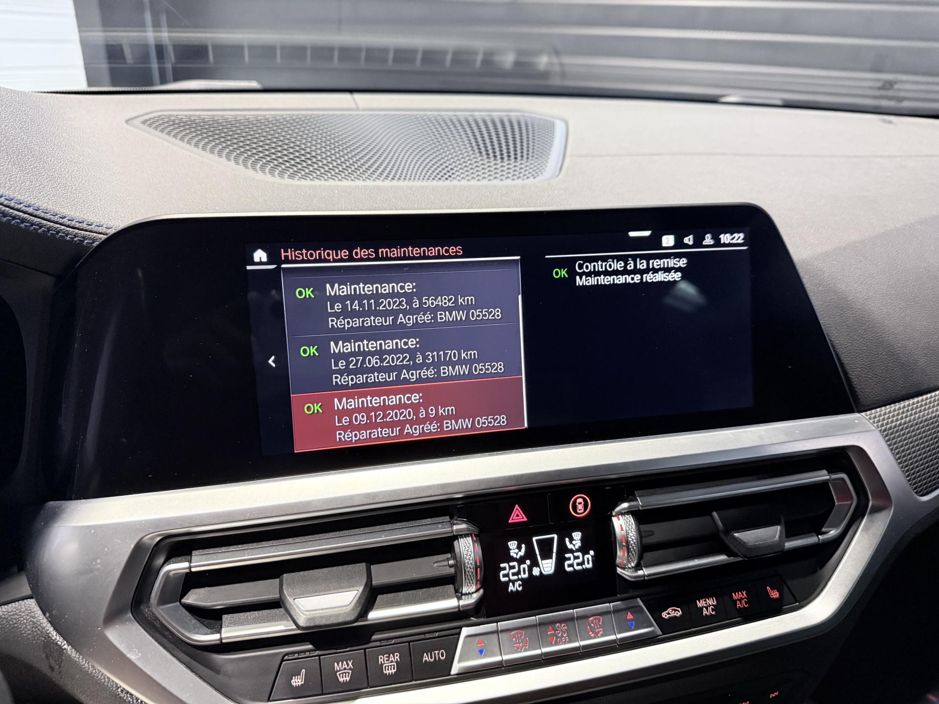 Nombreuses options : GPS, caméra de recul, Apple Carplay, radars avants et arrières de détection d'obstacles, Projecteurs Full LED directionnels ( 833 EUR ), Suspensions SelectDrive ( 541 EUR ), Planche de bord en Similicuir Sensatec ( 458 EUR ), Alarme antivol ( 416 EUR ), Connectivité avancée avec recharge sans fil par induction ( 383 EUR ), Vitrage calorifuge ( 341 EUR ), Sièges AV chauffants Assise et dossier des sièges AV chauffants, Intensité selon 3 niveaux, Fonction de chauffage rapide ( 333 EUR ), Shadow Line brillant BMW Individual étendu ( 216 EUR ), Feux de route anti-éblouissement ( 141 EUR ), Coques de rétroviseurs extérieurs en noir brillant ( 108 EUR ), Appel d'Urgence Intelligent (durée de vie de la voiture), BMW Live Cockpit Navigation Pro, Boîte de vitesses automatique Sport 8 rapports avec palettes au volant, Climatisation automatique 3 zones, Freins Sport M Etriers de freins bleus avec désignation M, Mesure individuelle de pression des pneumatiques, Régulateur de vitesse avec fonction de freinage et limiteur de vitesse, Rétroviseurs extérieurs rabattables électriquement / Rétroviseur gauche électrochrome, ...