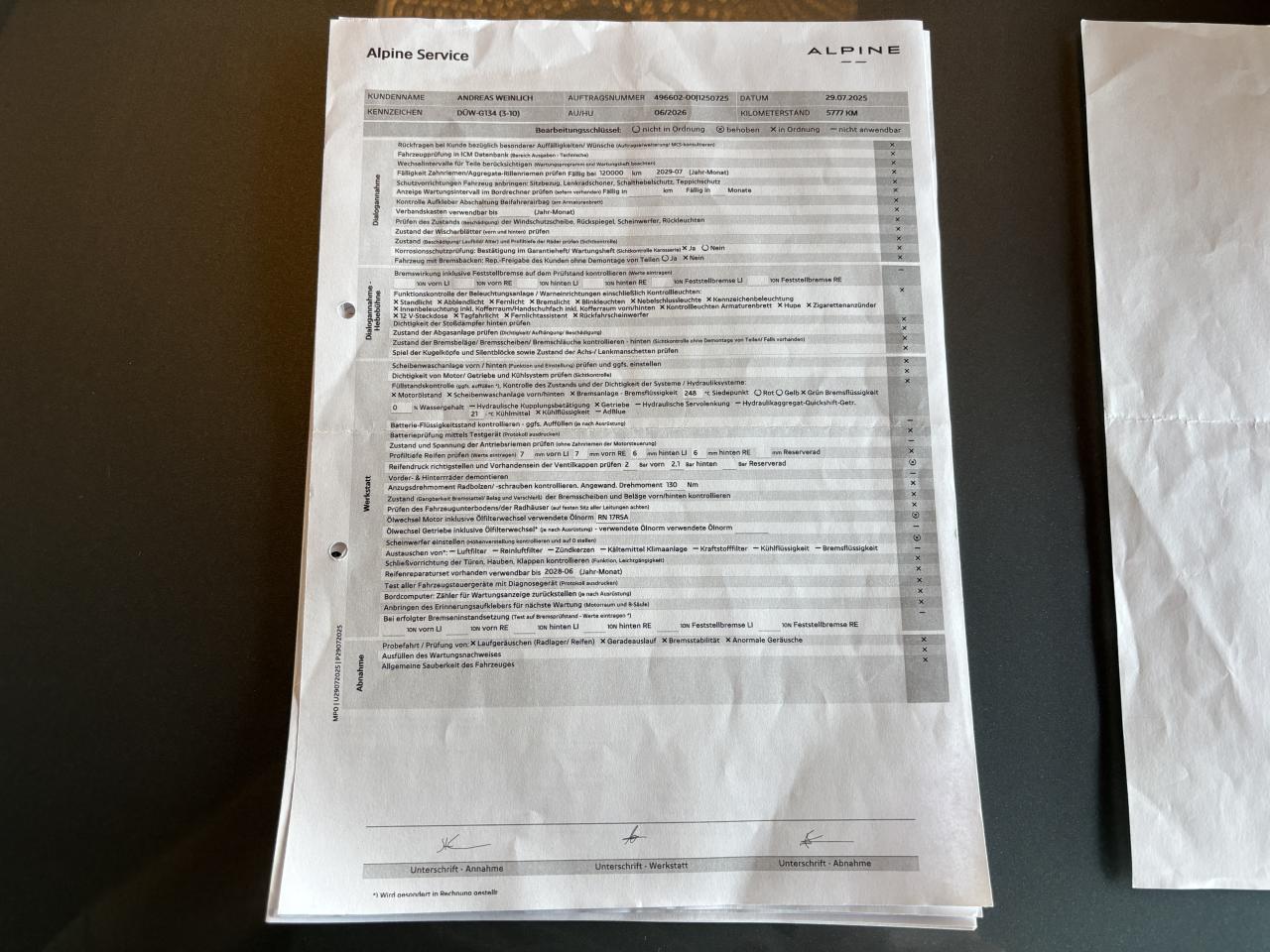 - 2ème entretien fait le 29/07/2025 à 5 777Km chez Alpine.