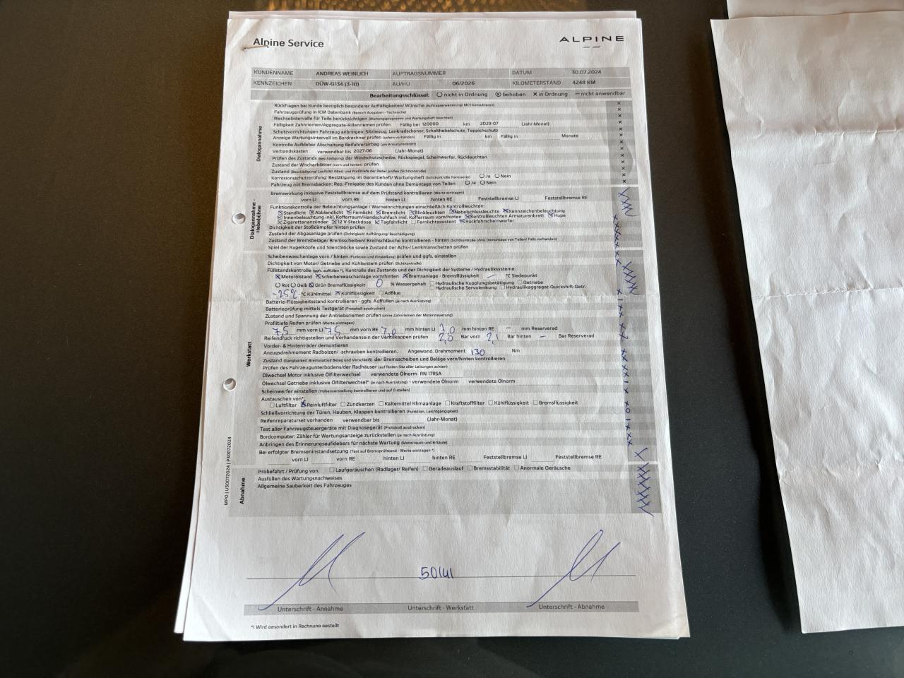 - 1er entretien fait le 30/07/2024 à 4 248Km chez Alpine.