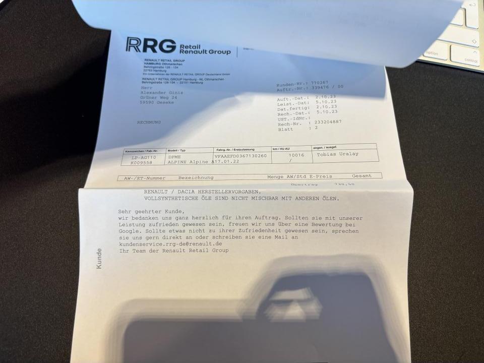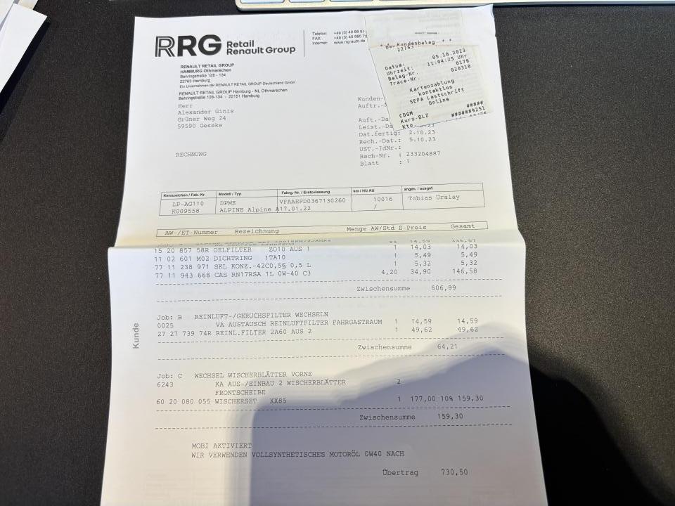 - 2ème entretien fait le 02/10/2023 à 10 016Km chez Renault/Alpine. ( Vidange moteur )