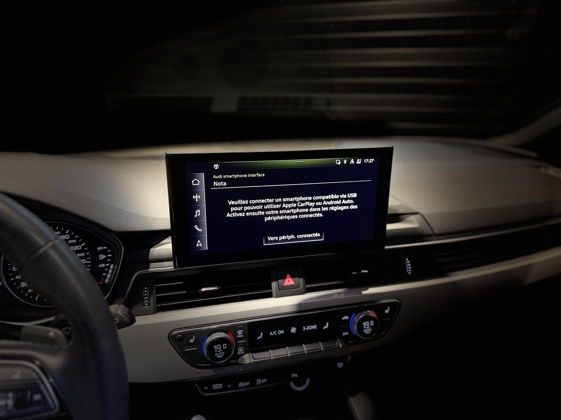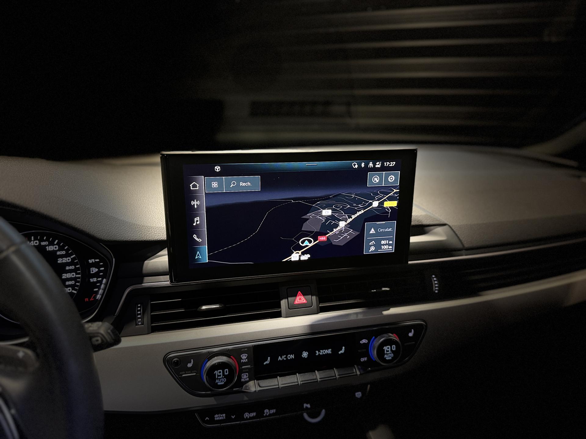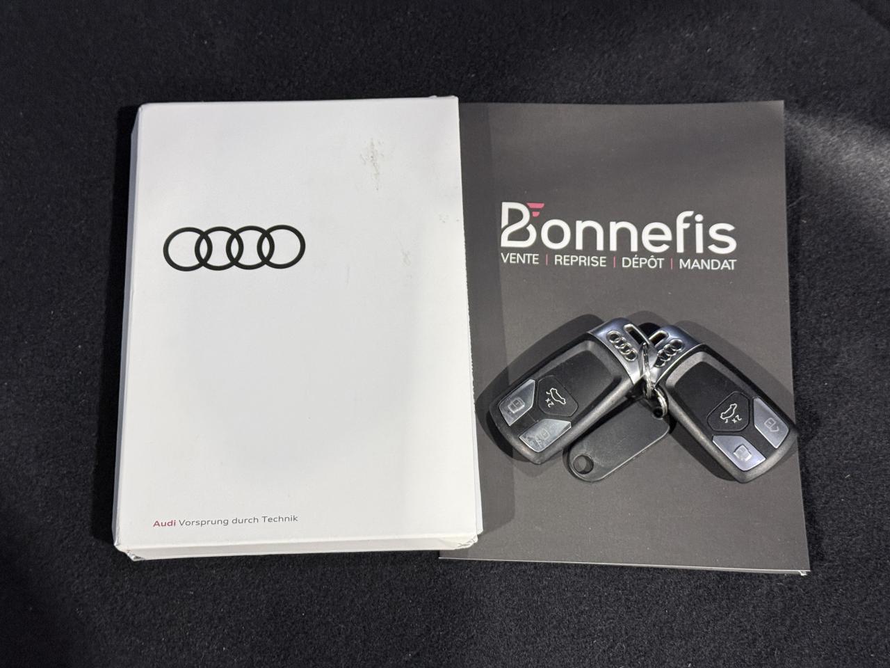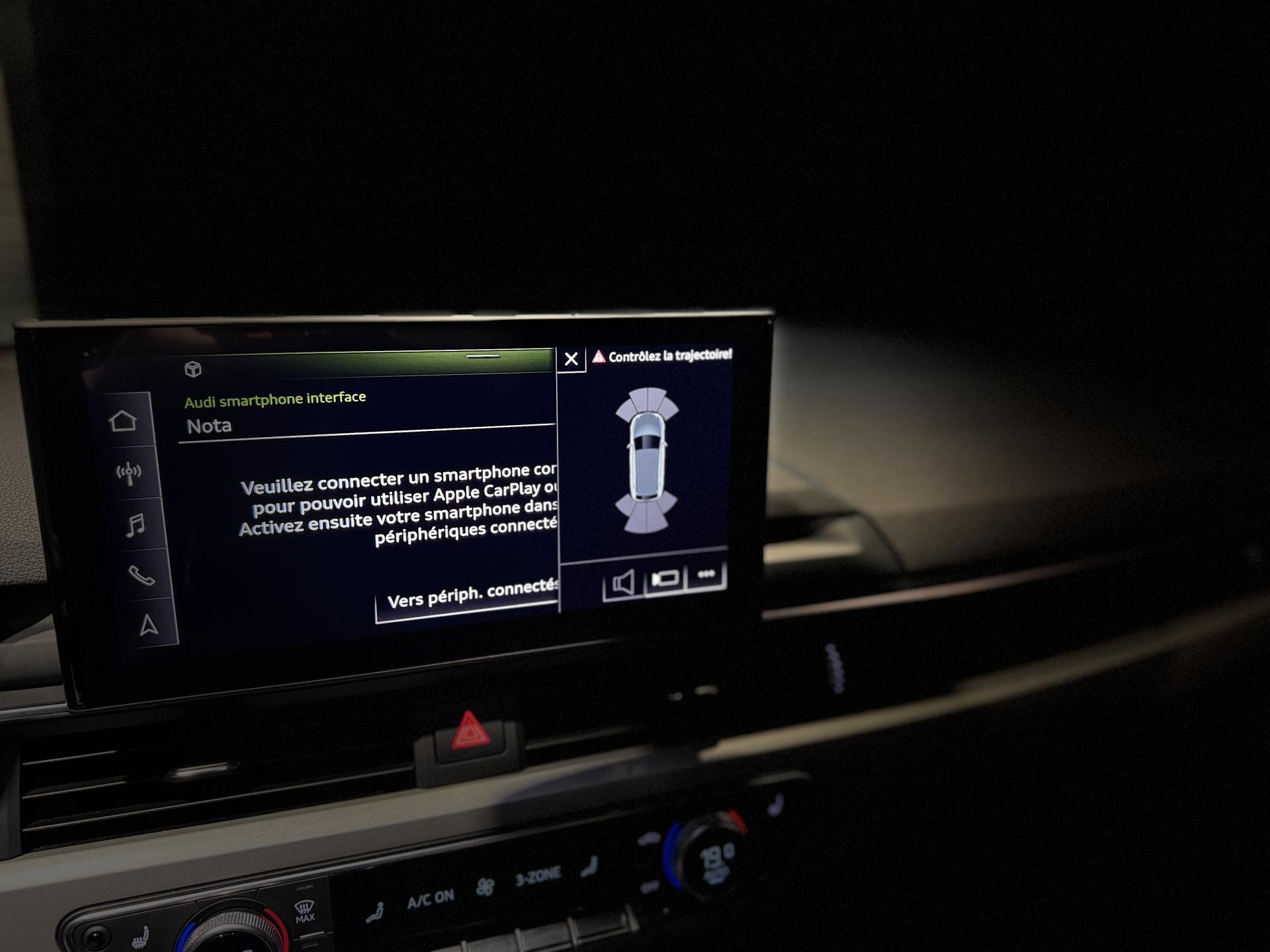 Nombreuses options : GPS, Apple Carplay, radars avants et arrières de détection d'obstacles, Navigation MMI plus avec MMI touch ( 2 075 € ), Sièges AV réglables électriquement avec fonction mémoire pour le siège conducteur + rétroviseurs extérieurs réglables et escamotables électriquement, jour/nuit automatique, dégivrants des deux côtés et buses de lave-g ( 1 275 € ), Crochet d'attelage, escamotable mécaniquement, avec déverrouillage électrique, col de cygne et boule en acier forgé ( 816 € ), Audi Phone Box avec charge du téléphone par induction (standard Qi) ( 483 € ), Sièges AV chauffants ( 391 € ), Airbags latéraux AR ( 366 € ), Audi Sound System ( 325 € ), Ciel de pavillon en tissu noir ( 258 € ), Volant en cuir style 3 branches avec multifonctions plus ( 154 € ), Stores pare-soleil manuels pour les vitres de portières AR ( 154 € ), Fixation pour sièges enfants ISOFIX pour le siège passager AV avec commande de sécurité enfant électrique sur les portières AR et commande de désactivation de l’airbag passager AV ( 83 € ), Augmentation de la capacité du réservoir d'AdBlue à 24 litres ( 58 € ), Adaptative Cruise Control incluant fonction Stop&Go avec assistant de conduite en embouteillage ( ACC / Active Cruise Control ), Audi Pre Sense Front avec Assistant d'évitement collision et Assistant changement direction, Caméra multifonction, Assistant d’efficacité prédictive, Assistant de feux de route, Pack Audi Lane Assist, Système de lecture des panneaux de signalisation par caméra, Coffre à ouverture et fermeture électriques, Rétroviseur intérieur sans encadrement jour/nuit automatique, Vitres athermiques, Miroirs de courtoisie éclairés, Commande intérieure des portières AV/AR éclairés, Eclairage d'ambiance de la console centrale AV, Eclairage d'ambiance des portières AV/AR, Eclairage dans la zone des pieds AV/AR, Eclairage des seuils de portes AV, Eclairage du porte-boissons AV, Eclairage périphérique dans les poignées de portières extérieures, ...