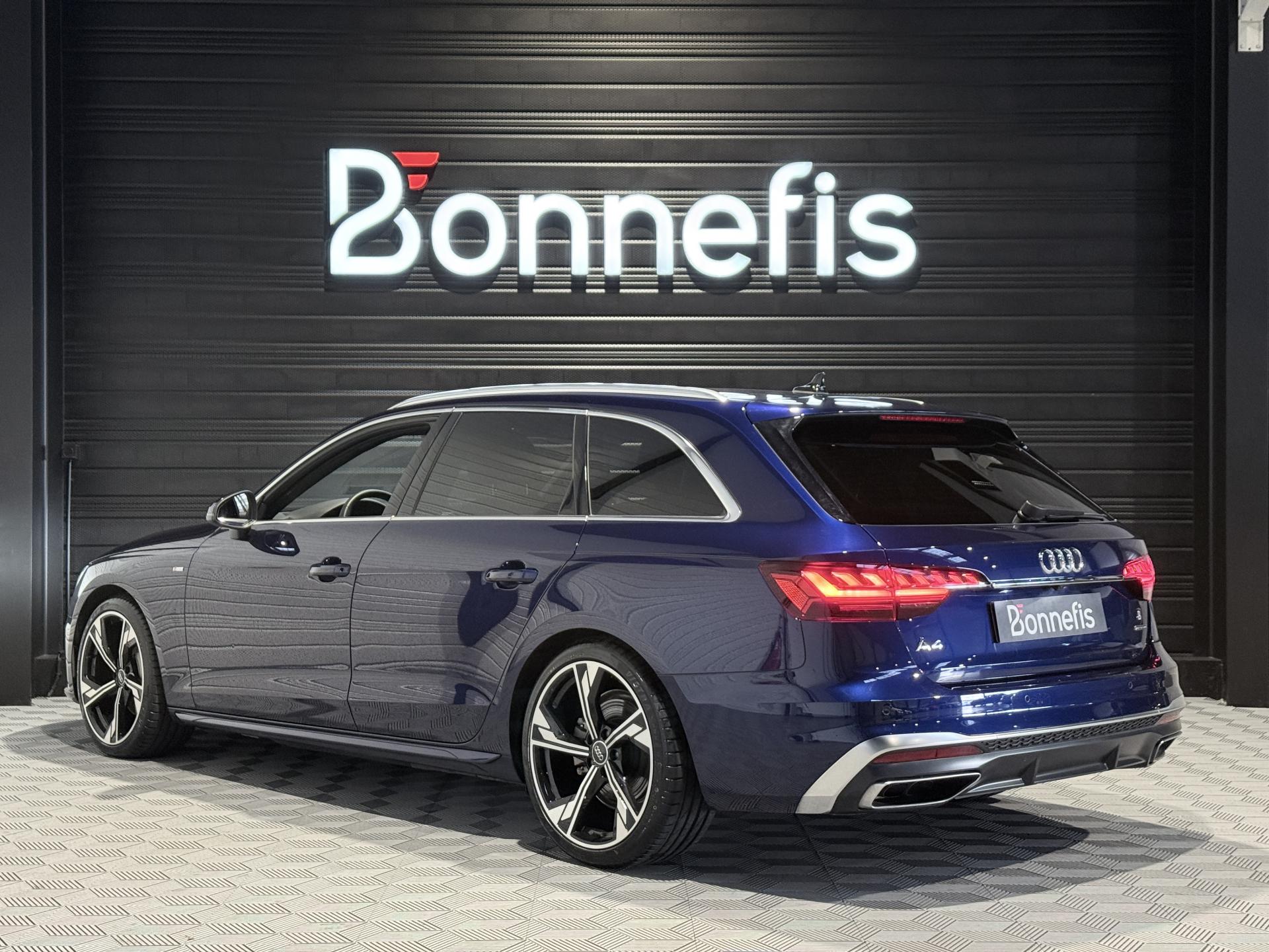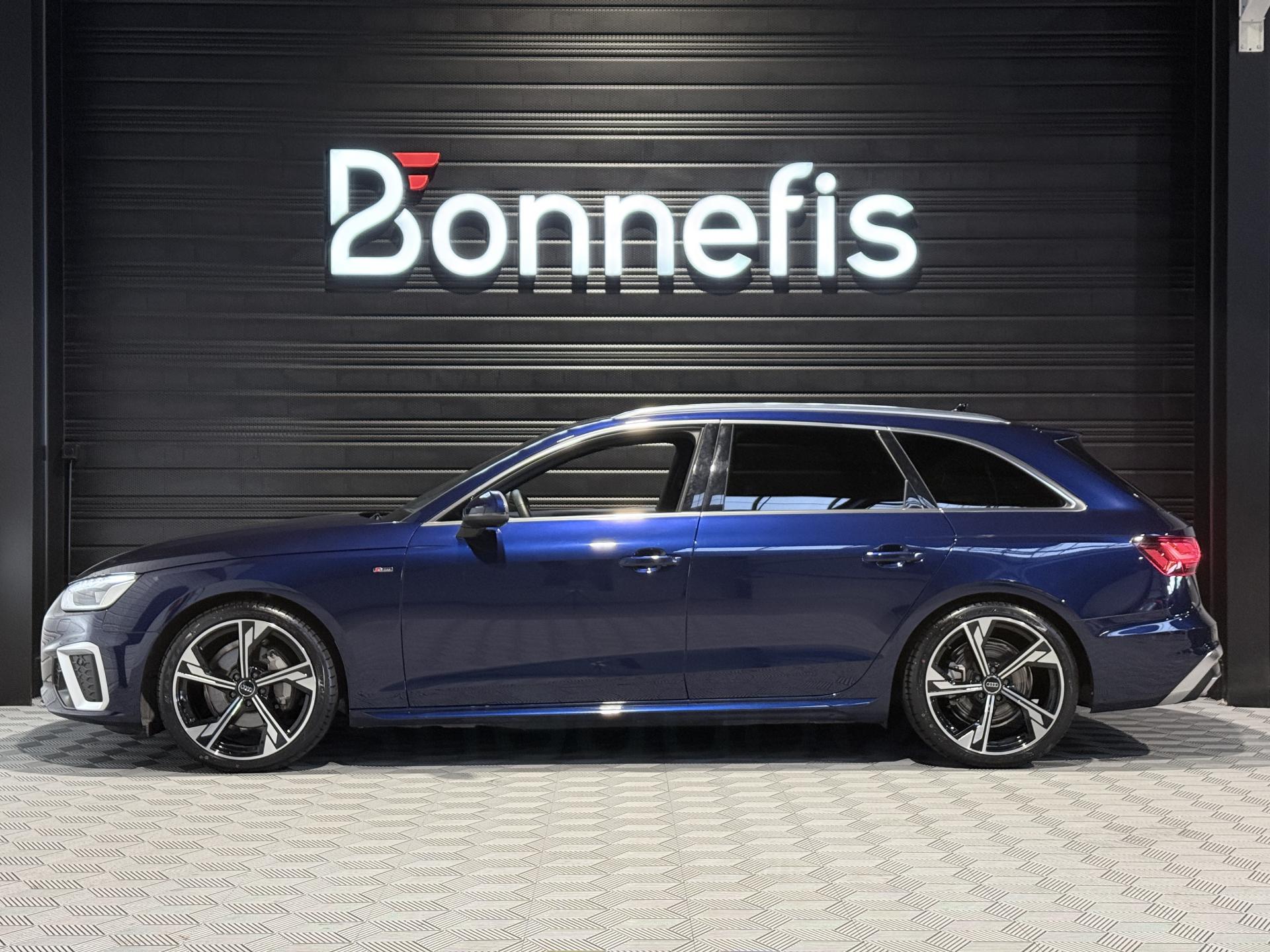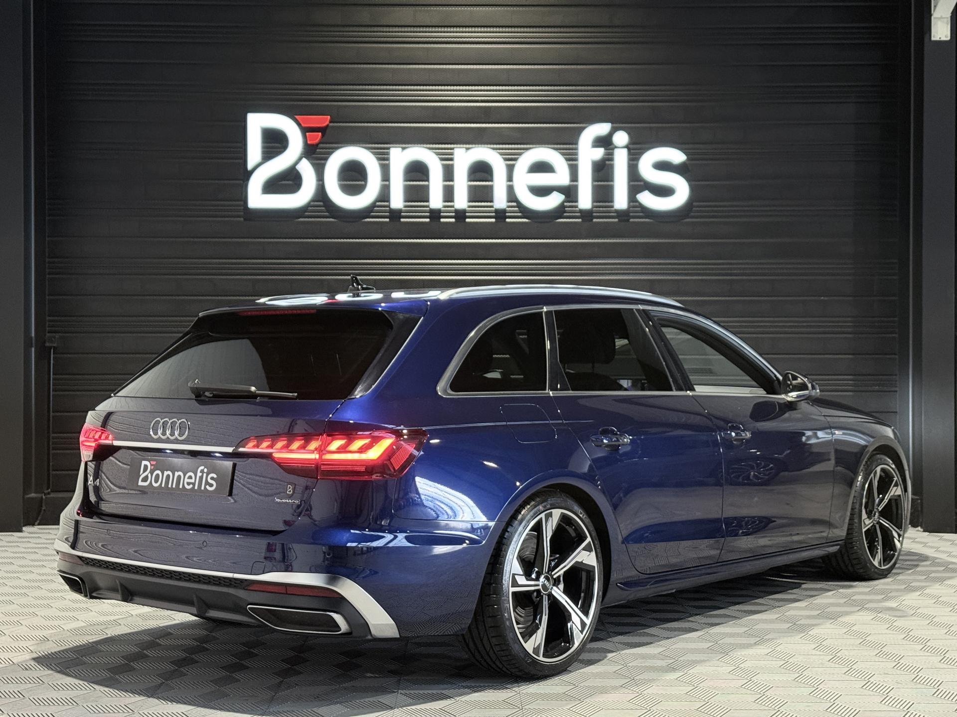 AUDI A4 AVANT 40 TDI 204Ch BVA S tronic 7 Quattro S line, extérieur Bleu métallisée ( bleu Navarre métallisée ) ( 883 EUR ), intérieur Noir ( sellerie Combinaison Cuir/Séquence S line ), 11 cv, 5 portes, première mise en circulation le 28/03/2024.