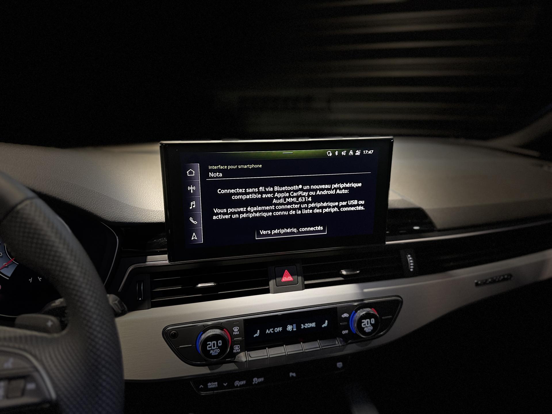 Nombreuses options : GPS, caméra de recul, Apple Carplay, radars avants et arrières de détection d'obstacles, Vitrage Privacy (vitres surteintées) ( 483 EUR ), Roue de secours temporaire pour vitesse maximale 80 km/h ( 125 EUR ), Audi Hold Assist ( 83 EUR ), Augmentation de la capacité du réservoir d'AdBlue à 24 litres ( 58 EUR ), Adaptative Cruise Control incluant fonction Stop&Go avec assistant de conduite en embouteillage, Assistant d'efficacité prédictive, Audi Active Lane Assist, Audi pre sense front incluant assistant d'évitement d'urgence et assistant de changement de direction, Audi smartphone interface (Apple CarPlay ou Google Android Auto), Audi Virtual cockpit plus combiné d?instruments entièrement numérique de 12,3" en résolution Full HD, affichage flexible et fonctionnel des informations en fonction des besoins du conducteur, intégration des fonctionnalités MMI dans le combin&, Caméra multifonction, Climatisation automatique confort 3 zones, Coffre à ouverture et fermeture électriques, Feux AR à LED avec scénarios de lumière dynamiques et clignotants dynamiques, Lave-phares, Phares Matrix LED avec scénarios de lumière dynamiques et clignotants dynamiques, Rétroviseur intérieur sans encadrement jour/nuit automatique, Vitres athermiques, ...