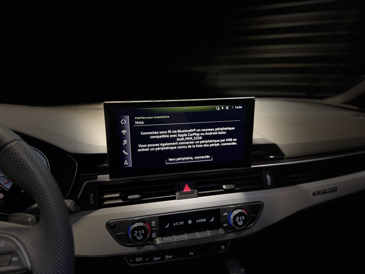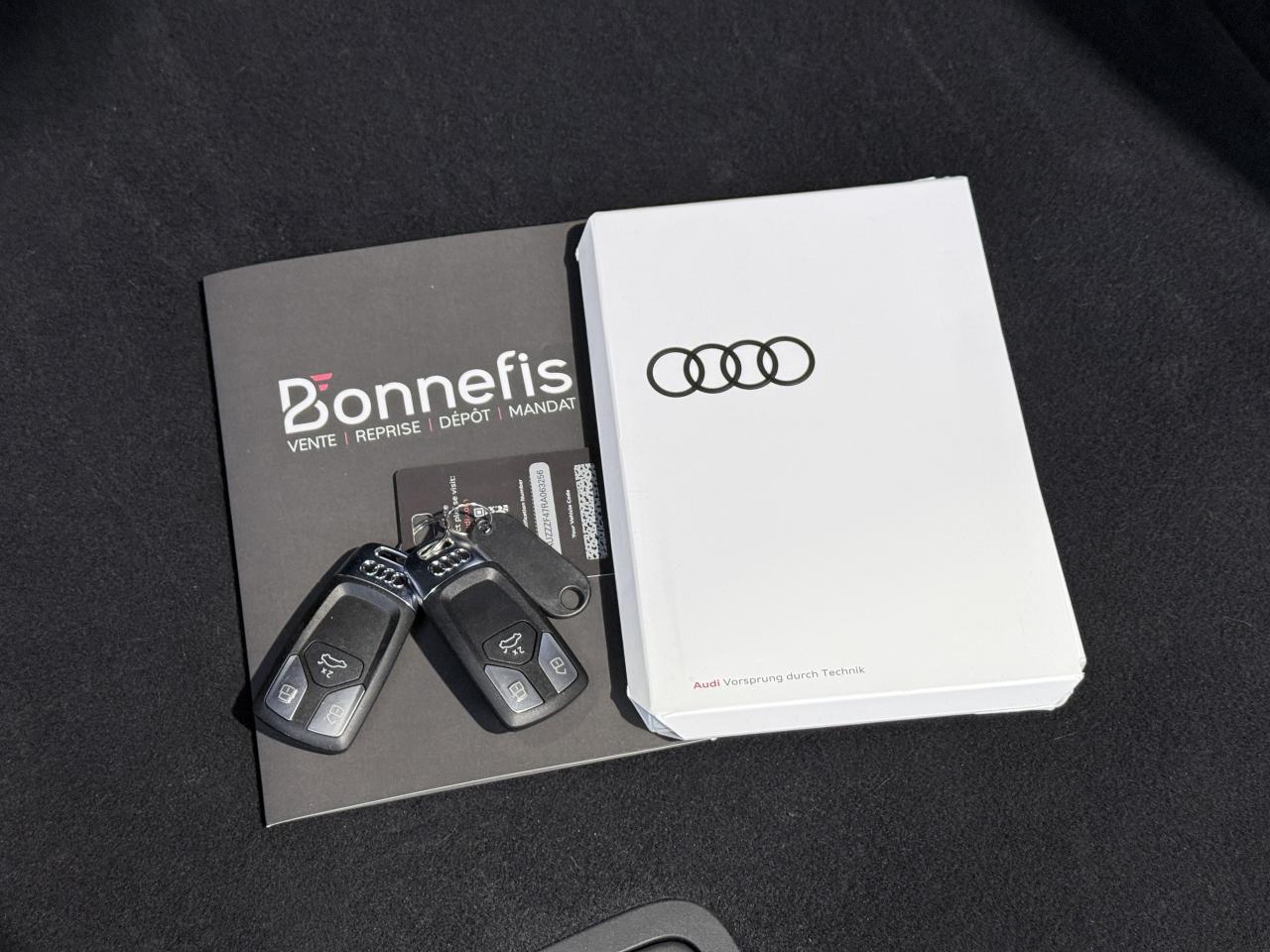 Nombreuses options : GPS, caméra de recul, Apple Carplay, radars avants et arrières de détection d'obstacles, vitrage Privacy vitres surteintées ( 483 € ), roue de secours temporaire pour vitesse maximale 80 km/h ( 125 € ), Audi Hold Assist ( 83 € ), augmentation de la capacité du réservoir d'AdBlue à 24 litres ( 58 € ), ACC / Active Cruise Control incluant fonction Stop&Go avec assistant de conduite en embouteillage, assistant d'efficacité prédictive, Audi Active Lane Assist, Audi pre sense front incluant assistant d'évitement d'urgence et assistant de changement de direction, Audi Virtual cockpit plus combiné d’instruments entièrement numérique de 12,3" Full HD, caméra multifonction, climatisation automatique confort 3 zones, coffre à ouverture et fermeture électriques, feux AR à LED avec scénarios de lumière dynamiques et clignotants dynamiques, lave-phares, phares Matrix LED avec scénarios de lumière dynamiques et clignotants dynamiques, vitres athermiques, ...