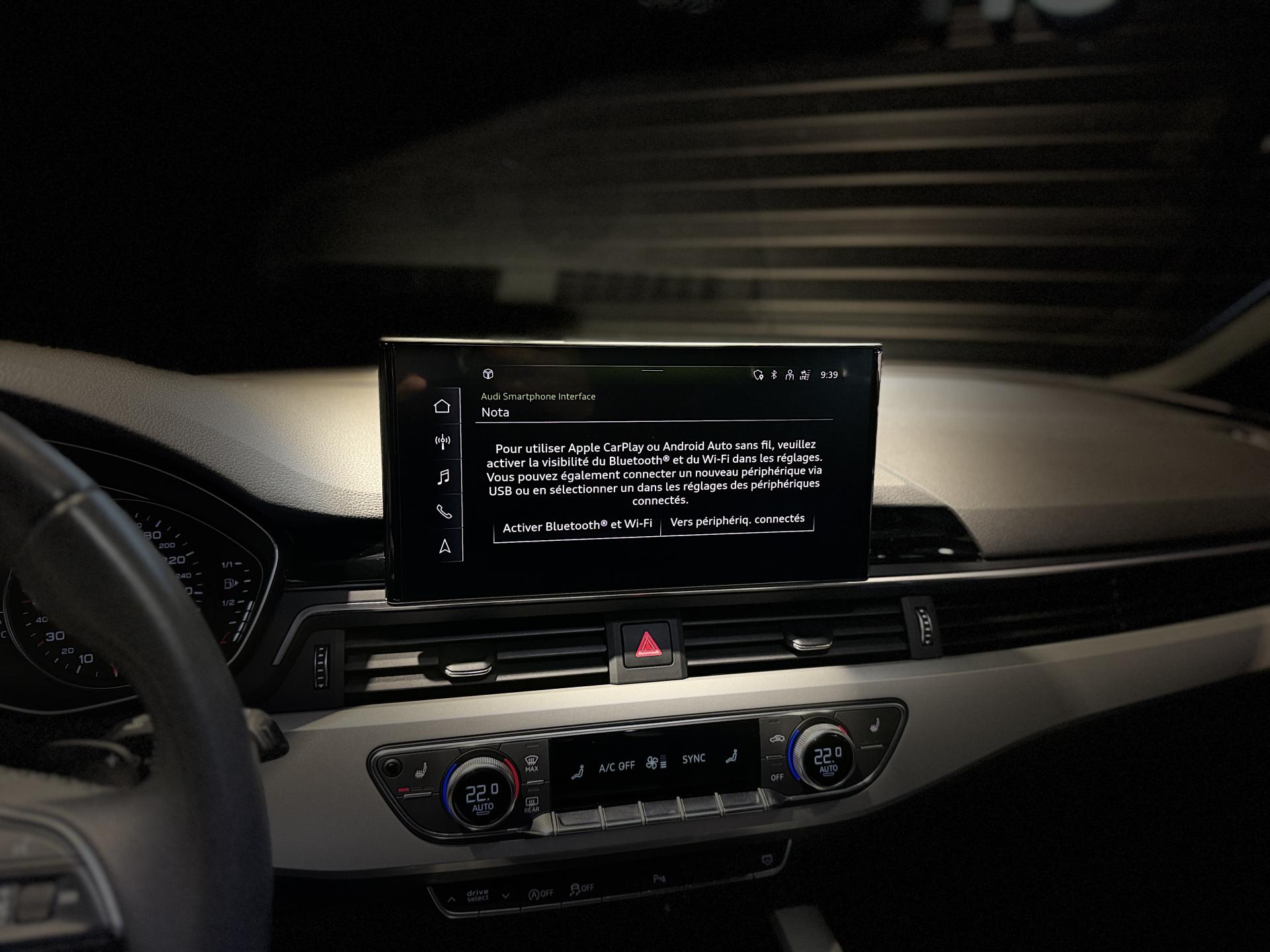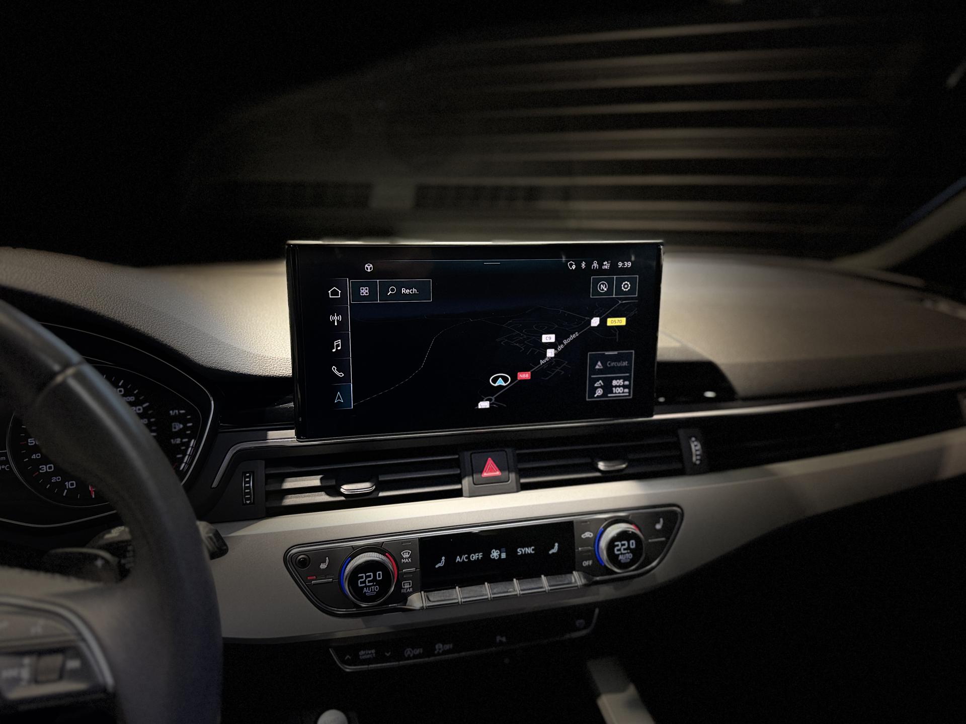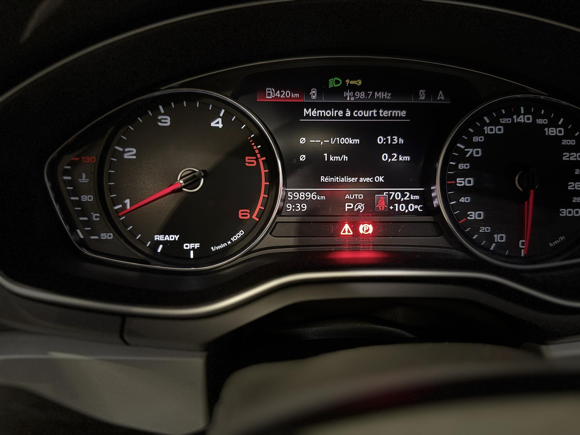 Nombreuses options : GPS, caméra de recul, Apple Carplay, radars avants et arrières de détection d'obstacles, navigation MMI plus avec MMI touch ( 2 075 € ), sellerie combinaison Cuir/similicuir ( 1 091 € ), Audi Phone Box avec charge du téléphone par induction ( 483 € ), sièges AV chauffants ( 391 € ), airbags latéraux AR ( 366 € ), Audi Sound System 10 HP ( 325 € ), ciel de pavillon en tissu noir ( 258 € ), volant en cuir style 3 branches avec multifonctions plus ( 154 € ), surfaces d’accentuation façon verre en noir ( 183 € ), fixation pour sièges enfants ISOFIX pour le siège passager AV ( 83 € ), augmentation de la capacité du réservoir d'AdBlue à 24 litres ( 58 € ), adaptative Cruise Control incluant fonction Stop&Go avec assistant de conduite en embouteillage ( ACC / Active Cruise Control ), Audi Side Assist, Audi Pre Sense AR incluant Audi Pre Sense Basic, Audi Pre Sense Front avec Assistant d'évitement collision et Assistant changement direction, Audi Parking System Plus, avertissement de sortie de voie, avertisseur de sortie du véhicule, assistant d’efficacité prédictive, assistant de sortie de stationnement perpendiculaire en marche AR, assistant de feux de route, système de lecture des panneaux de signalisation par caméra, éclairage d'ambiance de la console centrale AV, éclairage d'ambiance des portières AV/AR, éclairage dans la zone des pieds AV/AR, éclairage de la zone des pieds AV, éclairage des seuils de portes AV, éclairage du porte-boissons AV, éclairage intérieur, éclairage périphérique dans les poignées de portières extérieures, miroirs de courtoisie éclairés, commande intérieure des portières AV/AR éclairés, pack Audi Lane Assist, ...