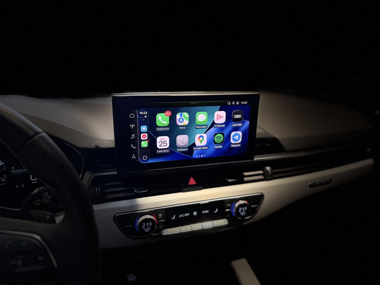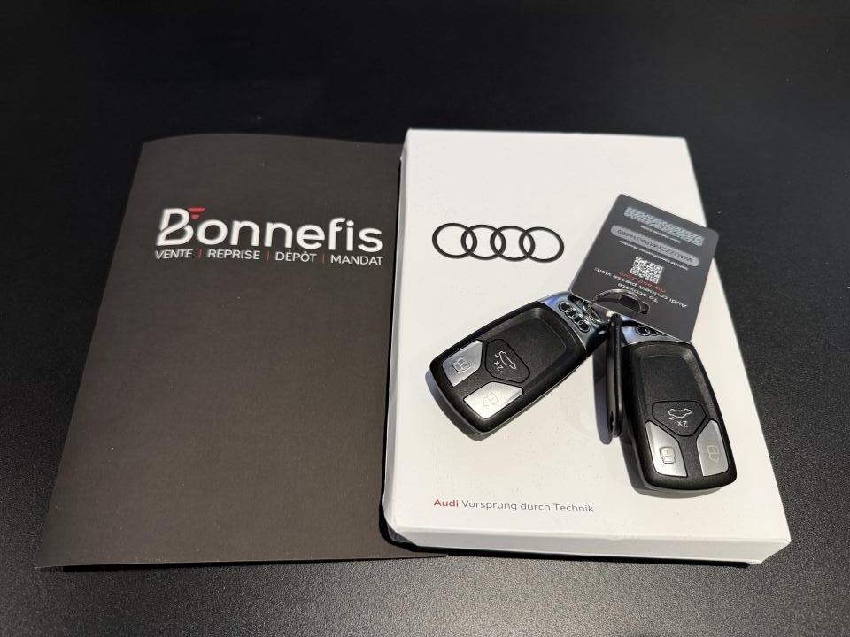 Nombreuses options : GPS, caméra de recul, Apple Carplay, radars avants et arrières de détection d'obstacles, vitrage Privacy (vitres surteintées) ( 483 € ), roue de secours temporaire pour vitesse maximale 80 km/h ( 125 € ), augmentation de la capacité du réservoir d'AdBlue à 24 litres ( 58 € ), Audi Hold Assist ( 83 € ), Audi Virtual Cockpit Plus combiné d’instruments entièrement numérique de 12,3" en résolution Full HD, affichage flexible et fonctionnel des informations en fonction des besoins du conducteur, intégration des fonctionnalités MMI dans le combiné, Adaptative Cruise Control incluant fonction Stop&Go avec assistant de conduite en embouteillage ( ACC / Active Cruise Control ), Audi Active Lane Assist, Audi Pre Sense city, Audi pre sense front incluant assistant d'évitement d'urgence et assistant de changement de direction, affichage de contrôle de pression des pneus, appel d'urgence et service Audi connect avec commande du véhicule, assistant d'efficacité prédictive, climatisation automatique confort 3 zones, coffre à ouverture et fermeture électriques, feux AR à LED avec scénarios de lumière dynamiques et clignotants dynamiques, phares Matrix LED avec scénarios de lumière dynamiques et clignotants dynamiques, lave-phares, rétroviseurs extérieurs réglables et escamotables électriquement, jour/nuit automatique, dégivrants des deux côtés et buses de lave-glaces dégivrantes, vitres athermiques, ...