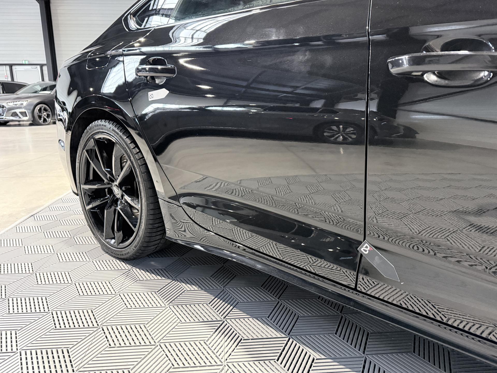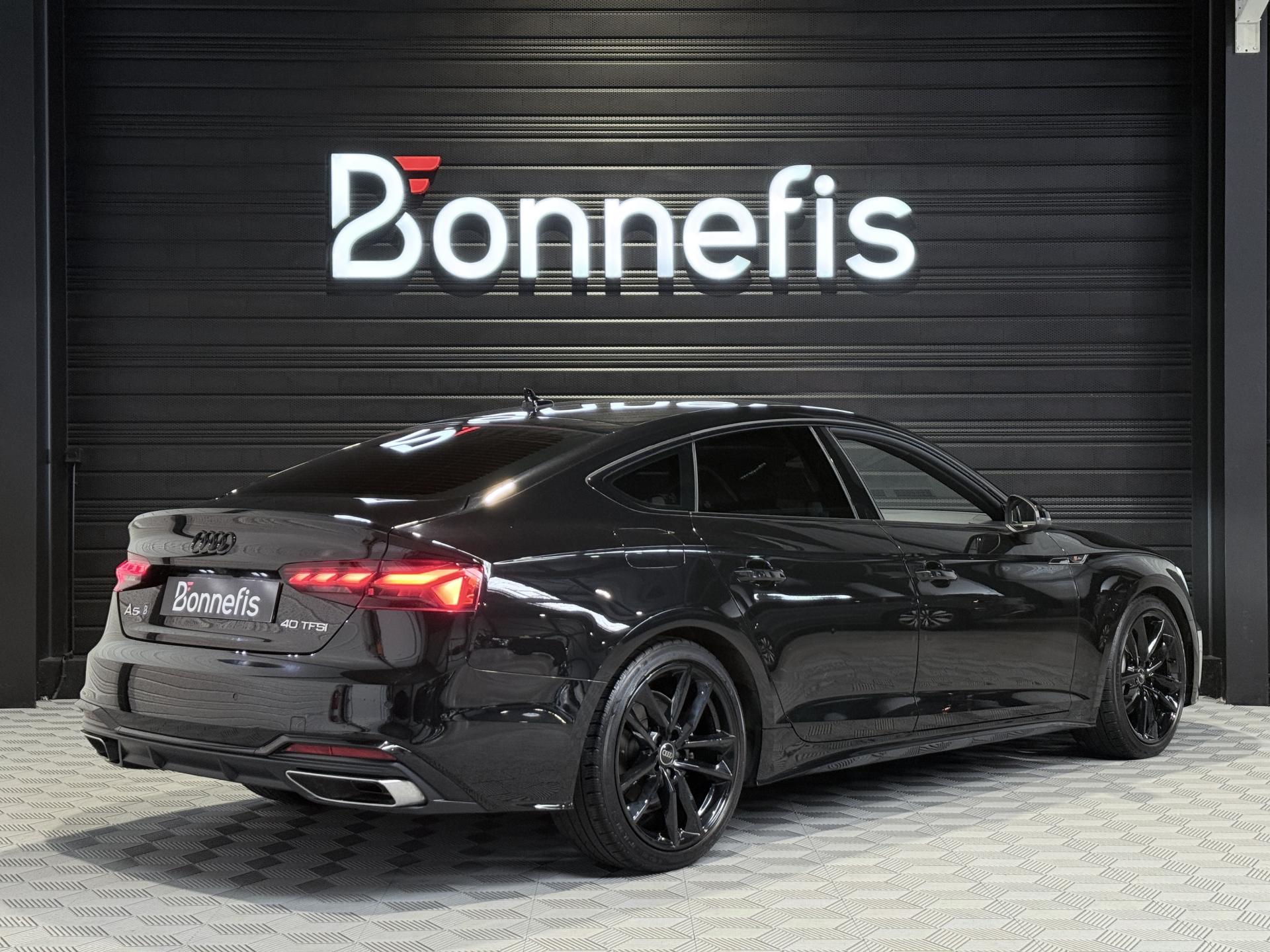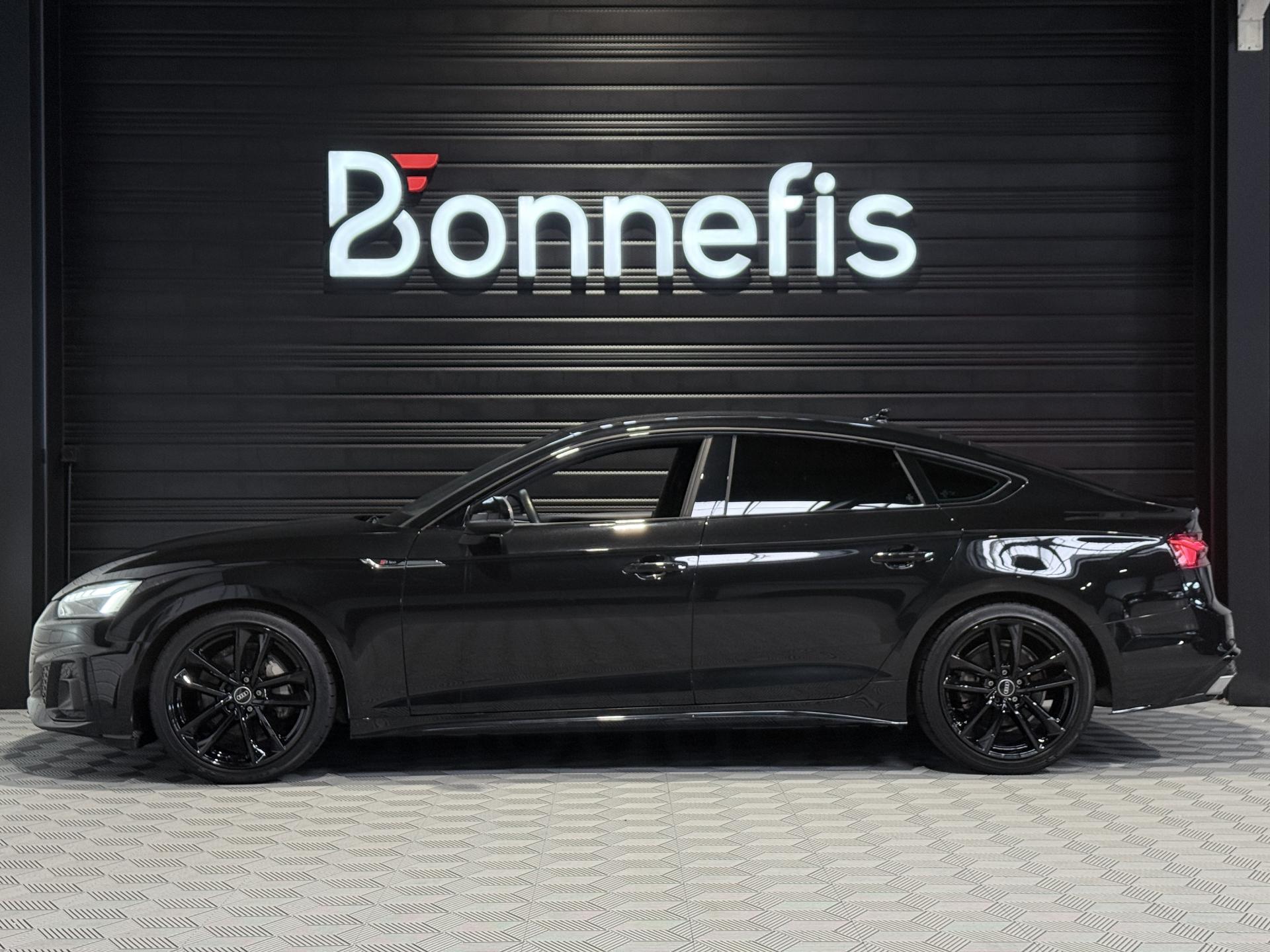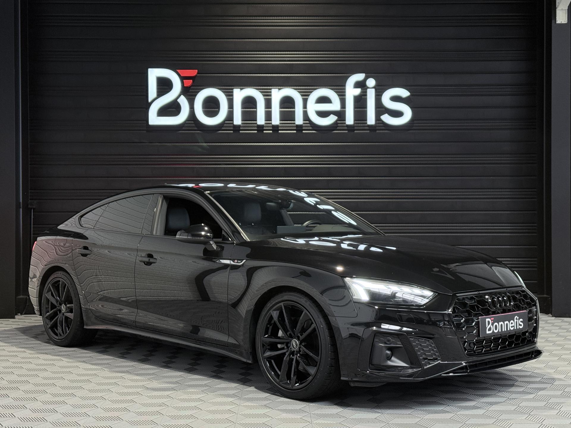 AUDI A5 Sportback 40 TFSI 204Ch BVA S tronic 7 S Line, extérieur Noir métallisée ( Noir Mythic ) ( 883 EUR ), intérieur Noir Sellerie Cuir Nappa Fin avec logo S dans le dossier des sièges AV ( 1 458 EUR ), 11 cv, 5 portes, première mise en circulation le 27/02/2023.