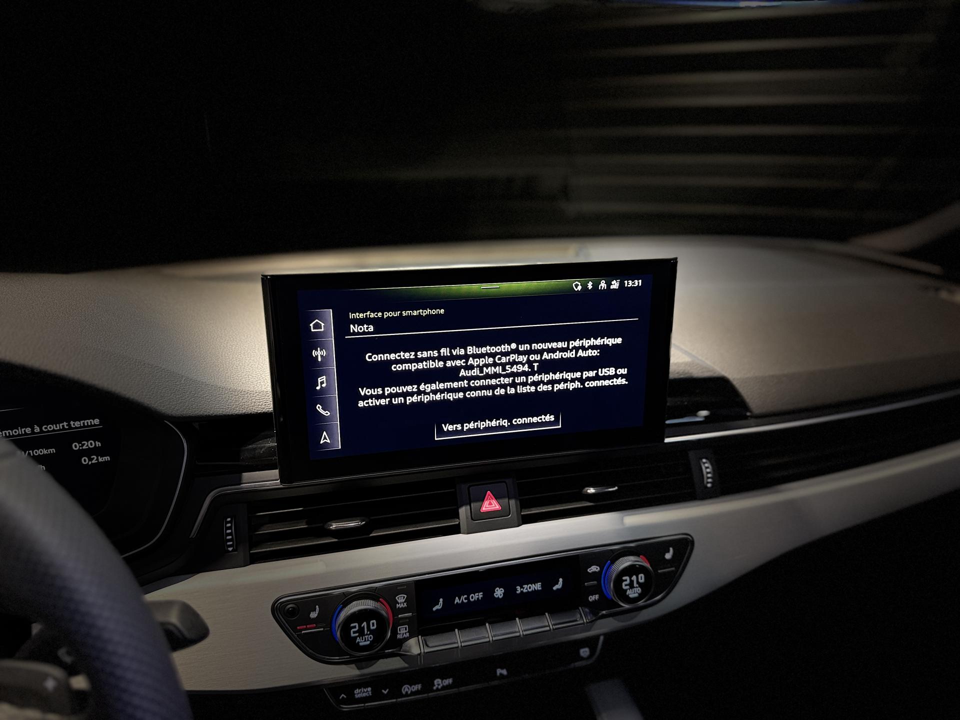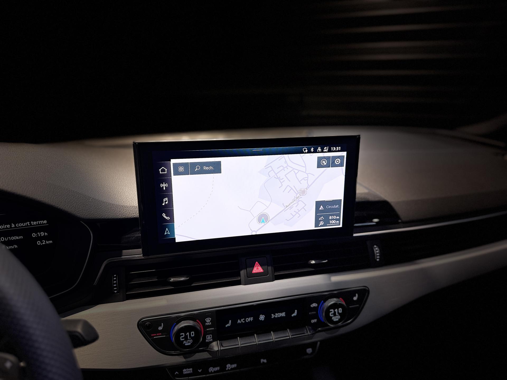Nombreuses options : GPS, caméra de recul, Apple Carplay, radars avants et arrières de détection d'obstacles, Clé confort + Alarme antivol avec fonction safelock ( 1 091 EUR ), Sièges AV réglables électriquement ( 791 EUR ), Audi Active Lane Assist: Assistant de maintien de trajectoire ( 500 EUR ), Sièges AV chauffants ( 391 EUR ), Lave phares haute pression ( 283 EUR ), Eléments de l'habitacle en simili-cuir ( 291 EUR ), Coques de rétroviseurs noir brillant ( 150 EUR ), Fixation pour sièges enfants Isofix avec commande de désactivation d'airbag passager AV ( 83 EUR ), Adaptative Cruise Control incluant fonction Stop&Go avec assistant de conduite en embouteillage, Assistant d'efficacité prédictive, Assistant de feux de route, Audi Active Lane Assist, Audi Pre Sense Front et basic incluant assistant d'évitement d'urgence, Audi Side Assist : Assistant de changement de voie, Audi Singleframe: calandre noir, Audi Virtual Cockpit Plus, Caméra multifonction, Ciel de pavillon en tissu noir, Climatisation automatique confort 3 zones, Coffre à ouverture et fermeture électriques, Rétroviseurs extérieurs réglables et escamotables électriquement, jour/nuit automatique, dégivrants des deux côtés et buses de lave-glaces dégivrantes, Système de lecture des panneaux de signalisation par caméra, Touche extérieure noire au niveau de l?Audi singleframe, des baguettes décoratives sur les vitres latérales et du pare-chocs AV et AR, Vitres athermiques, ...