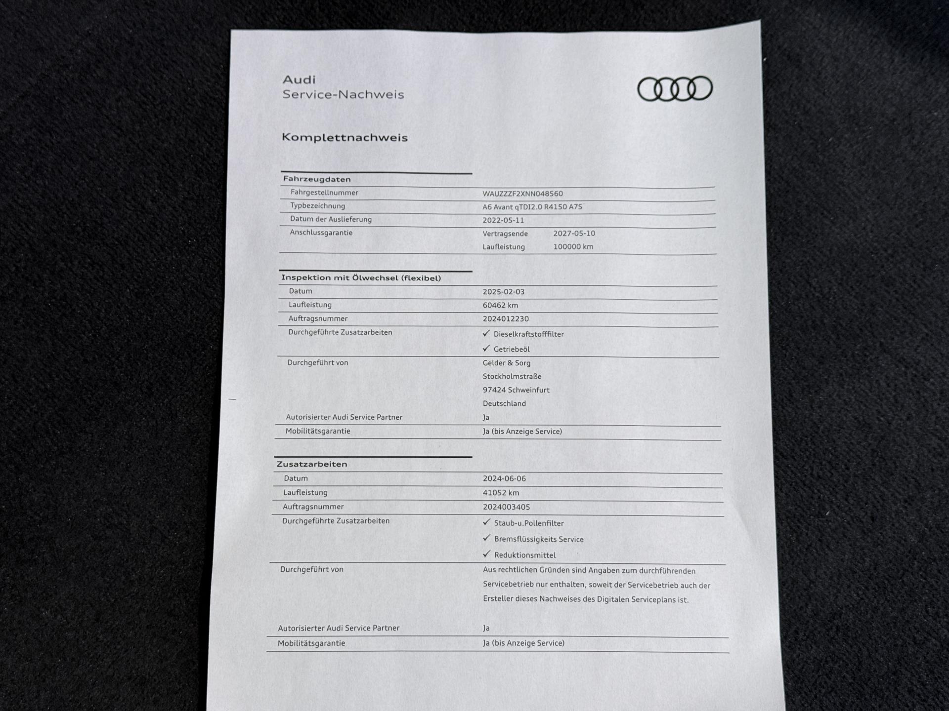 - 4ème entretien fait le 03/02/2025 à 60 462Km chez Audi. ( Vidange moteur + filtre à carburant + vidange de boîte )