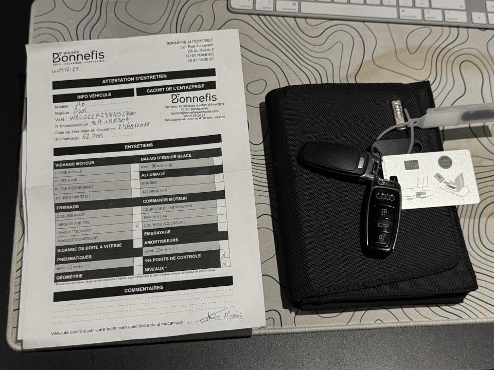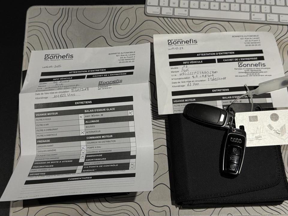 Nombreuses options : GPS, caméra de recul, Apple Carplay, radars avants et arrières de détection d'obstacles, Navigation MMI plus avec MMI touch response ( 1 791 € ), Clé confort avec déverrouillage du coffre par capteur (sans Safelock) ( 812 € ), Crochet d'attelage ( 791 € ), Climatisation automatique confort 4 zones ( 791 € ), Vitrage Privacy (vitres AR surteintées) ( 458 € ), Réception radio numérique DAB ( 416 € ), Sièges AV chauffants ( 375 € ), Essuie-glace adaptatifs avec buses de lavage intégrées dégivrants ( 354 € ), Pack Éclairage Ambiance LED multicolore ( 250 € ), Clé Audi connect ( 166 € ), Rétroviseurs extérieurs réglables, dégivrants et rabattables électriquement avec fonction jour/nuit automatique ( 104 € ), Audi phone box ( 500 € ), Projecteurs Matrix LED, Assistant de conduite adaptatif incluant assistant de conduite en embouteillage et assistant de chaussée étroite, Assistant de conduite adaptatif incluant assistant de freinage d'urgence, Assistant de maintien de la vitesse adaptatif, Assistant de changement de direction, Assistant d'efficience, Assistant d’évitement d’urgence, Caméra multifonction pour système d'assistance à la conduite, Caméra de reconnaissance et lecture des panneaux de circulation, Pare-brise en verre feuilleté athermique...