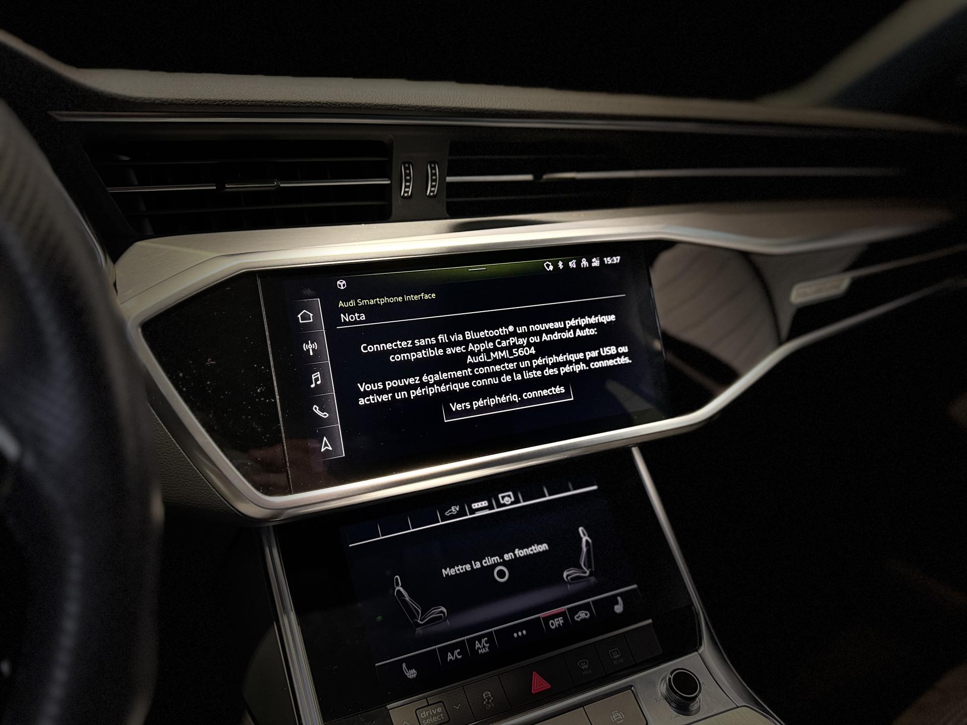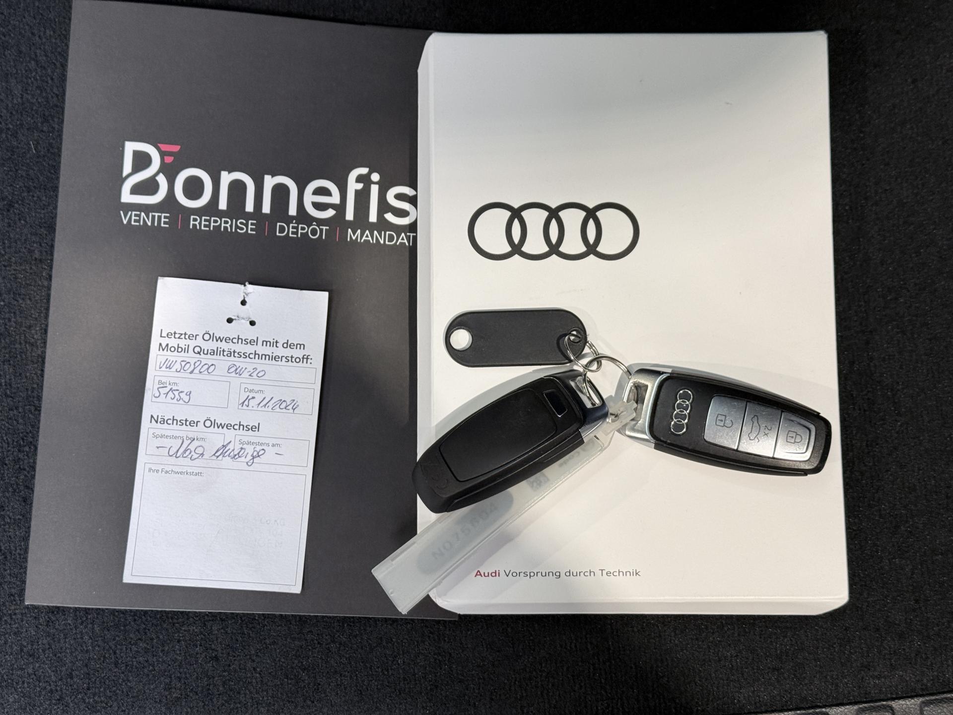 Nombreuses options : GPS, caméra de recul, Apple Carplay, radars avants et arrières de détection d'obstacles, Crochet d’attelage ( 791 € ), Phares Matrix LED, Audi phone box ( 500 € ), Sièges AV chauffants ( 375 € ), Essuie-glace adaptatifs avec buses de lavage intégrées ( 354 € ), Rétroviseurs extérieurs réglables, dégivrants et rabattables électriquement avec fonction rabat automatique côté passager AV, fonction jour et nuit automatique des deux côtés et clignotants à LED intégrés ( 104 € ), assistant de freinage d’urgence et assistant de maintien de la vitesse adaptatif, Assistant d’évitement d’urgence, Assistant d’efficience, Assistant de changement de direction, Reconnaissance par caméra des panneaux de signalisation, Audi Virtual Cockpit, Climatisation automatique confort 4 zones, Sellerie mixte Alcantara Fréquence/Cuir, Vitres athermiques, Pare-brise en verre de sécurité, 6 profils de couleur prédéfinis, 1 profil de couleur supplémentaire interactif et personnalisable parmi une gamme de 30 couleurs, Réglage séparé des teintes lumineuses de contours et d’ambiance, Éclairage d’ambiance sur la console centrale, Éclairage de contour avec inscription quattro éclairée ou anneaux Audi éclairés sur le tableau de bord côté passager AV, Éclairage de contour de la console centrale AV, Éclairage de contour des portières AV et AR, Éclairage des vide-poches de portières AV et AR, ...