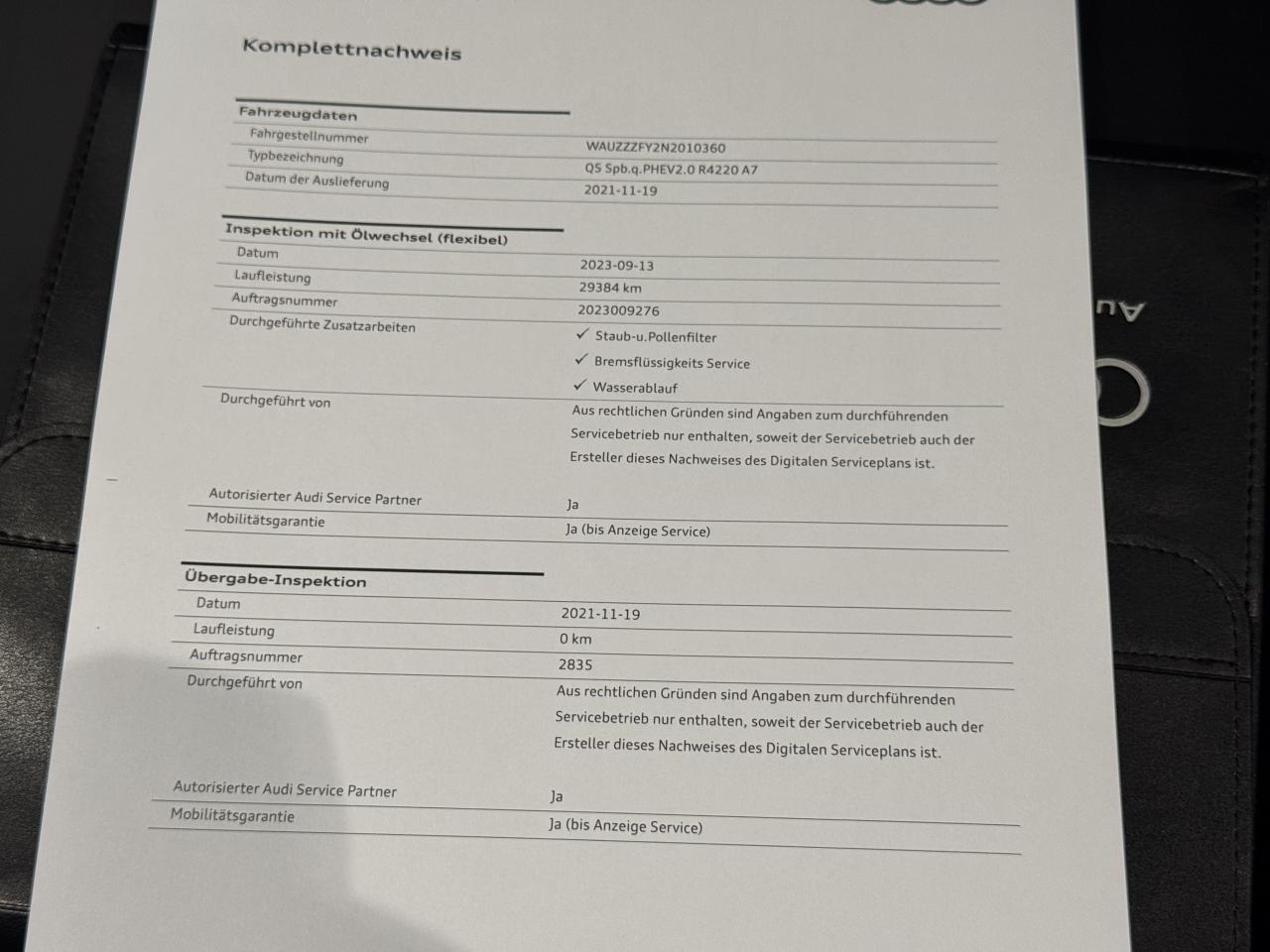 - 2ème entretien fait le 13/09/2023 à 29 384Km chez Audi. ( Vidange moteur + filtre à pollen et poussière + liquide de frein )