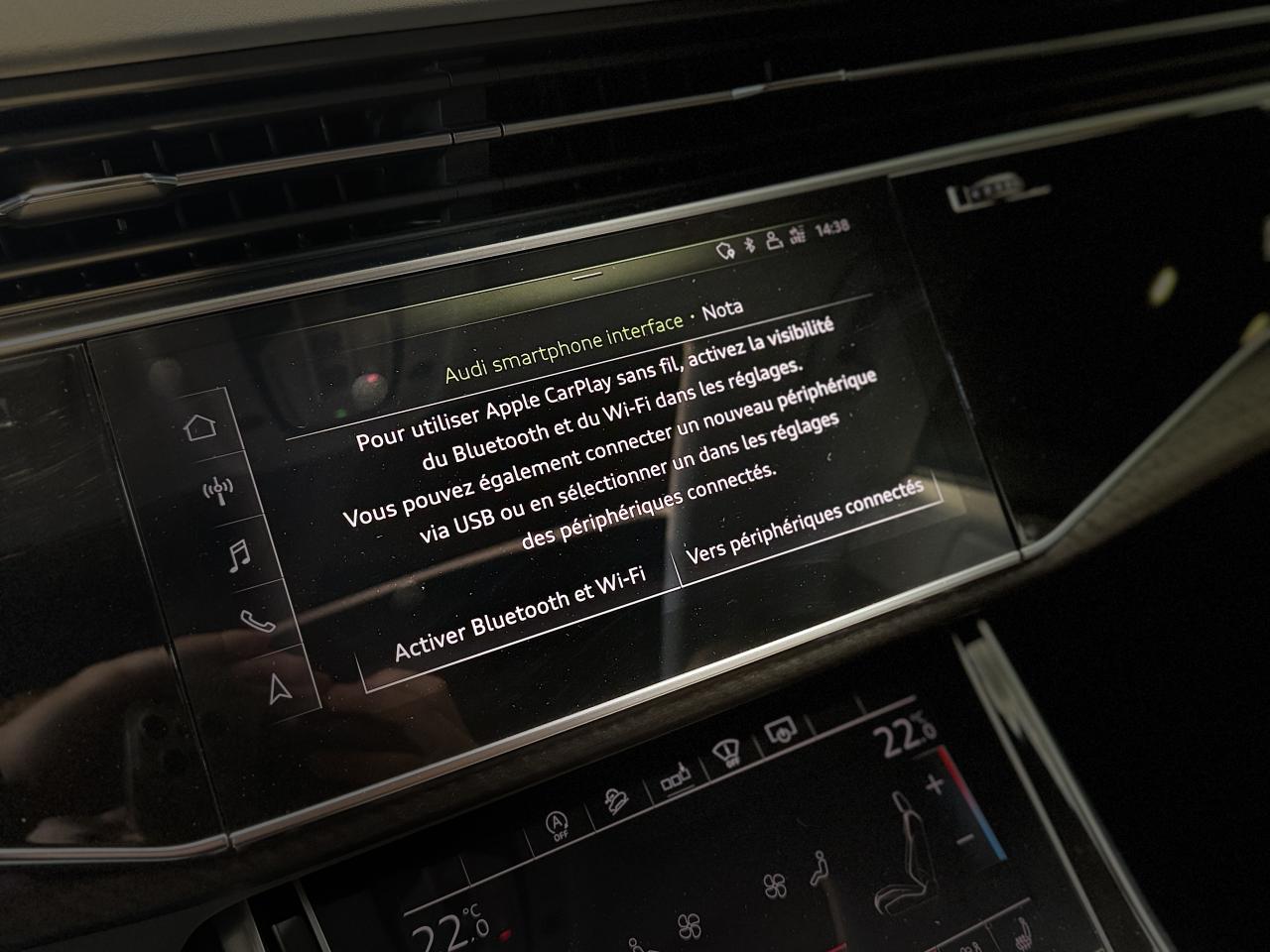 Nombreuses options : GPS, caméra périphériques 360°, Apple CarPlay, radars avants et arrières de détection d'obstacles, Jantes en alu coulé Audi Sport style étoile à 5 branches en V, en Noir Anthracite Brillant, tournées brillantes en 10Jx22" ( 4 175 € ), Assistant de vision nocturne ( 2 066 € ), Chauffage/ventilation stationnaire ( 1 708 € ), Toit panoramique en verre ( 1 566 € ), Projecteurs HD Matrix LED ( 1 666 € ), Affichage tête haute ( 1 375 € ), Sellerie combinée Cuir Valcona/Cuir Cricket ( 1 333 € ), Sièges AV ventilés ( 1 083 € ), Sièges à Contours Individuels ( 1 075 € ), Adaptive Air Suspension ( 941 € ), Climatisation automatique Confort 4 zones AV/AR ( 791 € ), Clé confort avec déverrouillage du coffre commandé par capteur y compris cache-bagages électrique (sans safelock) ( 700 € ), Applications décoratives en bois d'Eucalyptus ondulé Gris Basalte Naturel ( 625 € ), Rideau pare-soleil électrique pour la lunette AR + rideaux manuels pour les vitres de portières AR ( 591 € ), Vitrage acoustique pour les vitres latérales, meilleure isolation phonique grâce au double vitrage ( 500 € ), Audi phone box ( 500 € ), Vitres AR surteintées (Vitrage Privacy) ( 450 € ), Sièges AV chauffants ( 400 € ), Rampes de pavillon Noires ( 400 € ), Airbags latéraux AV/AR incluant système d’airbags de tête ( 400 € ), Essuie-glace adaptatifs avec buses de lavage intégrées ( 416 € ), Pare-brise athermique dégivrant/acoustique ( 316 € ), Lave-phares haute pression ( 308 € ), Touches de commande façon verre en noir avec réponse haptique incluant style aluminium étendu ( 291 € ), Eclairage au sol avec projection de logo par technologie LED ( 250 € ), Banquette AR plus ( 216 € ), Appuie-tête variables pour les sièges AV ( 150 € ), Filet de séparation ( 91 € ), Pare-soleil extensible ( 66 € ), Bang & Olufsen Premium Sound System avec son en 3D ( 1 133 € ), Direction intégrale dynamique ( 1 133 € ), Caméra de reconnaissance et lecture des panneaux de circulation, Caméra multifonction pour systèmes d'assistance à la conduite, Audi parking system plus avec protection latérale active, Audi pre sense rear, Audi Virtual Cockpit, Alerte de trafic transversal AR, Assistant de croisement, Assistant de changement de voie, Avertissement de franchissement de ligne incluant assistant de freinage d’urgence, Avertisseur de sortie du véhicule, Pack Éclairage intérieur à LED, Eclairage de contour de la console centrale, Moulures de seuil de portes éclairées avec insert en alu à l’AV/AR et inscription "S" à l'AV, Barrette du diffuseur en Gris Platine mat, Baguette des feux AR en chrome, Baguettes décoratives encadrant les vitres latérales, Diffuseur AR en Noir Titane mat, Extensions de bas de caisse spécifiques S, laquées dans la couleur de carrosserie avec inserts en Gris Platine mat, Inscription S line sur les ailes AV, Masque Singleframe en Gris Platine mat, Calandre Audi Singleframe, Calandre en Noir Titane avec cadre en chrome, Pare-chocs AV/AR noirs, Pare-chocs spécifiques S AV/AR avec inserts spécifiques S line, Peinture intégrale unie, Prises d’air latérales à l’AV en Noir Titane mat, Protection seuil de chargement en acier inoxydable, Protections anti-encastrement à l'AV et à l'AR en Gris Platine mat, Rampes de pavillon Noires, ...