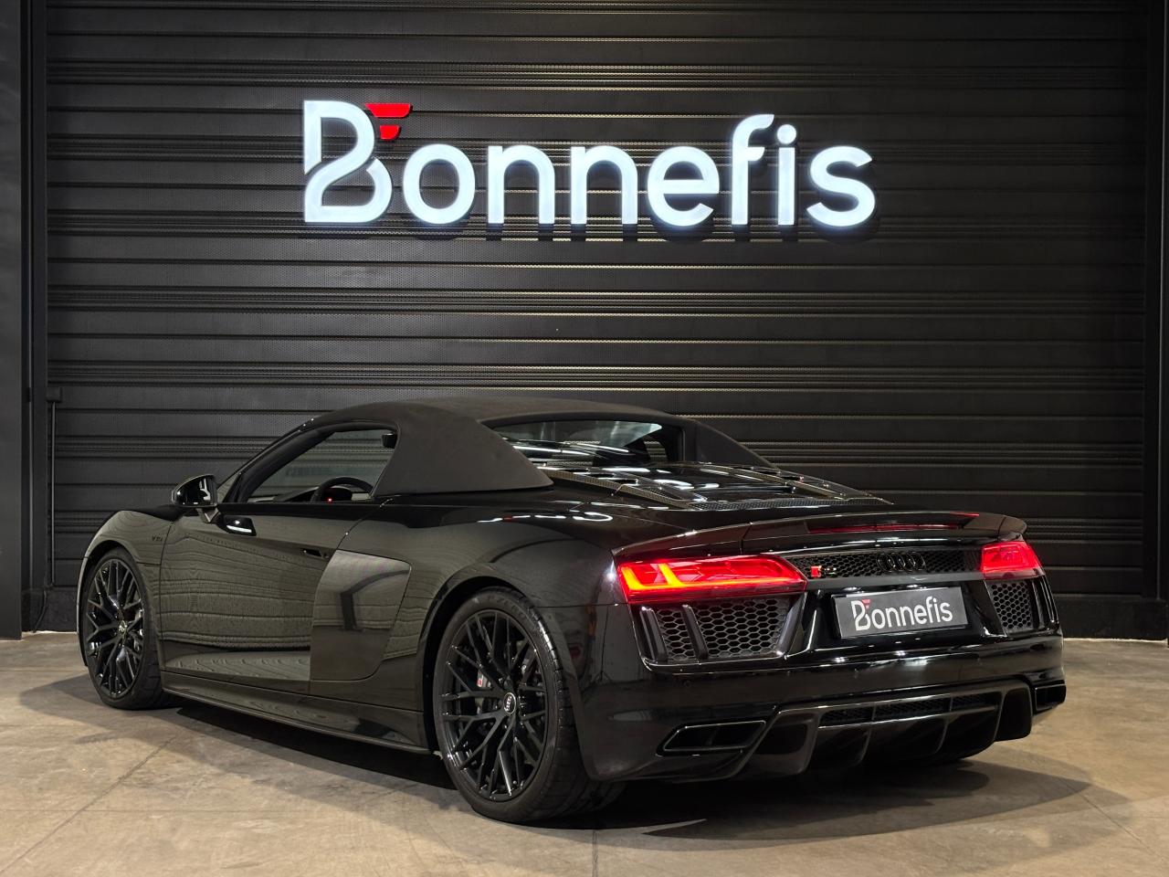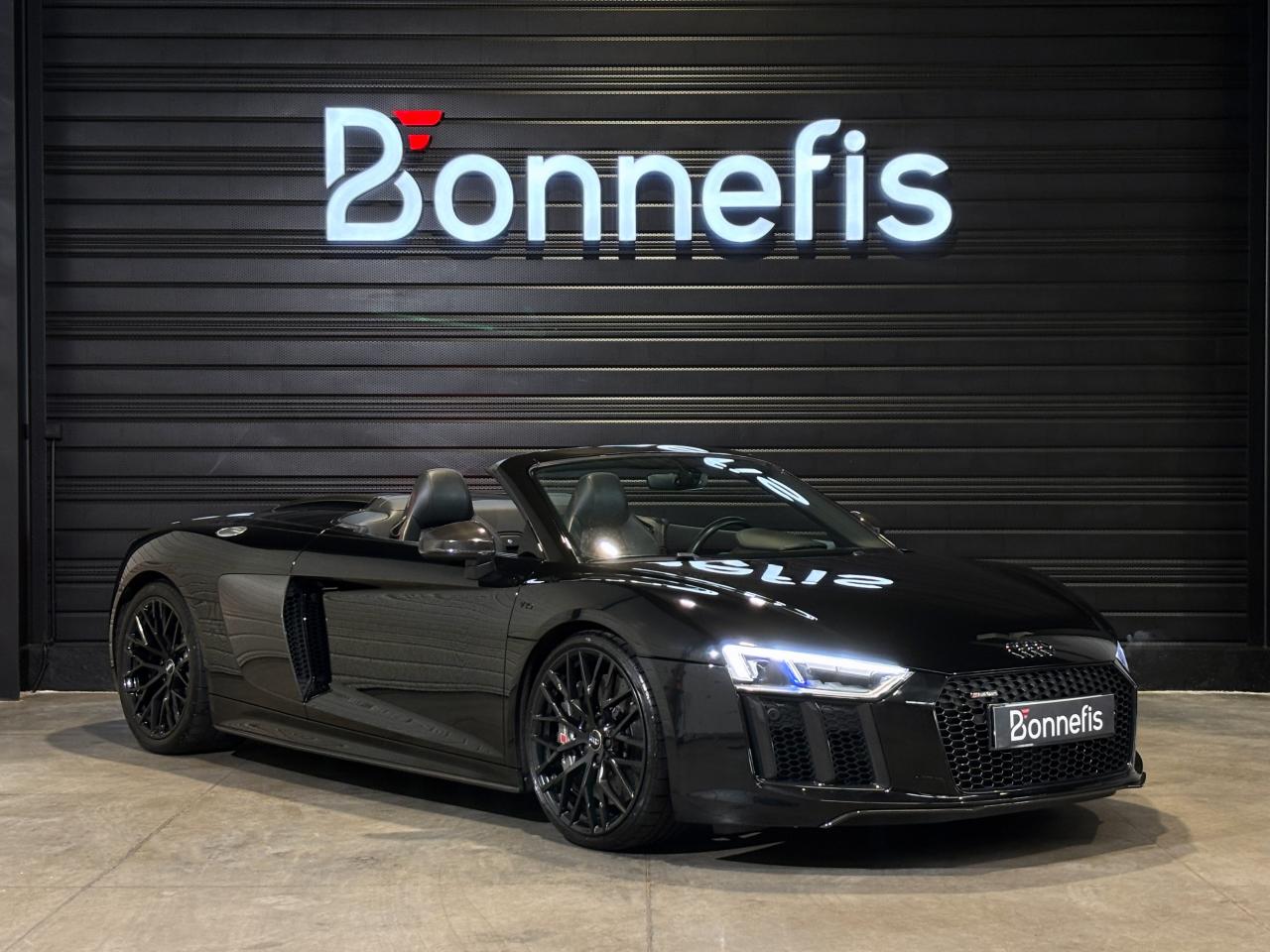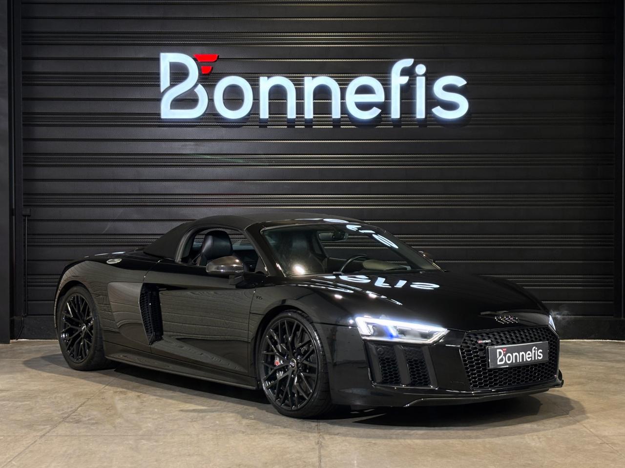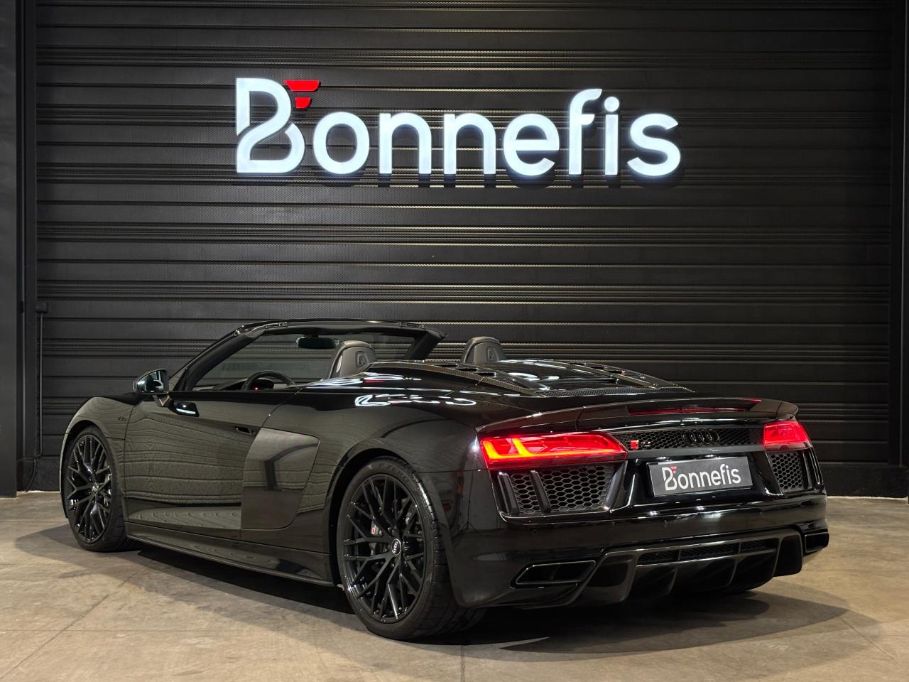 Audi R8 Spyder V10+ 5.2 FSI 610 Ch S tronic Quattro, extérieur noir métallisée, 54 cv, 2 portes, première mise en circulation le 25/05/2018.