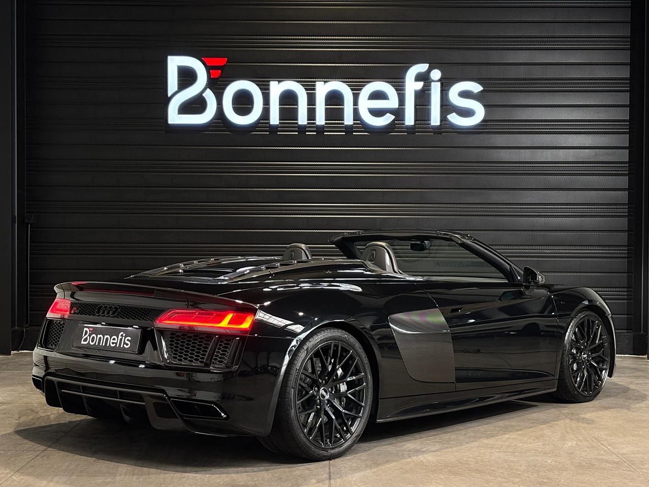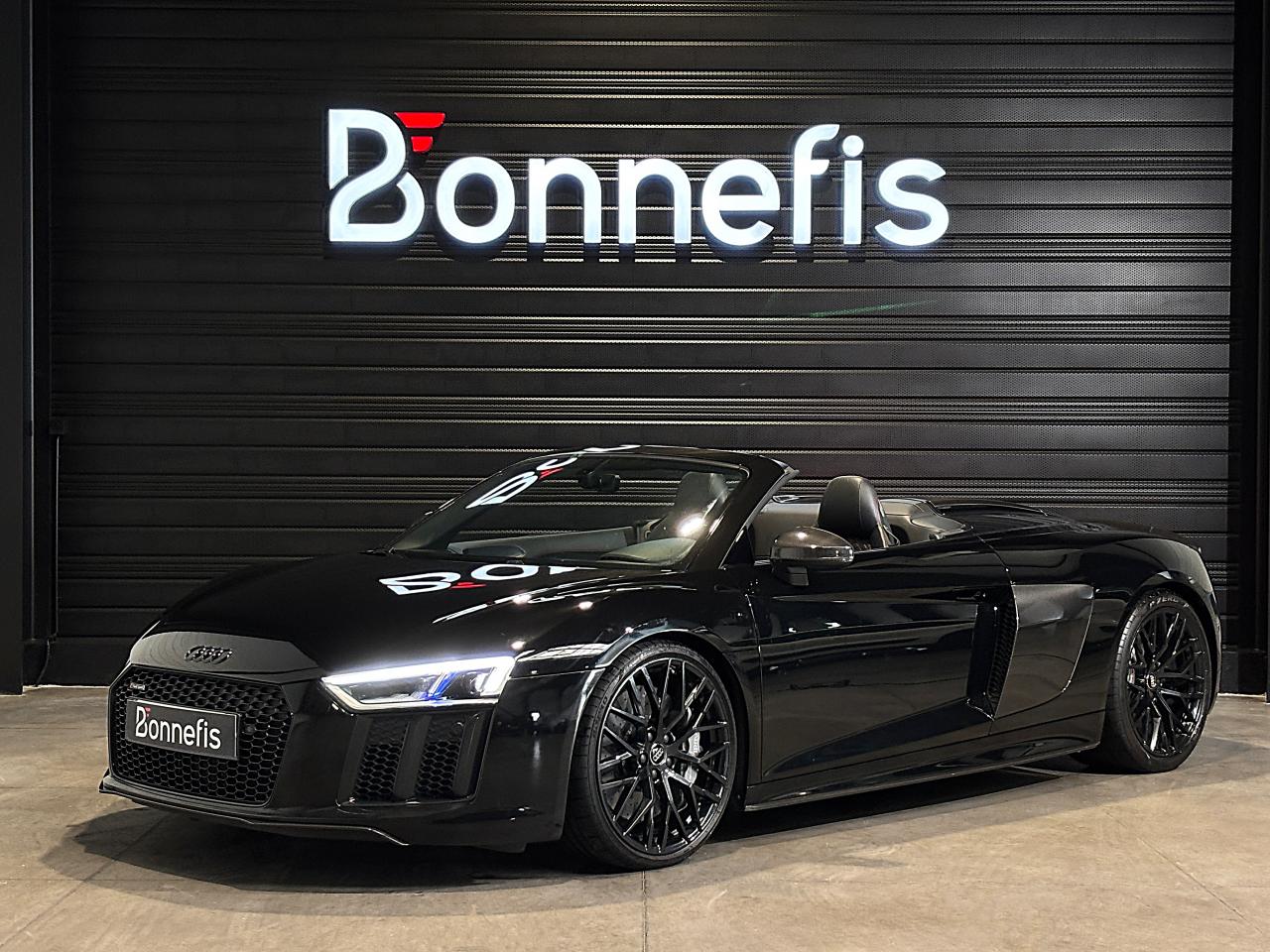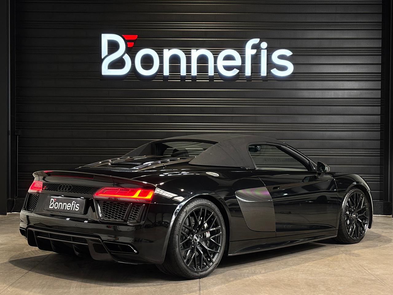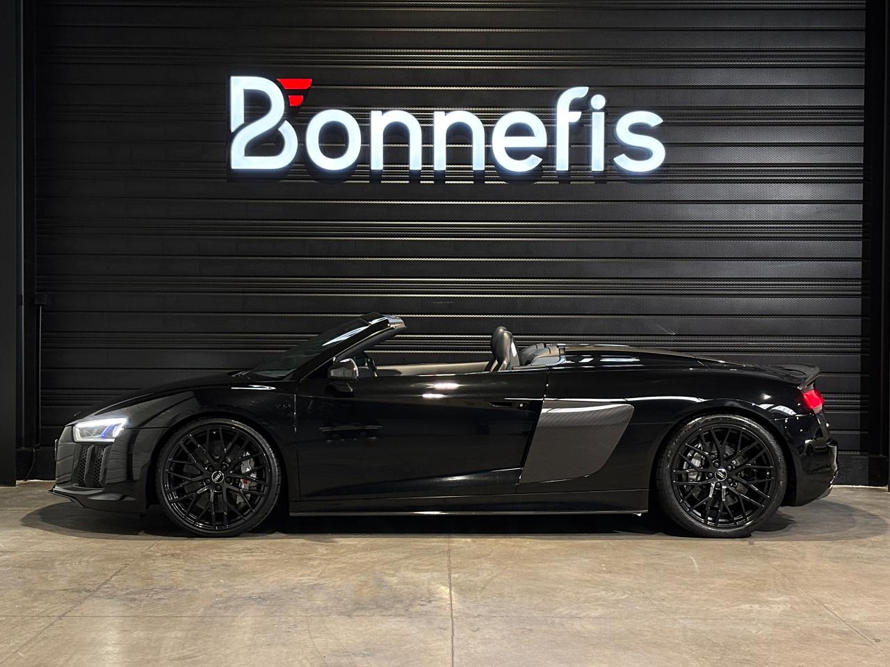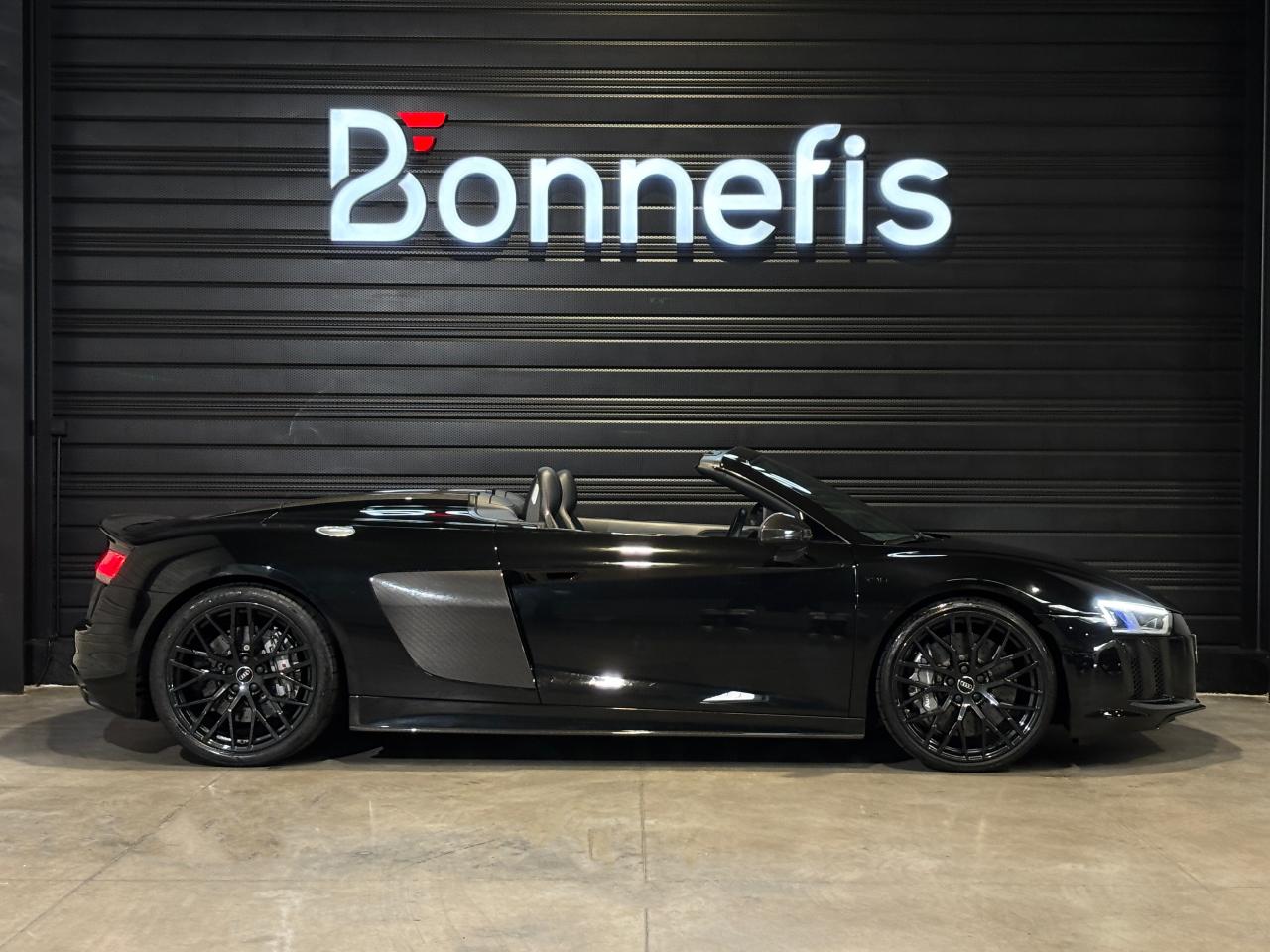 Audi R8 Spyder V10+ 5.2 FSI 610 Ch S tronic Quattro, extérieur noir métallisée, 54 cv, 2 portes, première mise en circulation le 25/05/2018.