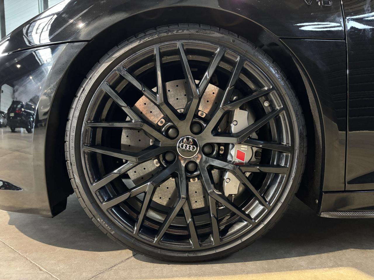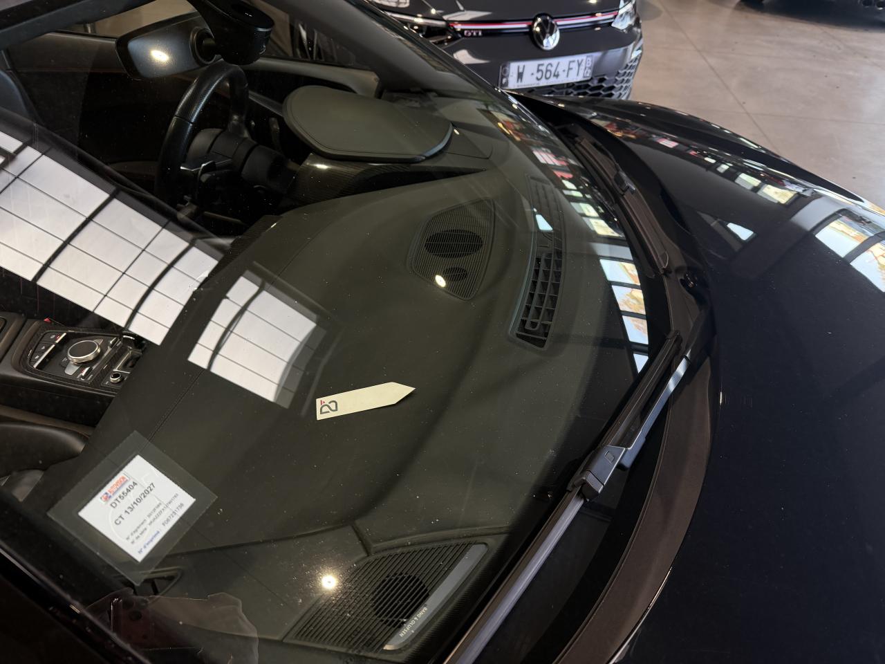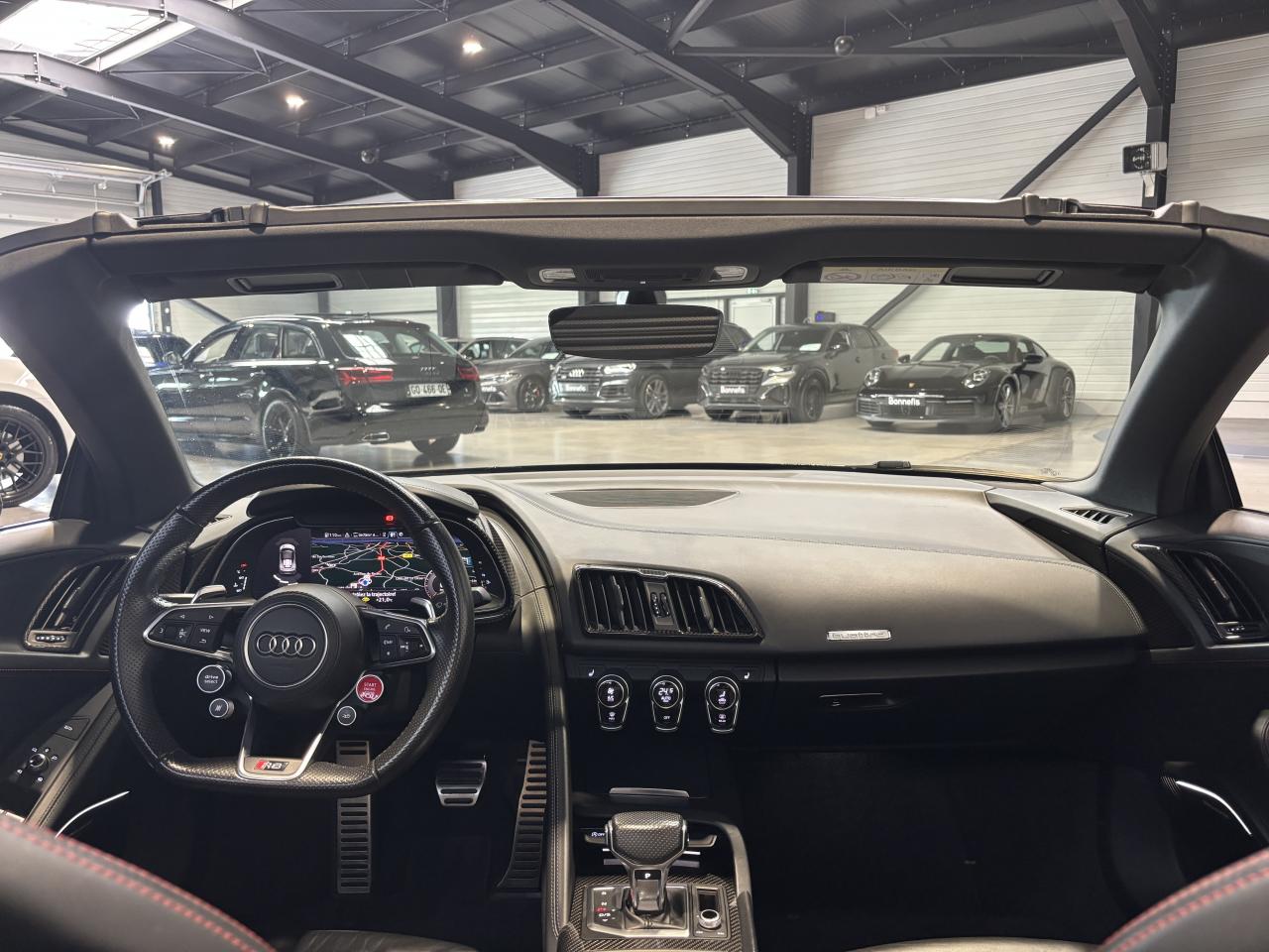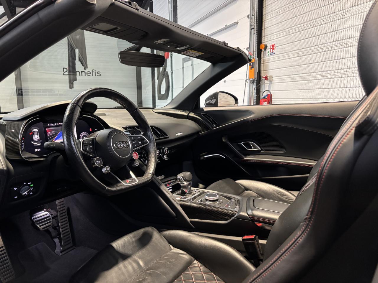 Nombreuses options : GPS, caméra de recul, radars avants et arrières de détection d'obstacles, Phares à LED avec éclairage laser Audi ( 3 300 € ), Spoiler AR en carbone brillant ( 2 825 € ), Audi Magnetic Ride ( 1 758 € ), Réglage électrique des deux sièges AV réglage pneumatique des bourrelets de sièges et des joues de dossier, réglage électrique de la position longitudinale de sièges, réglage pneumatique de l’appui lombaire à 4 axes ( 1 416 € ), Direction Dynamique ( 1 366 € ), Jantes en aluminium forgé style 10 branches en Y noir anthracite brillant ( 1 466 € ), Surpiqûres contrastées de couleur pour sièges noirs ( 683 € ), Moulures de seuil de portes en Aluminium éclairé Audi exclusive avec inscription R8 ( 641 € ), Audi Parking System Plus avec caméra de recul ( 608 € ), Réception radio numérique (DAB) ( 491 € ), Audi Smartphone Interface (Apple CarPlay ou Google AndroidAuto) ( 258 € ), Fixation pour sièges enfants ISOFIX pour le siège passager AV ( 62 € ), Réservoir de carburant 83 litres (+10 litres), Applications décoratives étendues carbone brillant pour l’encadrement de l’Audi virtual cockpit et des diffuseurs d’air, Assistant de feux de route, activaction et désactivation automatique des feux de route, Audi phone box avec recharge par induction, Bang & Olufsen Sound System, Boitiers de rétroviseurs extérieurs en carbone brillant Audi Exclusive, Panneaux latéraux (Side blade) de couleur carbone brillant, Pédalier et repose-pieds en acier inoxydable, Sellerie cuir Nappa fin avec piquage en losange, Sièges AV Sport R8, Volant Performance R8 3 branches en Cuir multifonction plus, Freins céramique RS, étriers de frein en gris anthracite brillant, inscription Audi ceramic a l’AV...