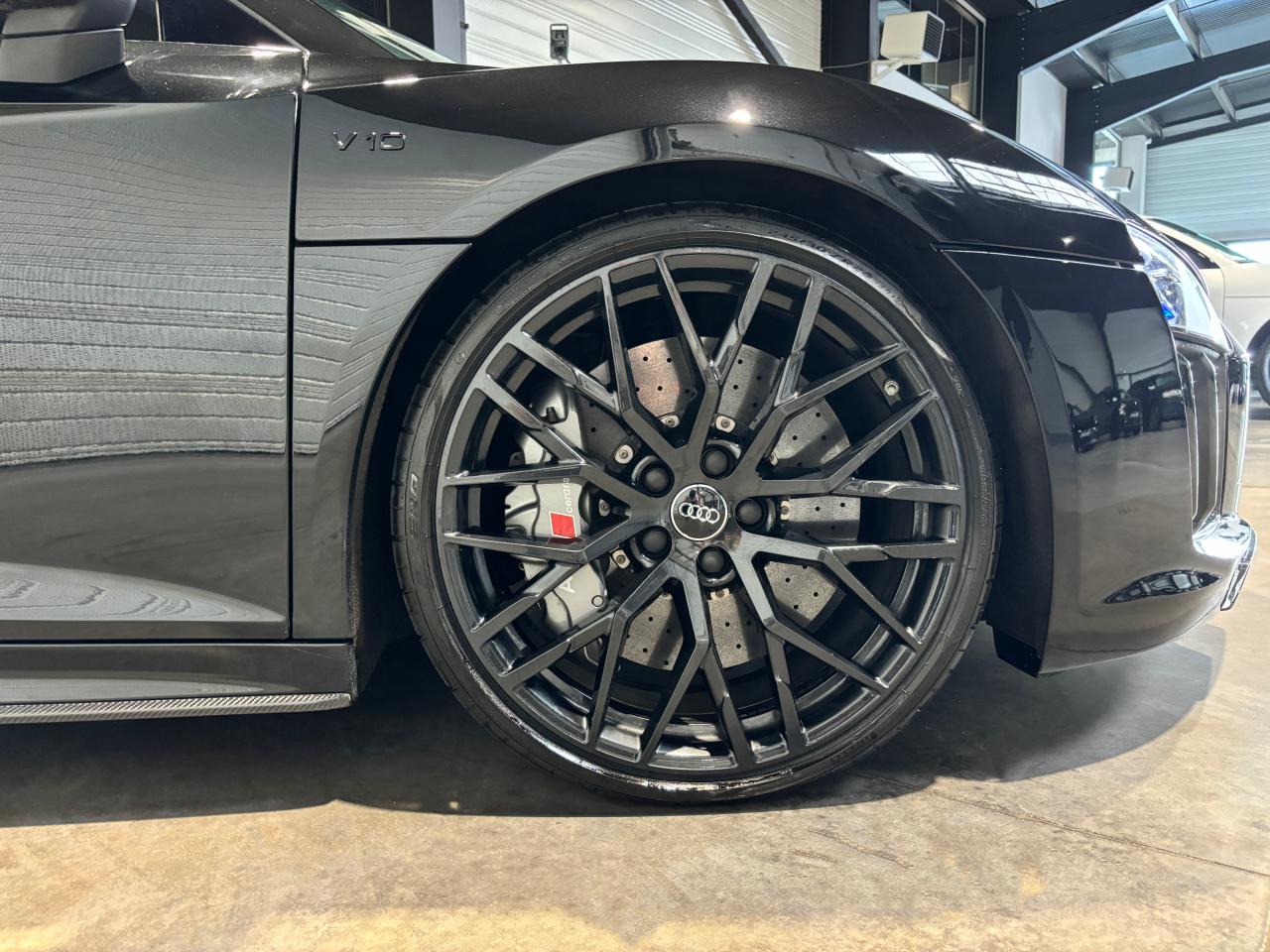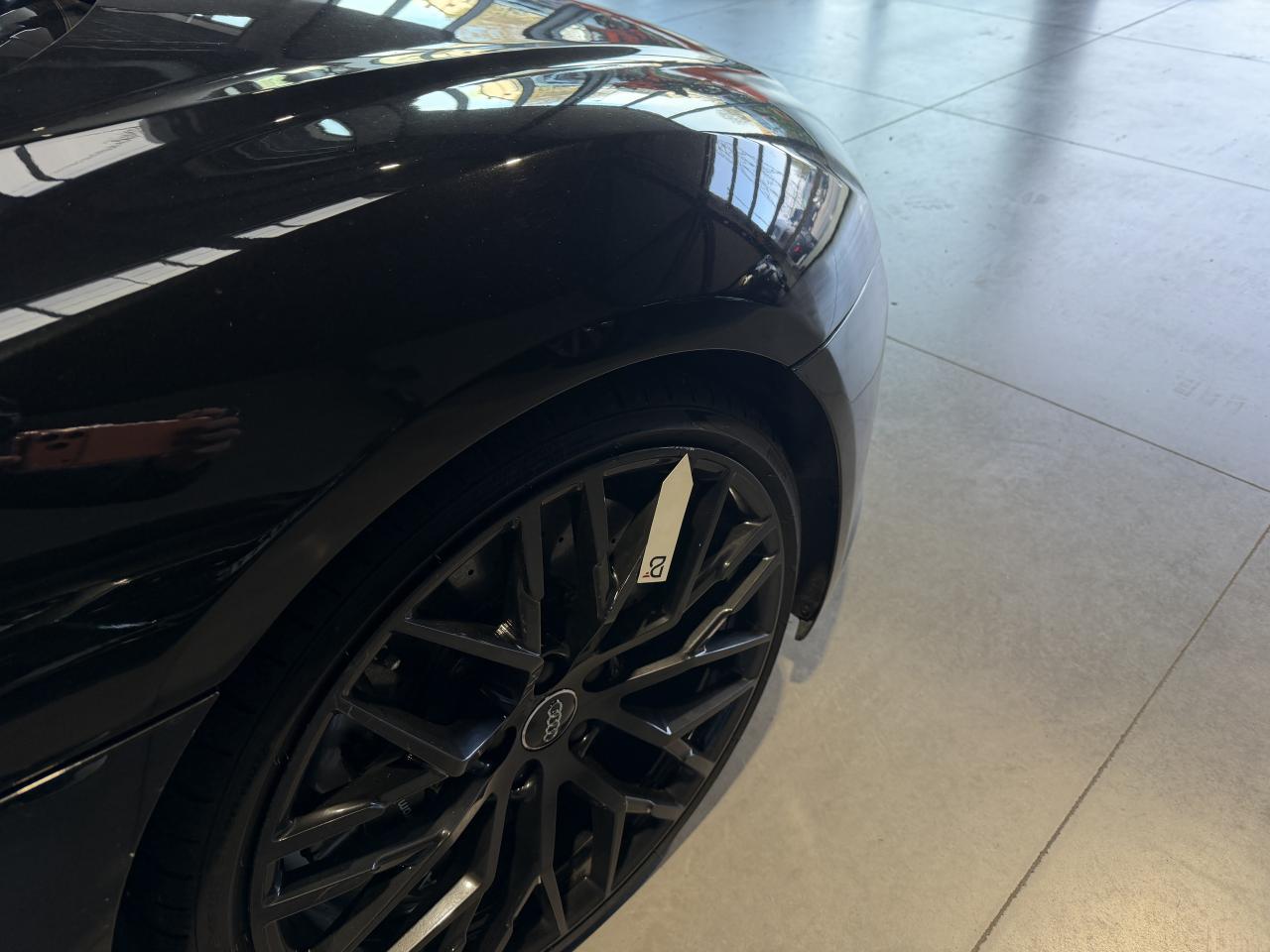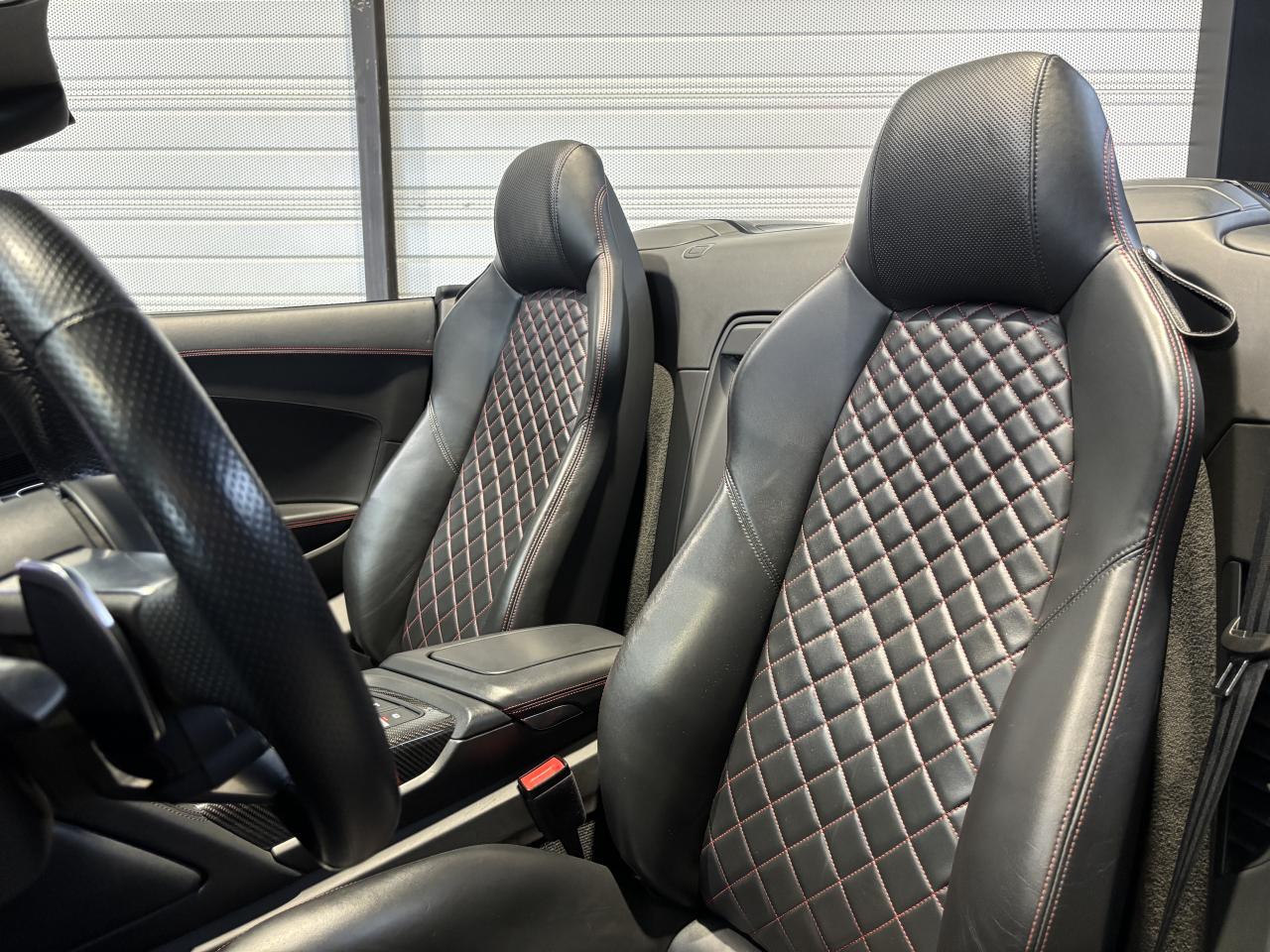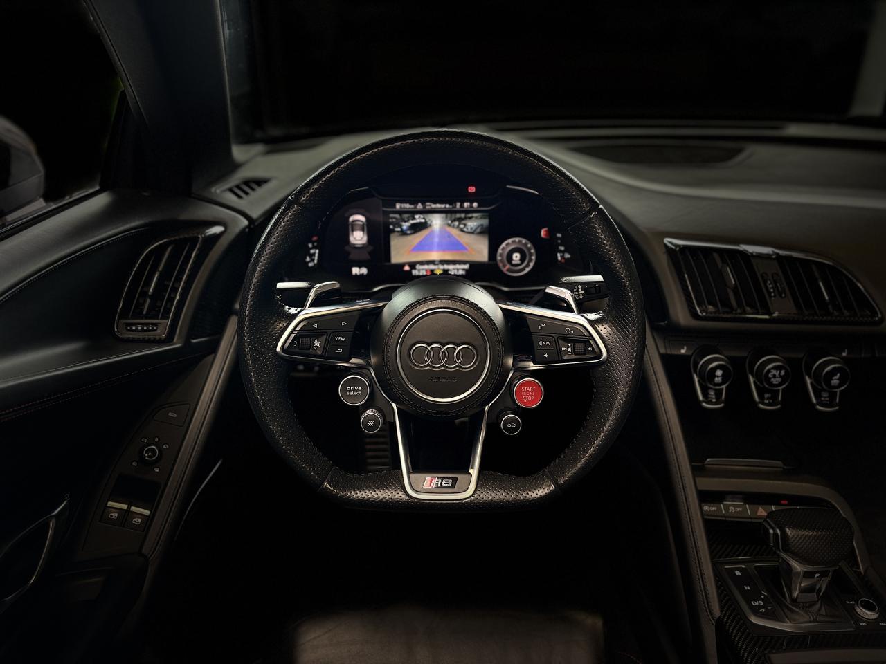 Nombreuses options : GPS, caméra de recul, radars avants et arrières de détection d'obstacles, Phares à LED avec éclairage laser Audi ( 3 300 € ), Spoiler AR en carbone brillant ( 2 825 € ), Audi Magnetic Ride ( 1 758 € ), Réglage électrique des deux sièges AV réglage pneumatique des bourrelets de sièges et des joues de dossier, réglage électrique de la position longitudinale de sièges, réglage pneumatique de l’appui lombaire à 4 axes ( 1 416 € ), Direction Dynamique ( 1 366 € ), Jantes en aluminium forgé style 10 branches en Y noir anthracite brillant ( 1 466 € ), Surpiqûres contrastées de couleur pour sièges noirs ( 683 € ), Moulures de seuil de portes en Aluminium éclairé Audi exclusive avec inscription R8 ( 641 € ), Audi Parking System Plus avec caméra de recul ( 608 € ), Réception radio numérique (DAB) ( 491 € ), Audi Smartphone Interface (Apple CarPlay ou Google AndroidAuto) ( 258 € ), Fixation pour sièges enfants ISOFIX pour le siège passager AV ( 62 € ), Réservoir de carburant 83 litres (+10 litres), Applications décoratives étendues carbone brillant pour l’encadrement de l’Audi virtual cockpit et des diffuseurs d’air, Assistant de feux de route, activaction et désactivation automatique des feux de route, Audi phone box avec recharge par induction, Bang & Olufsen Sound System, Boitiers de rétroviseurs extérieurs en carbone brillant Audi Exclusive, Panneaux latéraux (Side blade) de couleur carbone brillant, Pédalier et repose-pieds en acier inoxydable, Sellerie cuir Nappa fin avec piquage en losange, Sièges AV Sport R8, Volant Performance R8 3 branches en Cuir multifonction plus, Freins céramique RS, étriers de frein en gris anthracite brillant, inscription Audi ceramic a l’AV...
