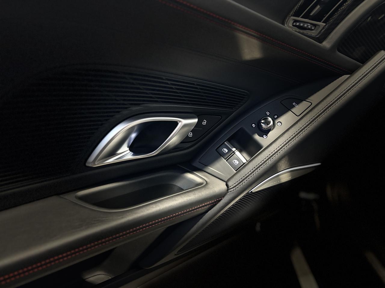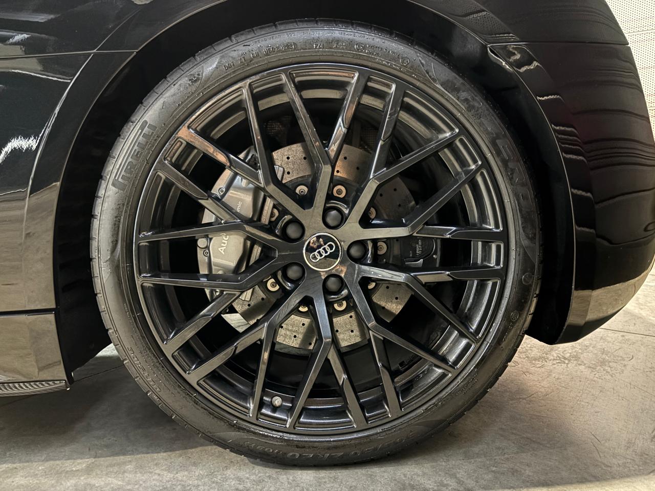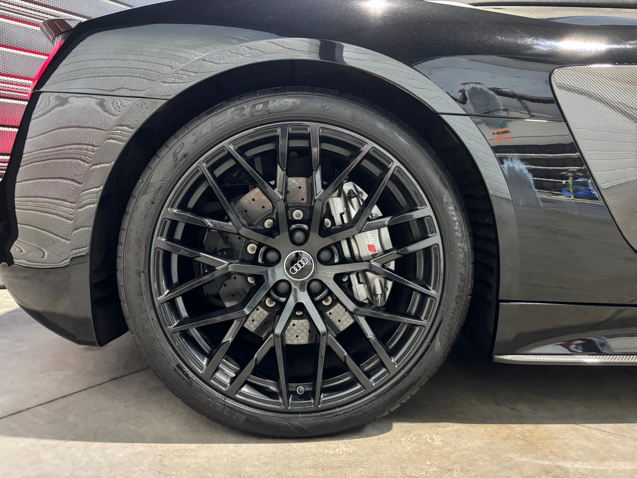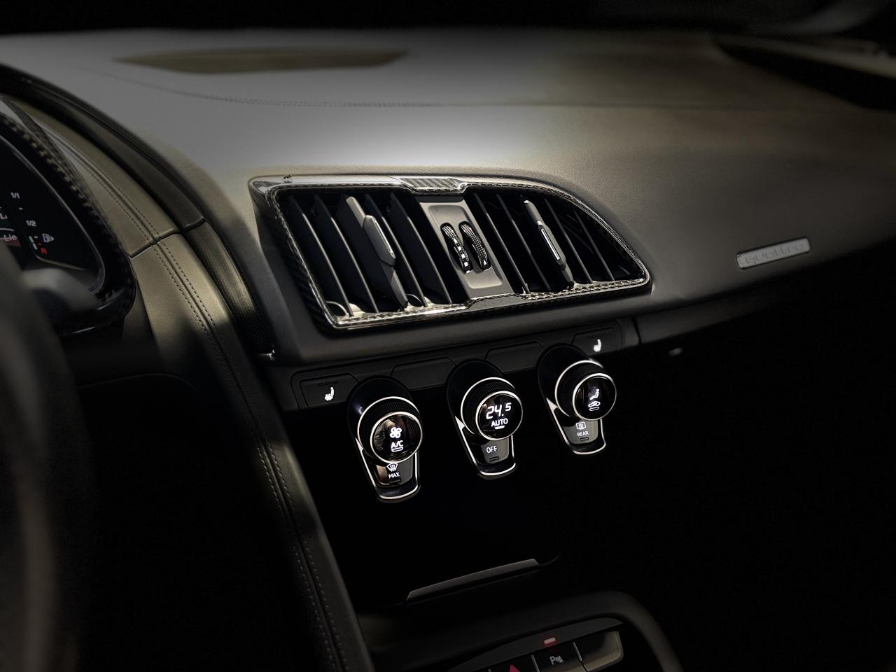 Nombreuses options : GPS, caméra de recul, radars avants et arrières de détection d'obstacles, Phares à LED avec éclairage laser Audi ( 3 300 € ), Spoiler AR en carbone brillant ( 2 825 € ), Audi Magnetic Ride ( 1 758 € ), Réglage électrique des deux sièges AV réglage pneumatique des bourrelets de sièges et des joues de dossier, réglage électrique de la position longitudinale de sièges, réglage pneumatique de l’appui lombaire à 4 axes ( 1 416 € ), Direction Dynamique ( 1 366 € ), Jantes en aluminium forgé style 10 branches en Y noir anthracite brillant ( 1 466 € ), Surpiqûres contrastées de couleur pour sièges noirs ( 683 € ), Moulures de seuil de portes en Aluminium éclairé Audi exclusive avec inscription R8 ( 641 € ), Audi Parking System Plus avec caméra de recul ( 608 € ), Réception radio numérique (DAB) ( 491 € ), Audi Smartphone Interface (Apple CarPlay ou Google AndroidAuto) ( 258 € ), Fixation pour sièges enfants ISOFIX pour le siège passager AV ( 62 € ), Réservoir de carburant 83 litres (+10 litres), Applications décoratives étendues carbone brillant pour l’encadrement de l’Audi virtual cockpit et des diffuseurs d’air, Assistant de feux de route, activaction et désactivation automatique des feux de route, Audi phone box avec recharge par induction, Bang & Olufsen Sound System, Boitiers de rétroviseurs extérieurs en carbone brillant Audi Exclusive, Panneaux latéraux (Side blade) de couleur carbone brillant, Pédalier et repose-pieds en acier inoxydable, Sellerie cuir Nappa fin avec piquage en losange, Sièges AV Sport R8, Volant Performance R8 3 branches en Cuir multifonction plus, Freins céramique RS, étriers de frein en gris anthracite brillant, inscription Audi ceramic a l’AV...