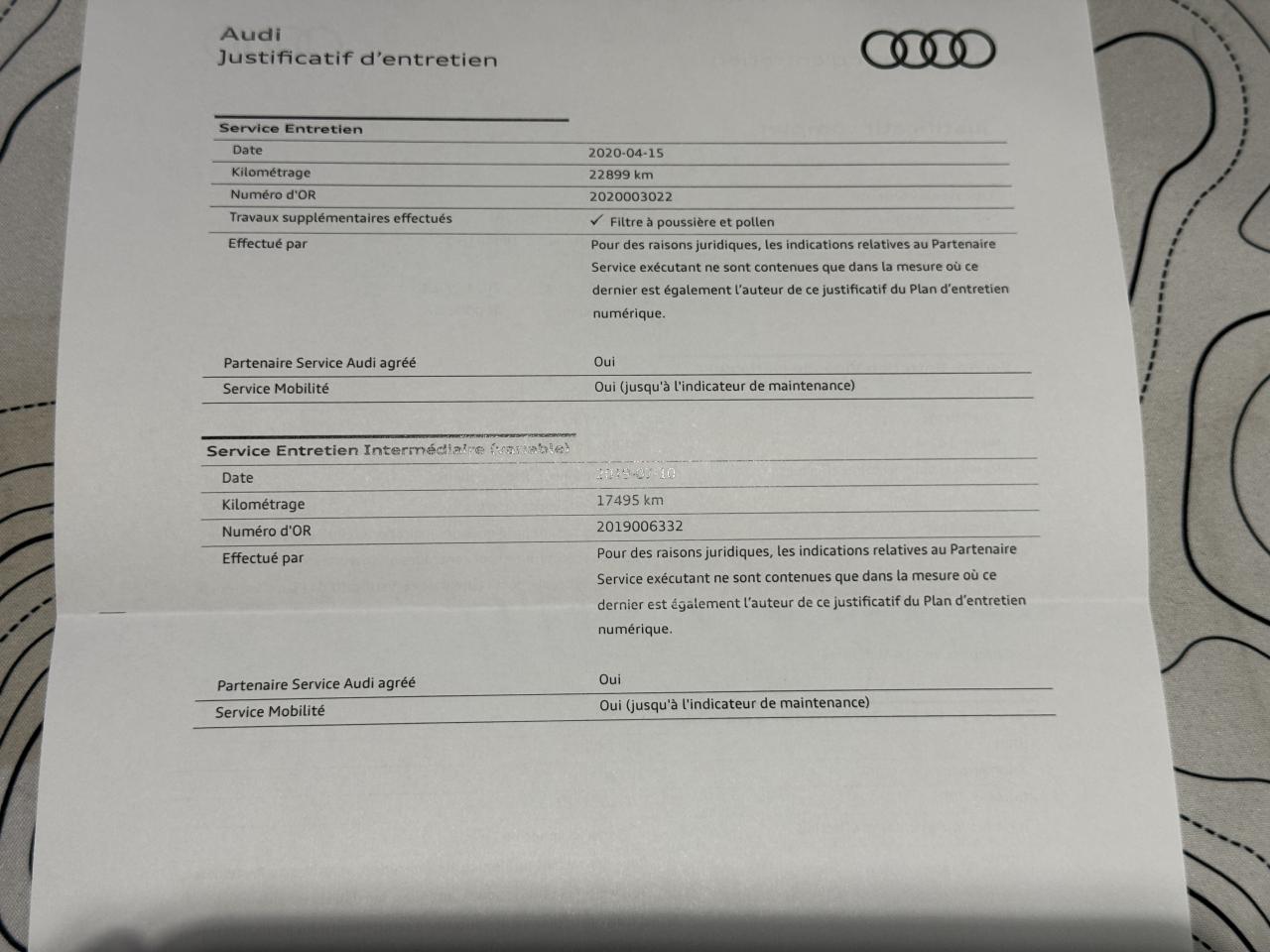 - 2ème entretien fait le 15/04/2020 à 22 899Km chez Audi. ( Filtre à poussière et pollen )