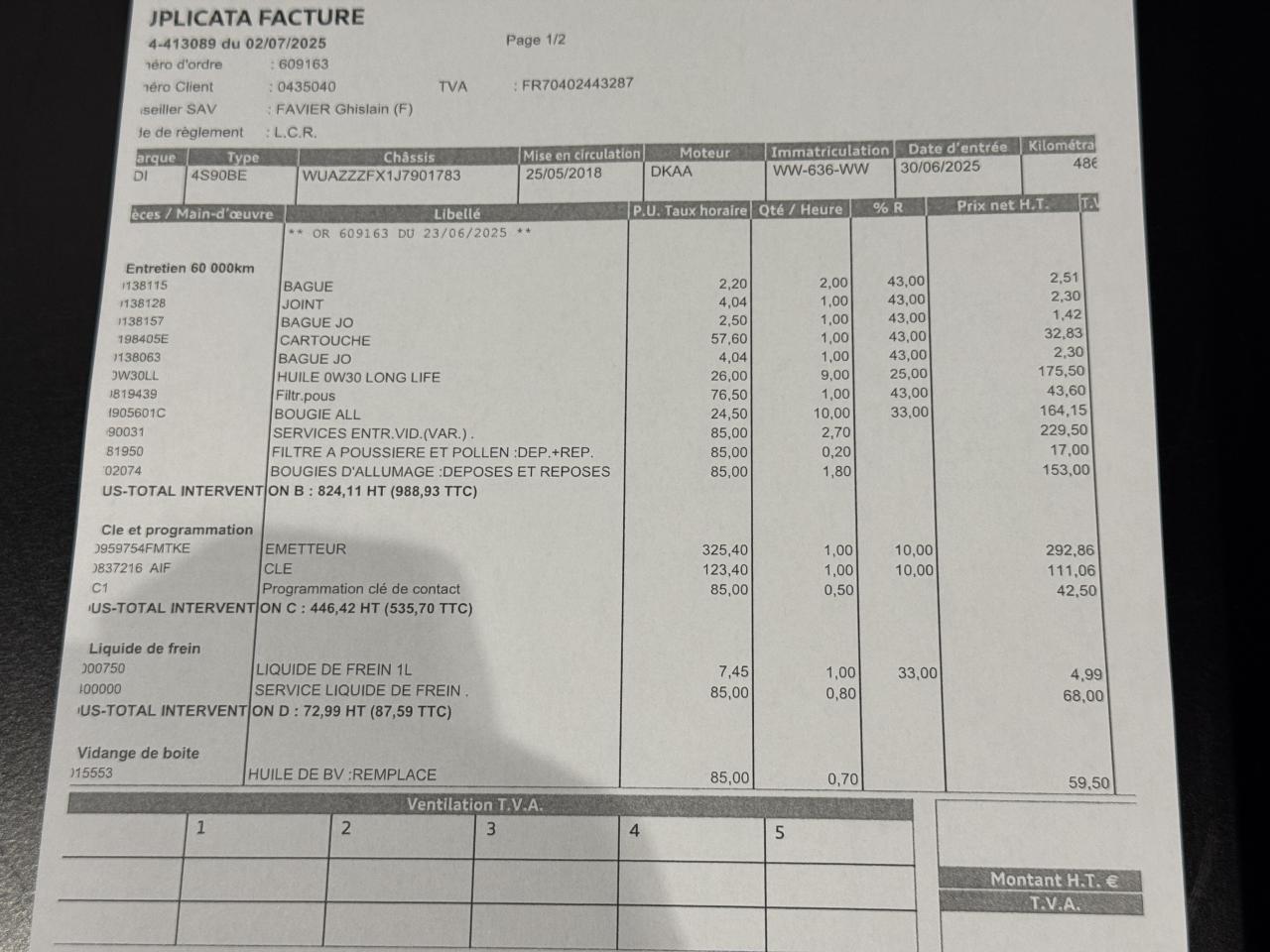 - 5ème entretien fait le 30/06/2025 à 48 668Km chez Audi. ( Vidange moteur + bougies d'allumage + filtre à poussière et pollen + liquide de frein + vidange de boite )