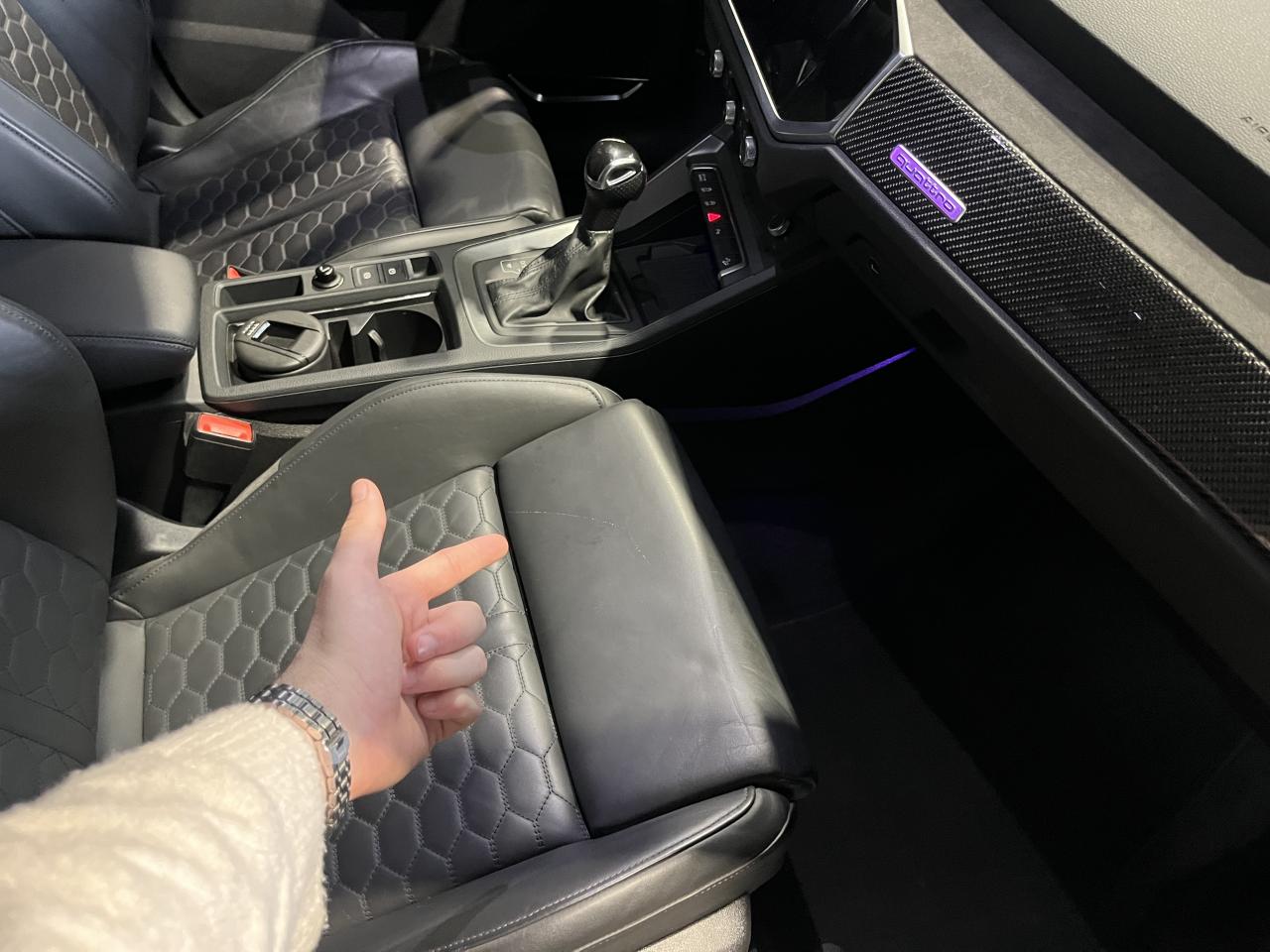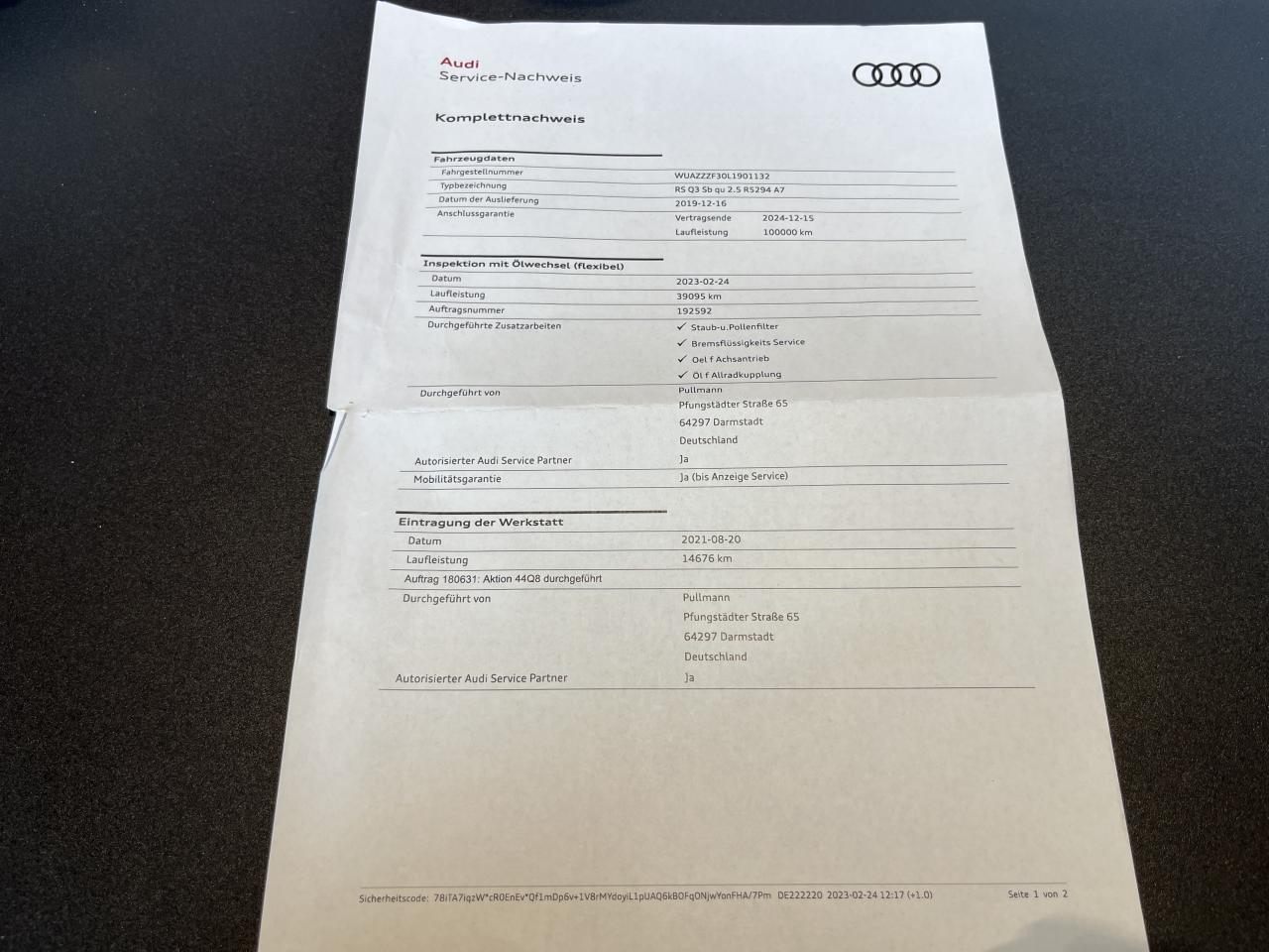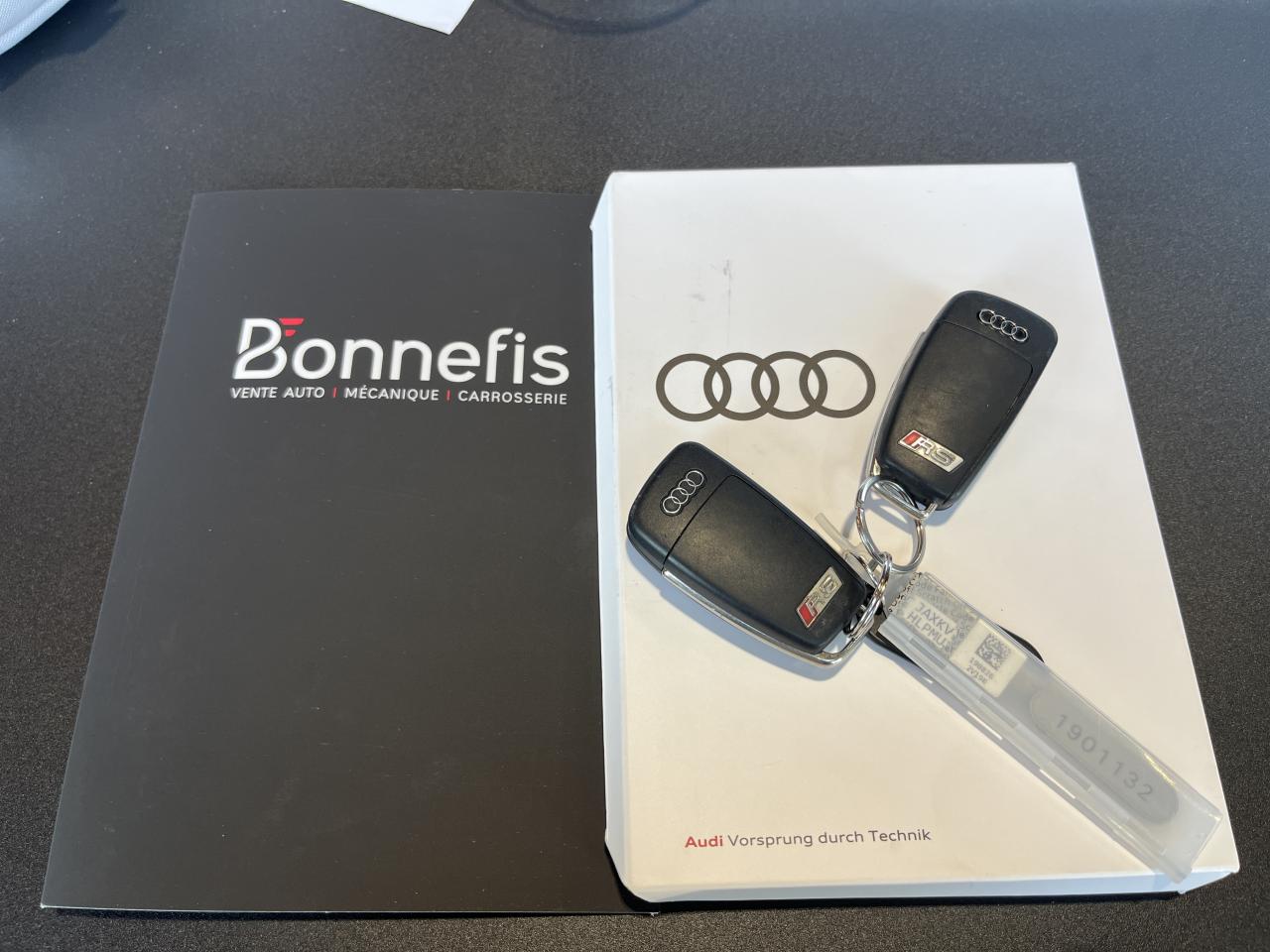 Nombreuses options : GPS, caméra de recul, Apple CarPlay, radars avants et arrières de détection d'obstacles, régulateur de vitesse, sièges Sport cuir Nappa fin avec surpiqûres alvéolées ( 1 500 € ), vitesse maximale relevée à 280 km/h ( 1 500 € ), système d'échappement Sport avec sorties ovales noir brillant ( 1 000 € ), amortissement piloté avec Audi drive select ( 1 000 € ), Bang & Olufsen Premium Sound System avec son 3D ( 775 € ), sièges AV réglables électriquement ( 700 € ), phares Audi Matrix LED avec clignotants dynamiques AV et AR ( 666 € ), capot moteur avec application carbone ( 625 € ), Audi Phone Box avec charge du téléphone par induction ( 375 € ), vitrage Privacy : lunette AR, vitres de portières AR et vitres latérales AR surteintées ( 375 € ), clé confort (Keyless entry) ( 400 € ), rétroviseurs extérieurs réglables, dégivrants, rabattables électriquement avec fonction rabat automatique et fonction jour/nuit automatique des deux côtés ( 275 € ), système de contrôle de pression des pneus ( 300 € ), applications décoratives en Carbone Twill (Audi exclusive en style RS) ( 300 € ), sièges AV chauffants ( 316 € ), airbags latéraux AR ( 333 € ), lave-phares haute pression ( 250 € ), préparation pour crochet d'attelage ( 100 € ), boîtiers de rétroviseurs extérieurs en Noir ( 100 € ), contrôle de descente ( 91 € ), pack Fumeur ( 33 € ), assistant de feux de route, assistant de freinage d’urgence, Audi Parking System Plus, Audi Pre Sense front, adaptive drive assist, inscription éclairée sur le tableau de bord passager AV, prise 12V dans le coffre, compartiment de rangement sous le siège passager AV, support pour carnet de bord sous le siège conducteur, insert de coffre dans les garnitures latérales, filet de coffre, filet de rangement au dos des sièges AV, éclairage LED dans le coffre, pack Eclairage d'ambiance, choix parmi 30 couleurs, système de lecture des panneaux de signalisation par caméra, anneaux Audi et monogrammes en Noir Brillant....