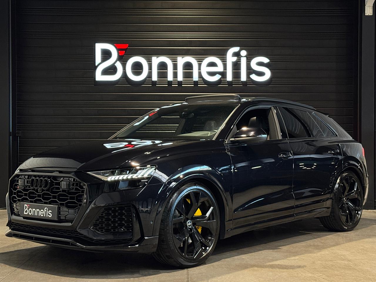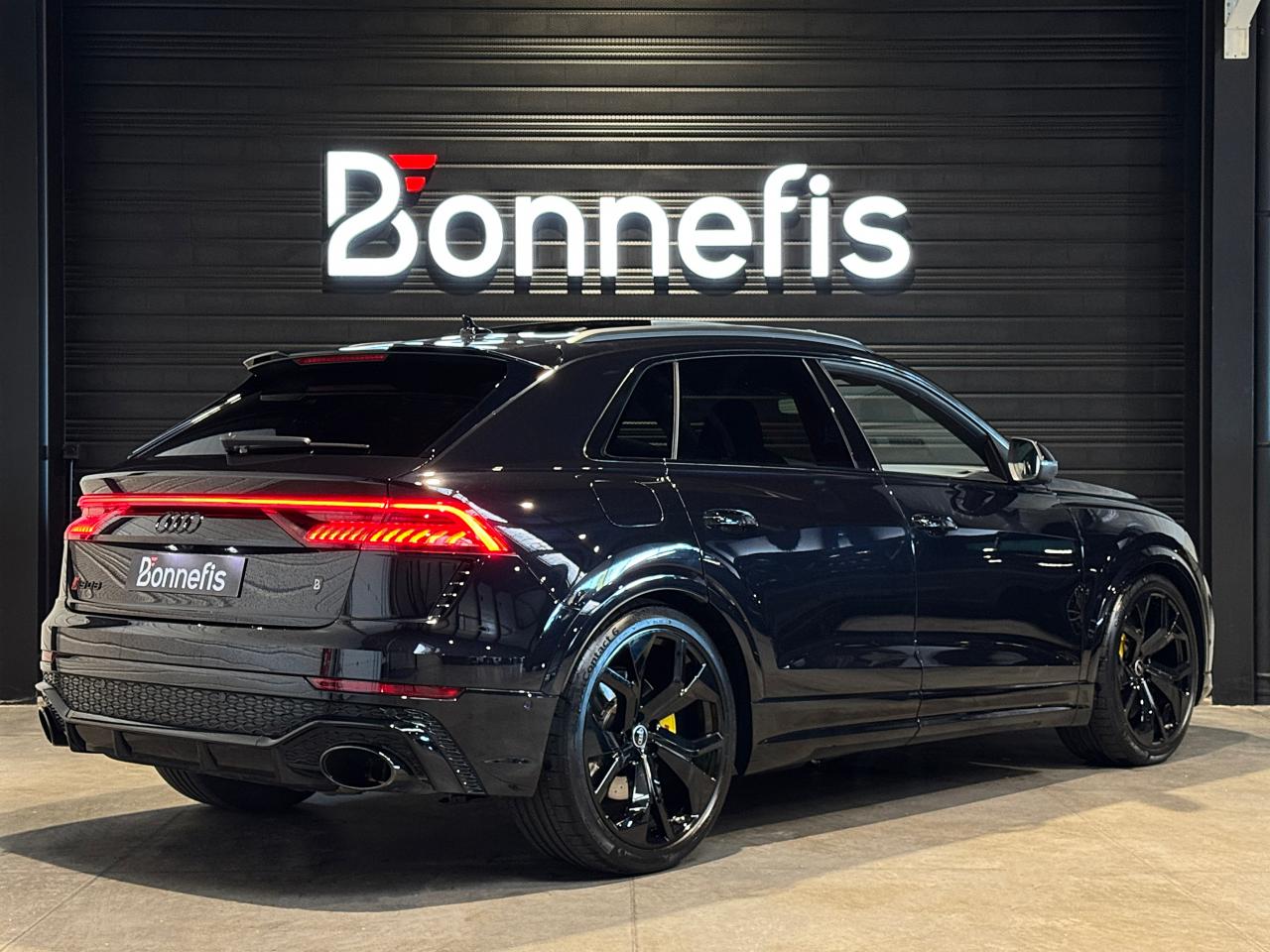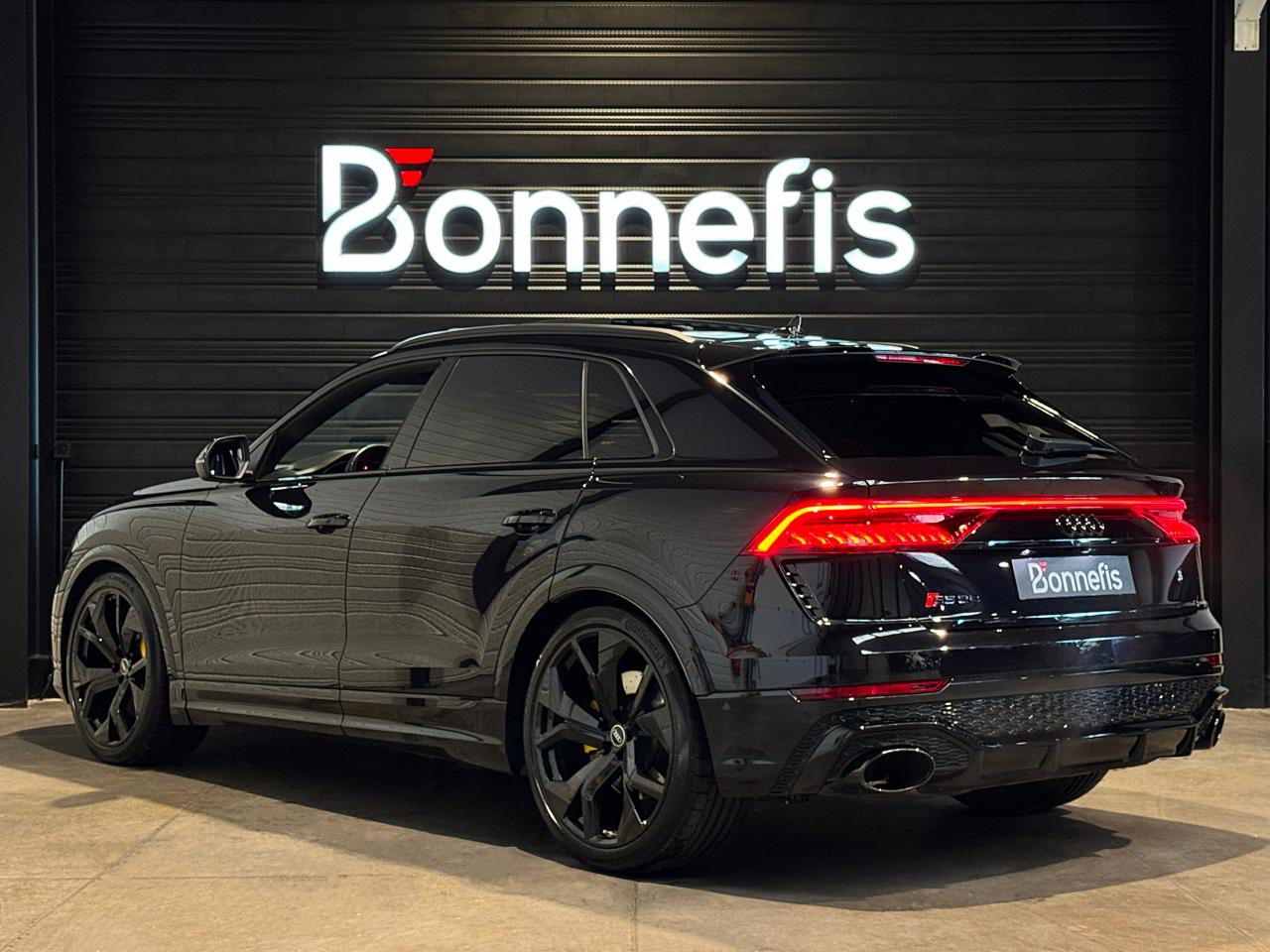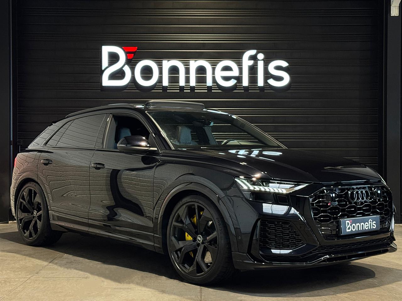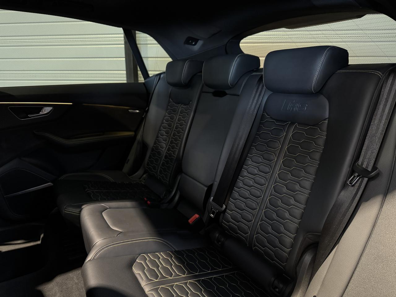 Audi RSQ8 4.0 V8 TFSI 600 Ch Quattro Tiptronic, extérieur noir Orca ( 1 041 € ), intérieur Sellerie en cuir Valcona avec surpiqûres alvéolées spécifiques "RS" ( personnalisation couleurs sièges ( sellerie et surpiqûres ) + couleur contre-portes ( 3 958 € ) ), 52 cv, 5 portes, première mise en circulation le 07/12/2020.