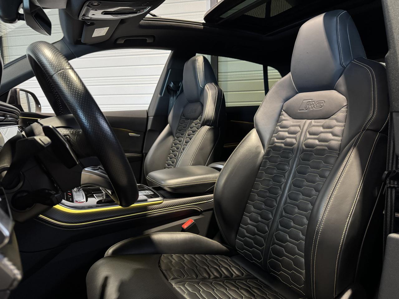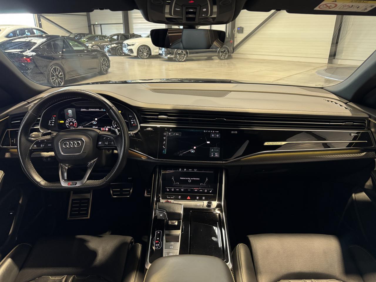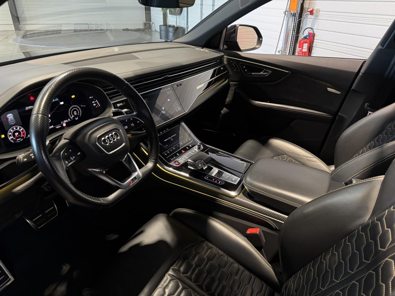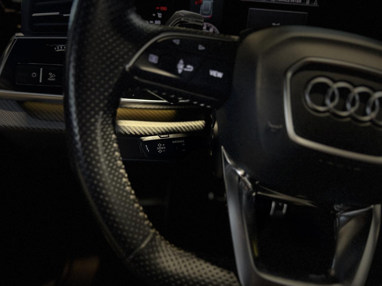 Nombreuses options : GPS, caméras périphériques à 360°, Apple Carplay, radars avants et arrières de détection d'obstacles, jantes 23'' en alliage léger, style 5 branches en "Y" design en hélice, finition Noir Anthracite, polies brillant ( 2 291 € ), application décorative Carbone "Twill" mat (tableau de bord, contre-portes et console centrale) ( 1 000 € ), éléments de l’habitacle inférieurs en cuir Audi exclusive ( 958 € ), crochet d'attelage électrique ( 666 € ), peinture intégrale unie + design extérieur carrosserie "RS" ( 541 € ), rampes de pavillon Noires ( 416 € ), sièges AV/AR chauffants ( 395 € ), logo Audi (anneaux) et inscriptions laqués en noir brillant ( 333 € ), système de rails avec kit de fixation pour coffre ( 291 € ), sellerie en cuir Valcona avec surpiqûres alvéolées spécifiques "RS", sièges Sport "RS", suspension adaptative pneumatique Sport "RS", Bang & Olufsen Premium Sound System avec son en 3D, Audi Virtual Cockpit, projecteurs Audi Matrix LED, assistant de conduite adaptatif incluant assistant de conduite en embouteillage, assistant de maintien de la vitesse adaptatif, assistant d'efficience prédictive, assistant d'évitement d'urgence, assistant de changement de direction, avertissement de franchissement de ligne incluant assistant de freinage d'urgence, Audi pre sense front, Audi drive select, Audi hold assist : maintien le véhicule à l'arrêt en côte comme en descente, système avancé de contrôle de pression des pneus, rétroviseurs extérieurs avec clignotants à LED intégrés, avec fonction jour/nuit automatique des deux côtés et mémoire, rétroviseur intérieur jour/nuit automatique sans encadrement (Frameless), pare-brise en verre de sécurité feuilleté athermique, lave-phares haute pression, toit panoramique en verre, ventilation des sièges AV, vitres AR surteintées (Vitrage Privacy), touches de commande façon verre en noir avec réponse haptique incluant style aluminium étendu, volant réglable électriquement, volant Sport 3 branches multifonction en cuir avec méplat et palette de changement de vitesses, repose-pied et pédalier en acier inoxydable, appel d'urgence avec service Audi connect + commande de véhicule, logo extérieurs "RS", ...