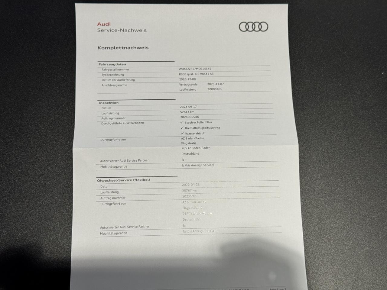 - 1er entretien fait le 08/12/2020 à 0Km chez Audi. ( Contrôle à la livraison )