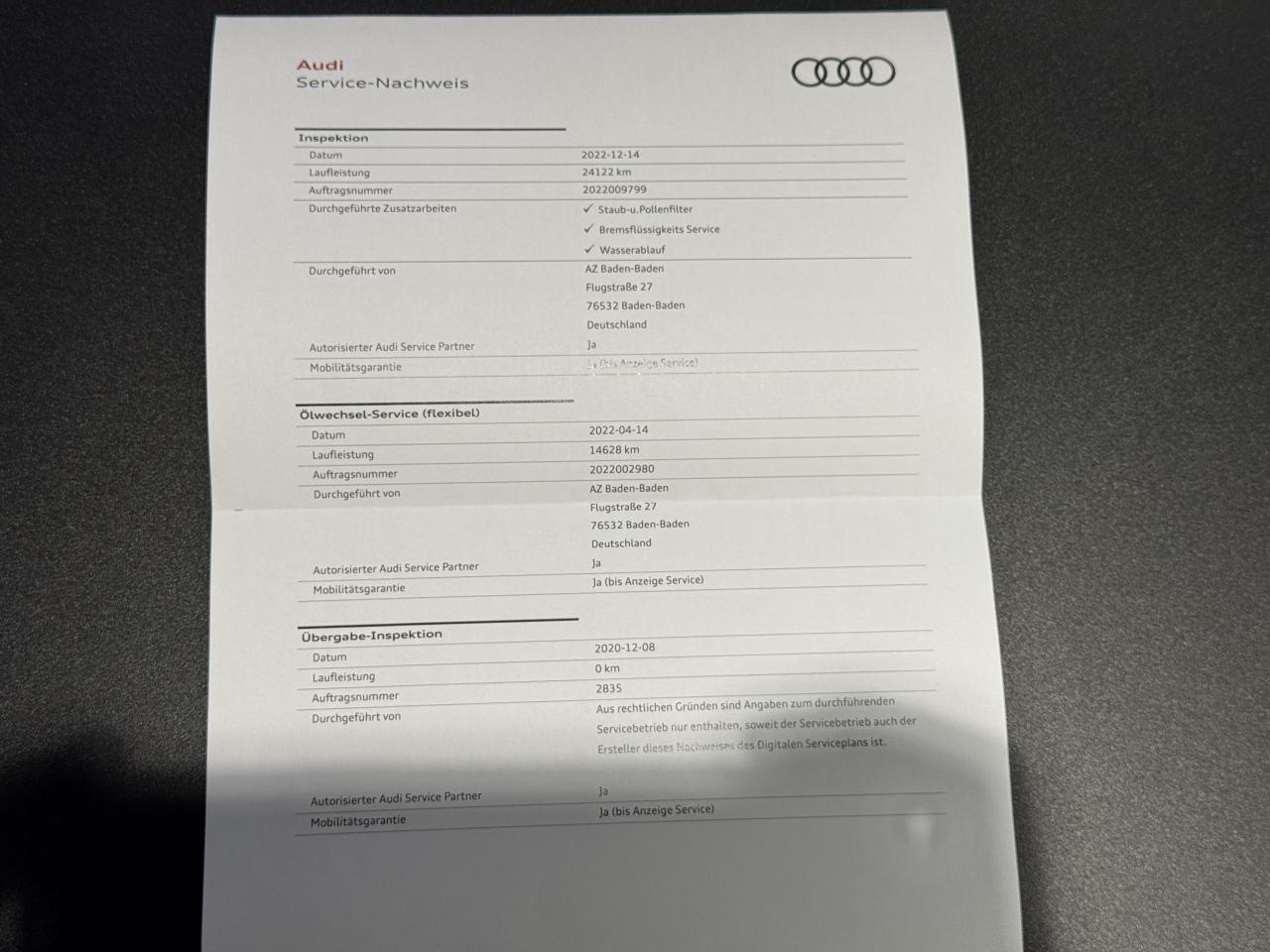 - 3ème entretien fait le 14/12/2022 à 24 122Km chez Audi. ( Filtre à pollen et poussière + liquide de frein )