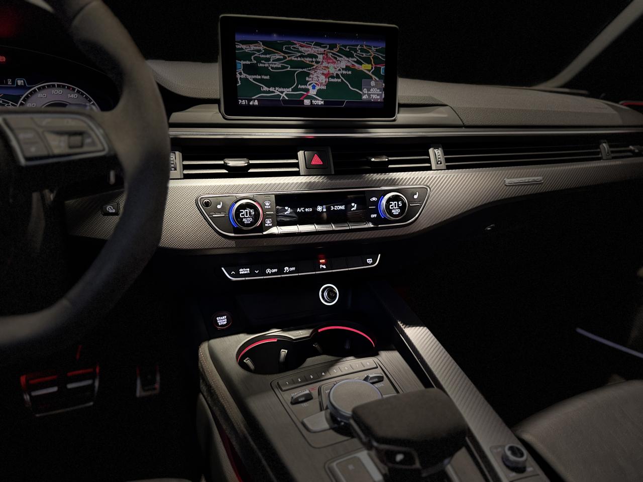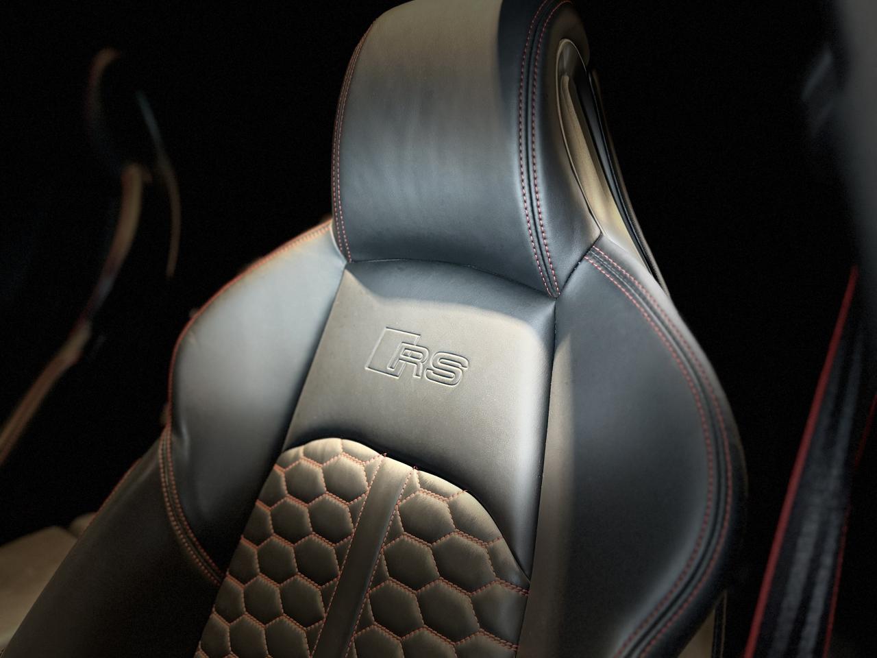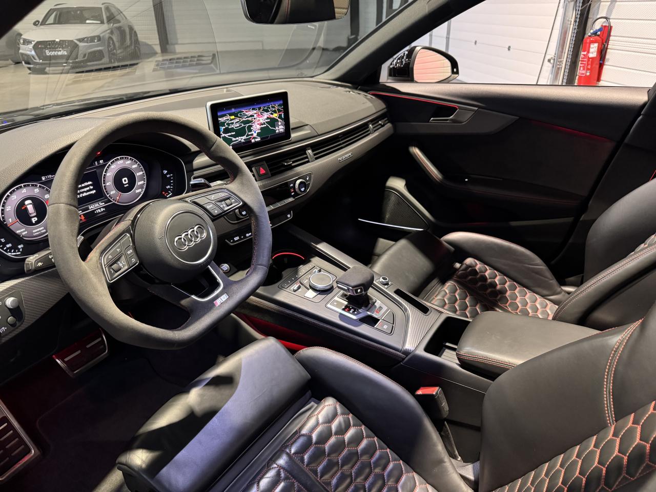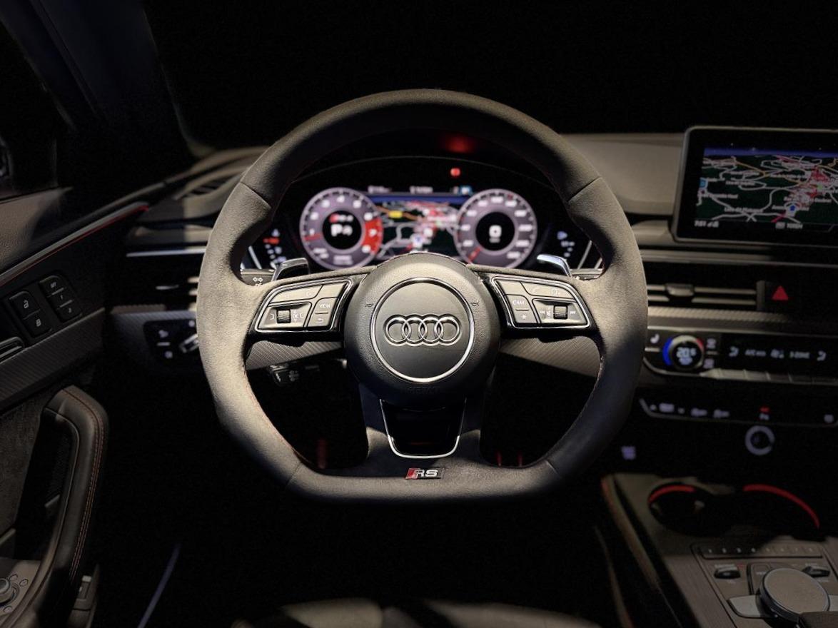 Nombreuses options : GPS, caméra de recul, radars avants et arrières de détection d'obstacles, Jantes aluminium forgé, 5 branches doubles Edge noir anthracite brillant, fraisées brillant, 20" ( 2 308 € ), Châssis Sport RS plus avec Dynamic Ride Control (DRC) réglable sur 3 niveaux: comfort, auto, dynamic ( 2 000 € ), Vitesse maximale relevée à 280km/h ( 1 500 € ), Toit panoramique ( 1 458 € ), Différentiel Quattro Sport, répartition dynamique de couple droite/gauche sur l'essieu AR ( 1 358 € ), Echappement Sport RS incluant sonorité encore plus travaillée et sorties d'échappement noires ( 1 250 € ), Affichage tête haute ( 991 € ), Bang & Olufsen Sound System avec son en 3D ( 858 € ), Sellerie en cuir Nappa fin ( 875 € ), Vitres surteintées (Privacy glass) : vitrage acoustique pour les vitres de portières AV, ainsi que vitres latérales AR et lunette AR surteintées ( 483 € ), Etriers de frein laqués rouge brillant avec inscription RS à l'AV et à l'AR ( 400 € ), Applications décoratives en Aluminium Racing anthracite ( 350 € ), Réception radio numérique (DAB) ajoute à l'offre de radios analogiques la réception de stations numériques selon le standard DAB, incluant DAB+ et DMB Audio ( 341 € ), Coques de rétroviseurs extérieurs en Noir brillant ( 108 € ), Adaptive cruise control Stop & Go avec assistant embouteillage ( ACC / Active Cruise Control ), Direction Dynamique, Augmentation de la vitesse de pointe à 280 km/h, Assistant de conduite efficiente, Audi Pre Sense Front avec Assistant d'évitement collision et Assistant changement direction, Becquet AV, encadrement de la calandre, baguettes décoratives sur les vitres latérales, diffuseur AR en noir brillant, Boîte à gants verrouillable, Filet dans le logement gauche et sangles de serrage à gauche et à droite (dans le coffre), hayon de coffre électrique, Filet de rangement au dos des sièges AV, Pack Audi Lane Assist, Phares Audi Matrix LED, Porte-boissons dans l'accoudoir central AR, Quattro avec différentiel Sport, Rampes de pavillon Noires, Système de lecture des panneaux de signalisation par caméra, Vide-poches côté conducteur...