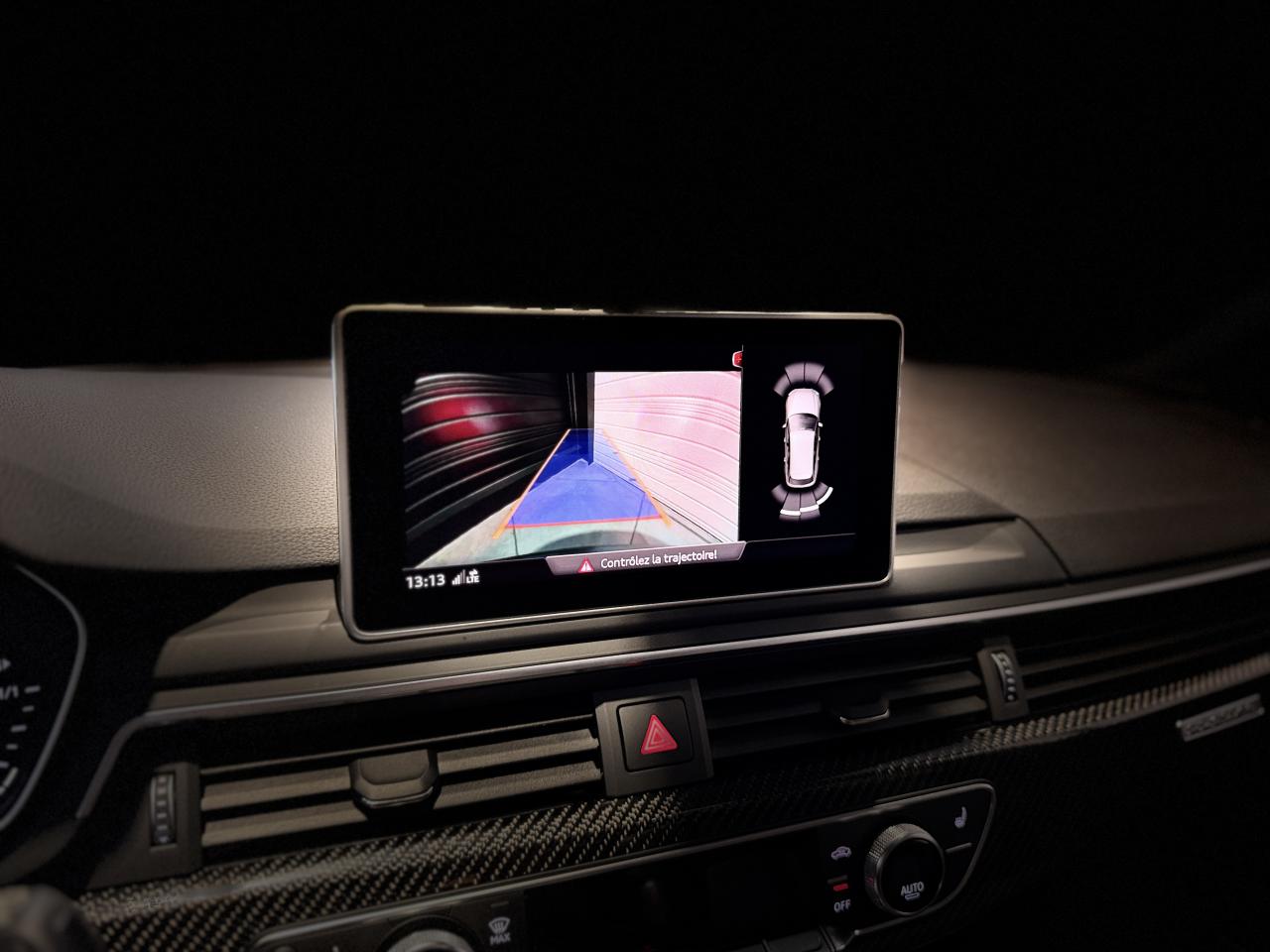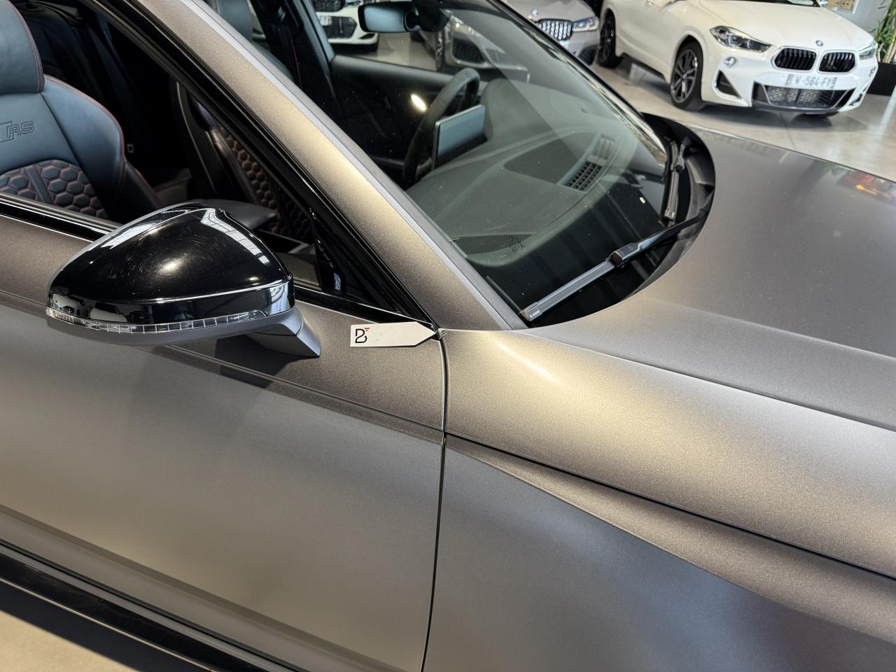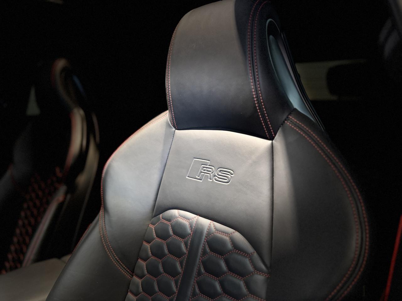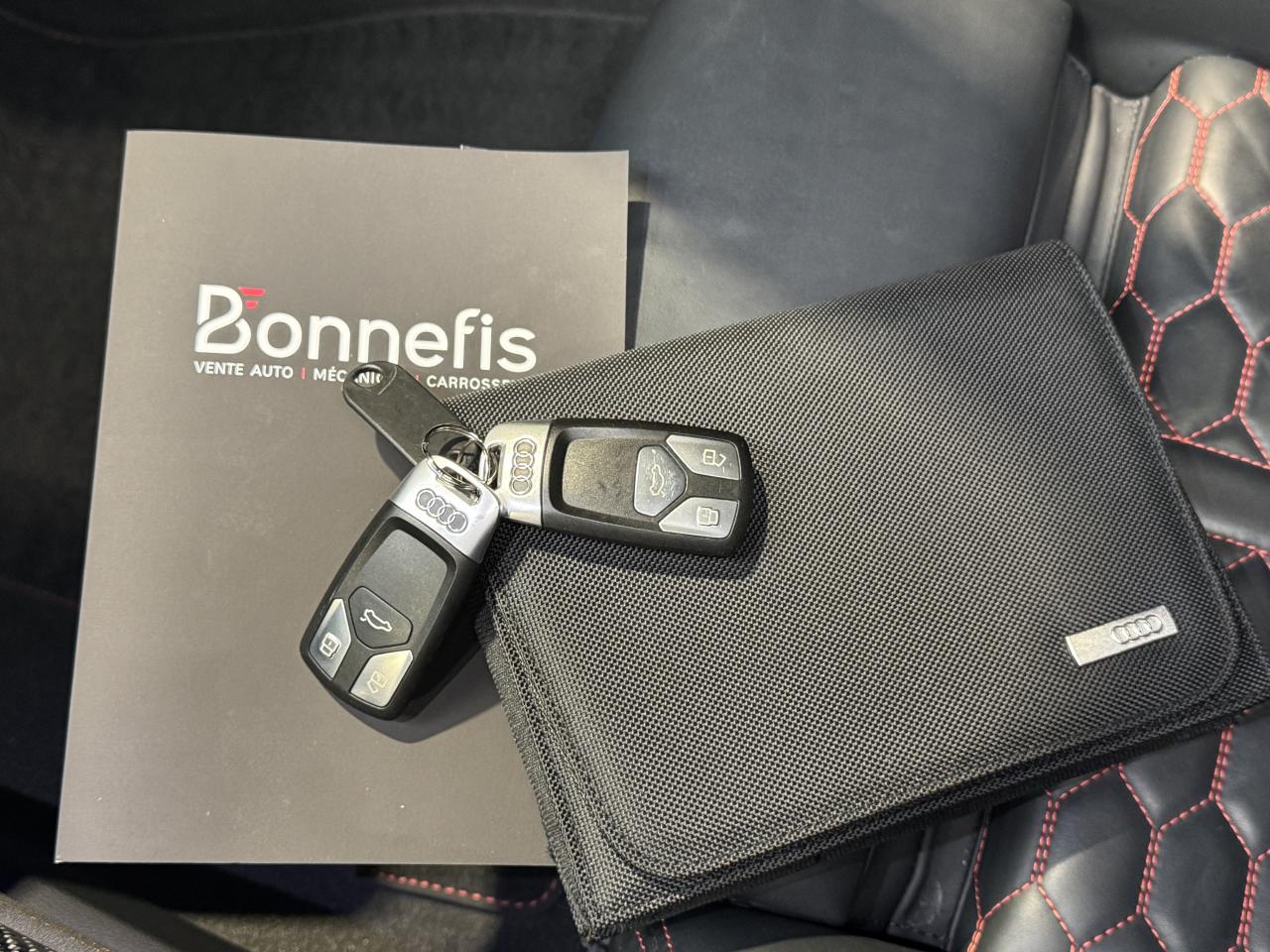 Nombreuses options : GPS, caméra de recul, radars avants et arrières de détection d'obstacles, Jantes aluminium forgé, 5 branches doubles Edge noir anthracite brillant, fraisées brillant, 20" ( 2 308 € ), Châssis Sport RS plus avec Dynamic Ride Control (DRC) réglable sur 3 niveaux: comfort, auto, dynamic ( 2 000 € ), Vitesse maximale relevée à 280km/h ( 1 500 € ), Toit panoramique ( 1 458 € ), Différentiel Quattro Sport, répartition dynamique de couple droite/gauche sur l'essieu AR ( 1 358 € ), Echappement Sport RS incluant sonorité encore plus travaillée et sorties d'échappement noires ( 1 250 € ), Applications décoratives en Carbone ( 1 000 € ), Affichage tête haute ( 991 € ), Sellerie en cuir Nappa fin ( 875 € ), Bang & Olufsen Sound System avec son en 3D ( 858 € ), Vitres surteintées (Privacy glass) : vitrage acoustique pour les vitres de portières AV, ainsi que vitres latérales AR et lunette AR surteintées ( 483 € ), Clé confort + Alarme antivol avec fonction safelock ( 483 € ), Etriers de frein laqués rouge brillant avec inscription RS à l'AV et à l'AR ( 400 € ), Réception radio numérique (DAB) ajoute à l'offre de radios analogiques la réception de stations numériques selon le standard DAB, incluant DAB+ et DMB Audio ( 341 € ), Sièges AV et AR chauffants (chauffe la partie centrale des assises et des dossiers, ainsi que les bourrelets latéraux) ( 333 € ), Système de contrôle de pression des pneus : les pressions et températures de chaque roue peuvent s’afficher sur l'Audi virtual cockpit ( 250 € ), Commande d'ouverture de porte de garage (HomeLink) ( 237 € ), Coffre : système de glissières avec kit de fixation et barre télescopique, sangle de maintien et 4 oeilletons de fixation ( 208 € ), Coques de rétroviseurs extérieurs en couleur carrosserie ( 108 € ), Audi Hold Assist maintient le véhicule à l'arrêt aussi bien en côte qu’en descente au sein de la circulation routière, sans limite de temps ( 83 € ), Rideaux pare-soleil manuels pour les vitres latérales AR ( 54 € ), Adaptive Cruise Control Stop & Go avec assistant embouteillage ( ACC / Active Cruise Control ), Assistant de conduite efficiente, Audi Pre Sense Front avec Assistant d'évitement collision et Assistant changement direction, Augmentation de la vitesse de pointe à 280 km/h, Becquet AV, encadrement de la calandre, baguettes décoratives sur les vitres latérales, diffuseur AR en noir brillant, Boîte à gants verrouillable, Direction Dynamique, Filet dans le logement gauche et sangles de serrage à gauche et à droite (dans le coffre), Filet de coffre, Filet de rangement au dos des sièges AV, Pack Audi Lane Assist, Phares Audi Matrix LED, Porte-boissons dans l'accoudoir central AR, Quattro avec différentiel Sport, Rampes de pavillon Noires, Système de lecture des panneaux de signalisation par caméra, Vide-poches côté conducteur...