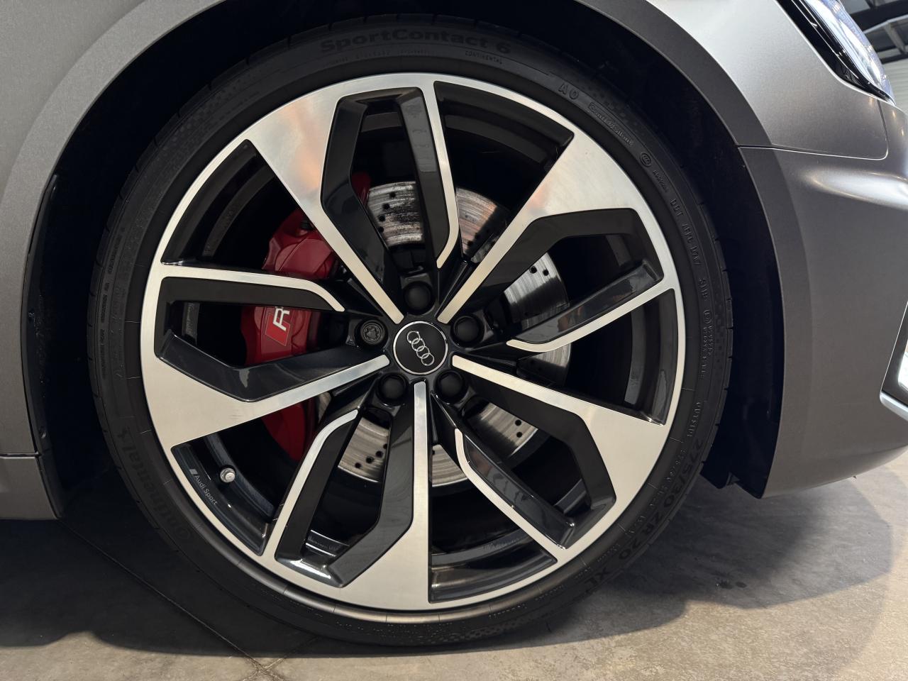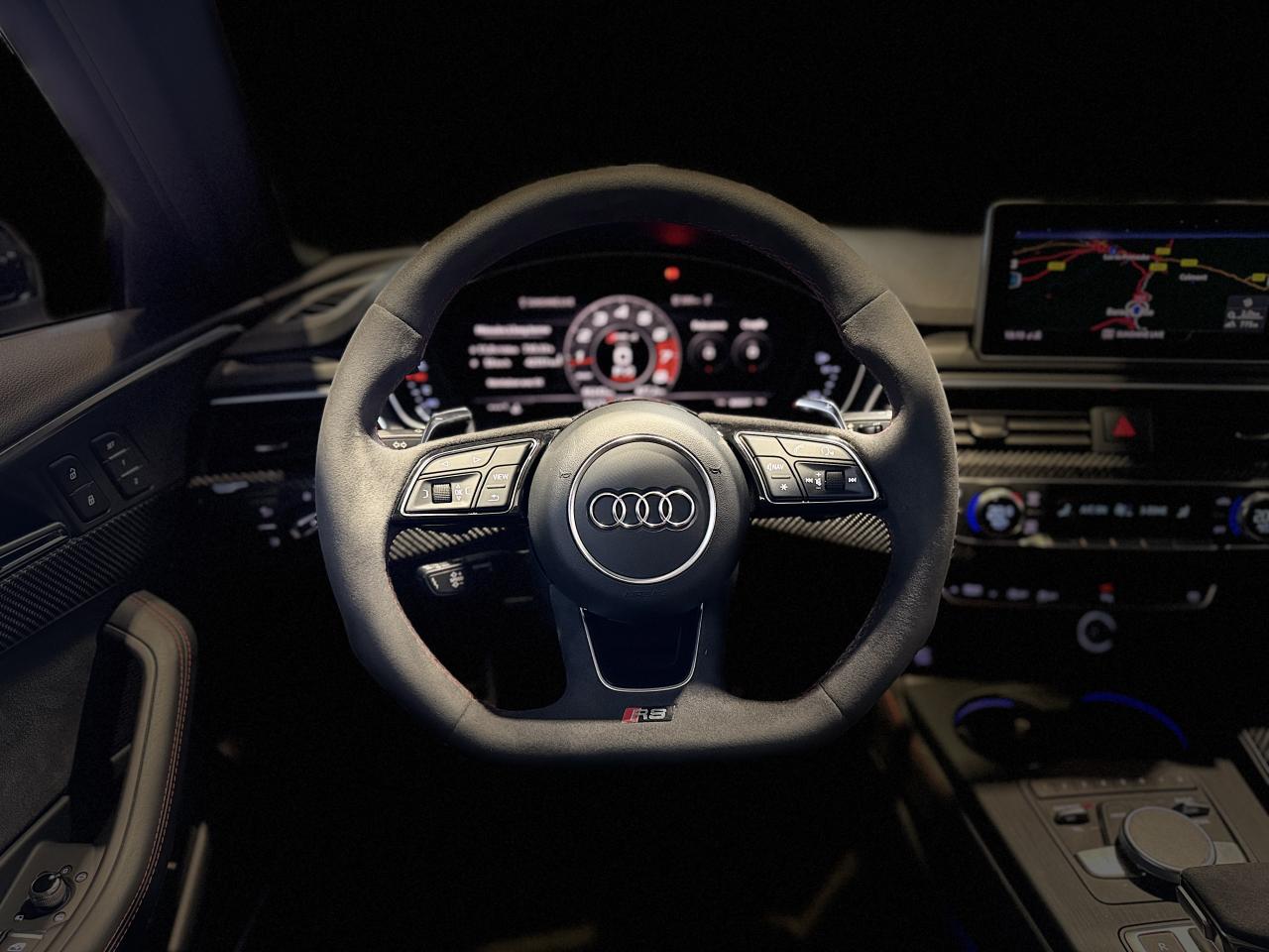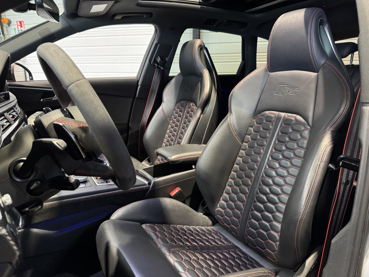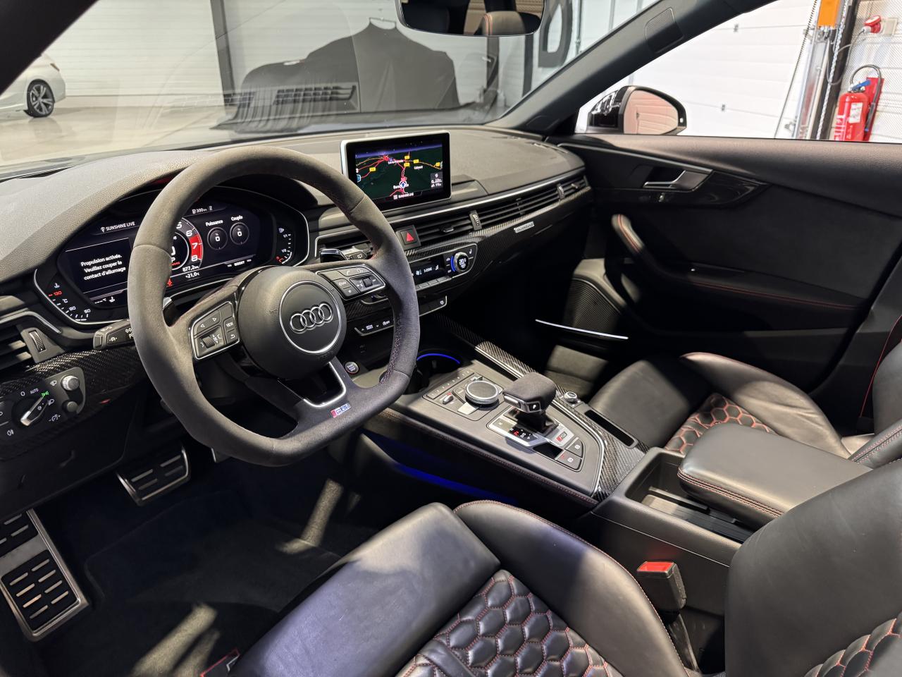 Nombreuses options : GPS, caméra de recul, radars avants et arrières de détection d'obstacles, Jantes aluminium forgé, 5 branches doubles Edge noir anthracite brillant, fraisées brillant, 20" ( 2 308 € ), Châssis Sport RS plus avec Dynamic Ride Control (DRC) réglable sur 3 niveaux: comfort, auto, dynamic ( 2 000 € ), Vitesse maximale relevée à 280km/h ( 1 500 € ), Toit panoramique ( 1 458 € ), Différentiel Quattro Sport, répartition dynamique de couple droite/gauche sur l'essieu AR ( 1 358 € ), Echappement Sport RS incluant sonorité encore plus travaillée et sorties d'échappement noires ( 1 250 € ), Applications décoratives en Carbone ( 1 000 € ), Affichage tête haute ( 991 € ), Sellerie en cuir Nappa fin ( 875 € ), Bang & Olufsen Sound System avec son en 3D ( 858 € ), Vitres surteintées (Privacy glass) : vitrage acoustique pour les vitres de portières AV, ainsi que vitres latérales AR et lunette AR surteintées ( 483 € ), Clé confort + Alarme antivol avec fonction safelock ( 483 € ), Etriers de frein laqués rouge brillant avec inscription RS à l'AV et à l'AR ( 400 € ), Réception radio numérique (DAB) ajoute à l'offre de radios analogiques la réception de stations numériques selon le standard DAB, incluant DAB+ et DMB Audio ( 341 € ), Sièges AV et AR chauffants (chauffe la partie centrale des assises et des dossiers, ainsi que les bourrelets latéraux) ( 333 € ), Système de contrôle de pression des pneus : les pressions et températures de chaque roue peuvent s’afficher sur l'Audi virtual cockpit ( 250 € ), Commande d'ouverture de porte de garage (HomeLink) ( 237 € ), Coffre : système de glissières avec kit de fixation et barre télescopique, sangle de maintien et 4 oeilletons de fixation ( 208 € ), Coques de rétroviseurs extérieurs en couleur carrosserie ( 108 € ), Audi Hold Assist maintient le véhicule à l'arrêt aussi bien en côte qu’en descente au sein de la circulation routière, sans limite de temps ( 83 € ), Rideaux pare-soleil manuels pour les vitres latérales AR ( 54 € ), Adaptive Cruise Control Stop & Go avec assistant embouteillage ( ACC / Active Cruise Control ), Assistant de conduite efficiente, Audi Pre Sense Front avec Assistant d'évitement collision et Assistant changement direction, Augmentation de la vitesse de pointe à 280 km/h, Becquet AV, encadrement de la calandre, baguettes décoratives sur les vitres latérales, diffuseur AR en noir brillant, Boîte à gants verrouillable, Direction Dynamique, Filet dans le logement gauche et sangles de serrage à gauche et à droite (dans le coffre), Filet de coffre, Filet de rangement au dos des sièges AV, Pack Audi Lane Assist, Phares Audi Matrix LED, Porte-boissons dans l'accoudoir central AR, Quattro avec différentiel Sport, Rampes de pavillon Noires, Système de lecture des panneaux de signalisation par caméra, Vide-poches côté conducteur...