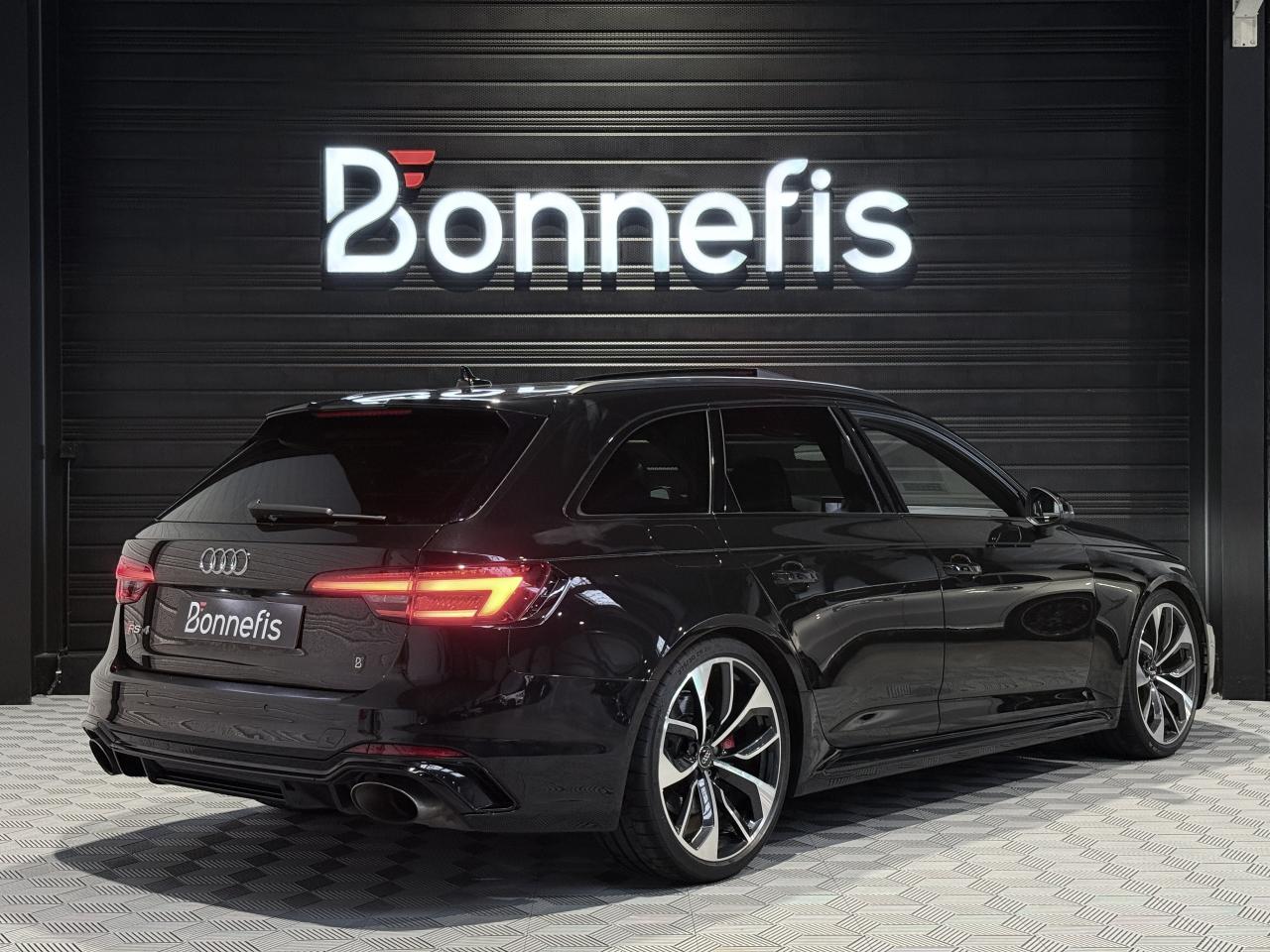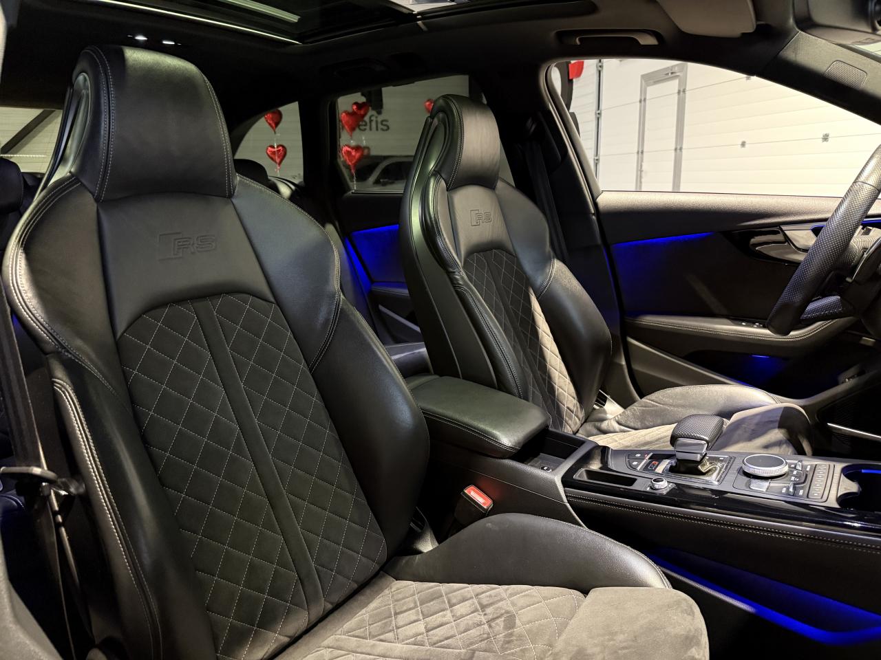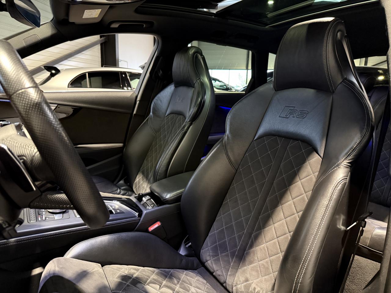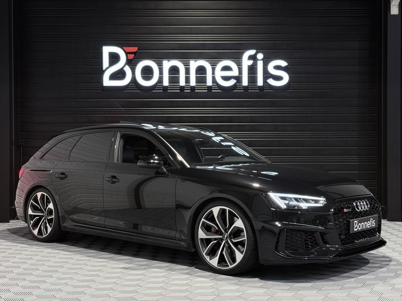 Audi RS4 Avant 2.9 V6 TFSI 450Ch Quattro Tiptronic 8, extérieur noir métallisée ( noir Mythic )( 841 € ), intérieur Sellerie Cuir Alcantara avec surpiqûres contrastées et embossé RS, 34 cv, 5 portes, première mise en circulation le 19/03/2018.