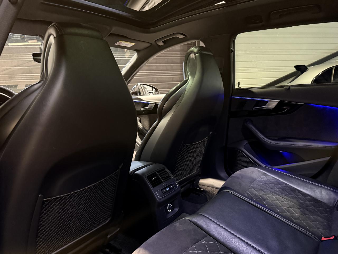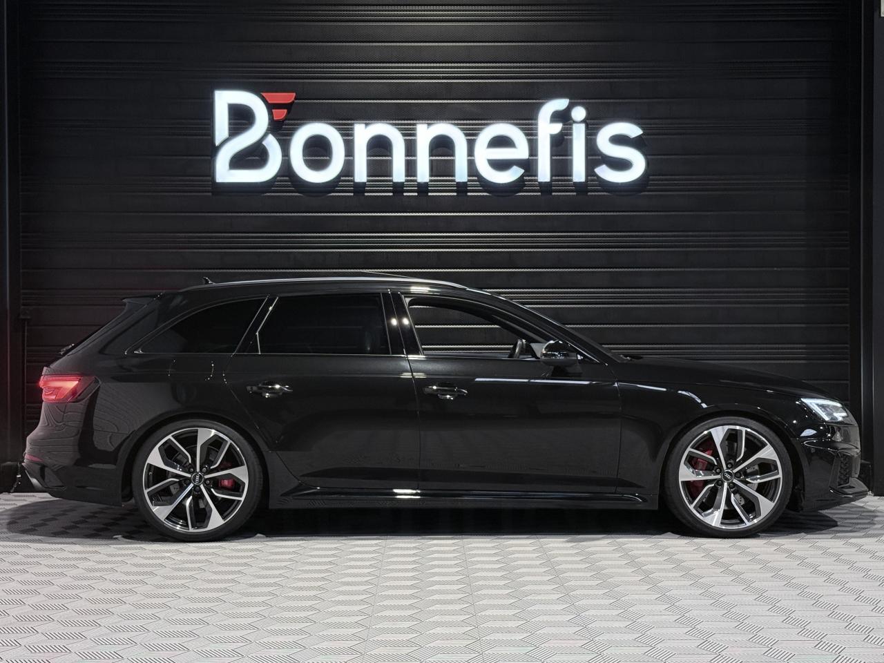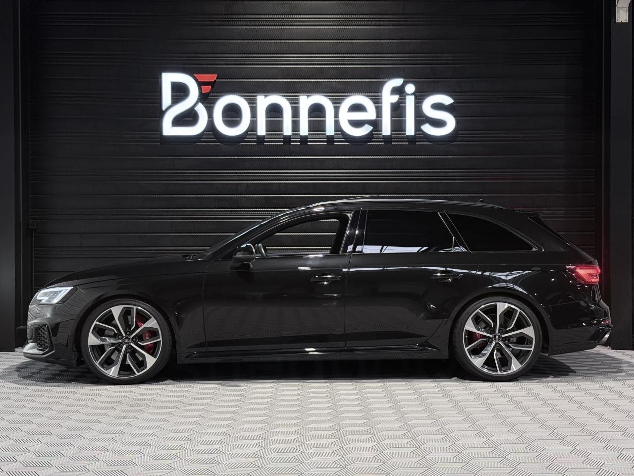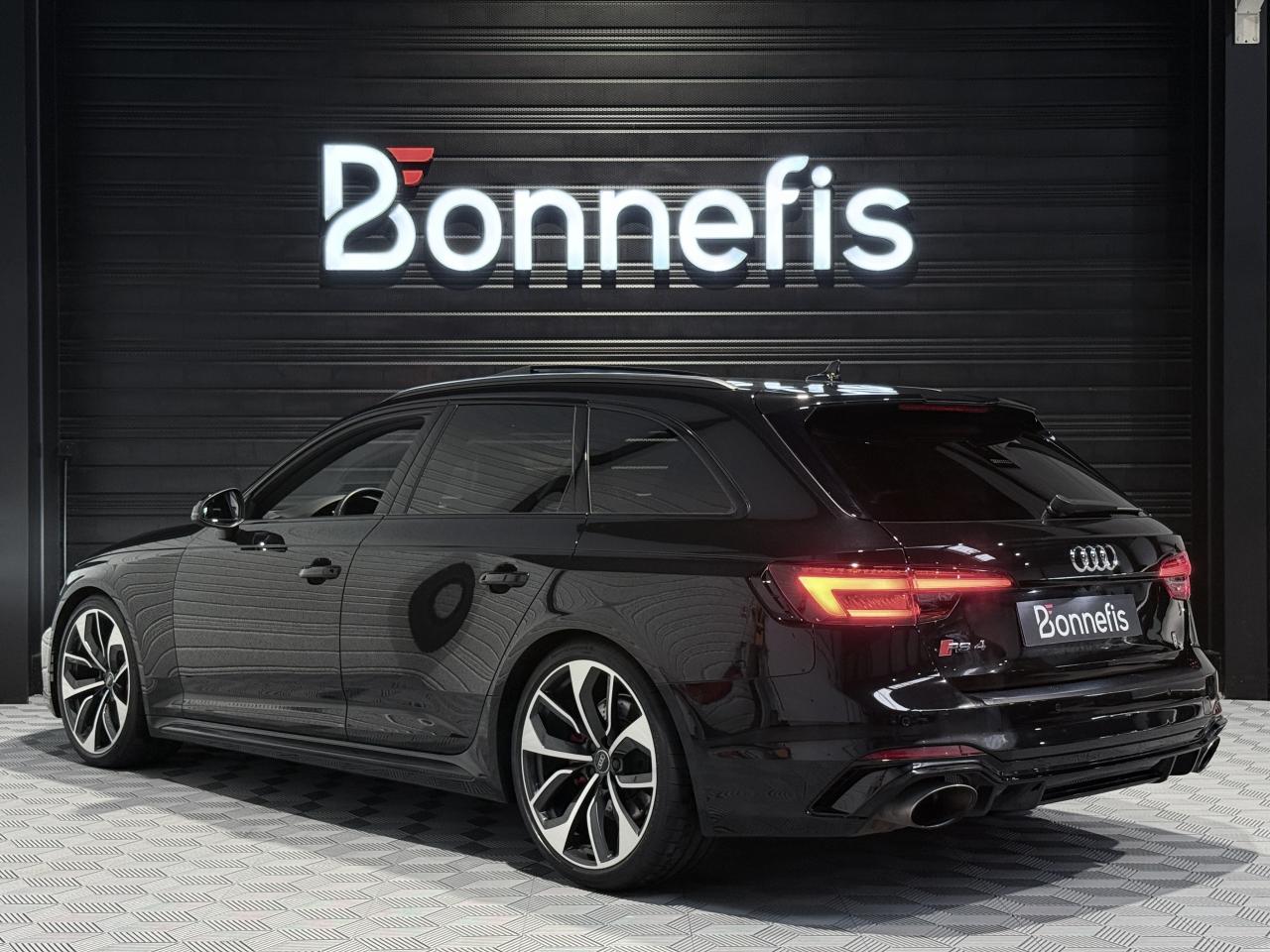 Audi RS4 Avant 2.9 V6 TFSI 450Ch Quattro Tiptronic 8, extérieur noir métallisée ( noir Mythic )( 841 € ), intérieur Sellerie Cuir Alcantara avec surpiqûres contrastées et embossé RS, 34 cv, 5 portes, première mise en circulation le 19/03/2018.