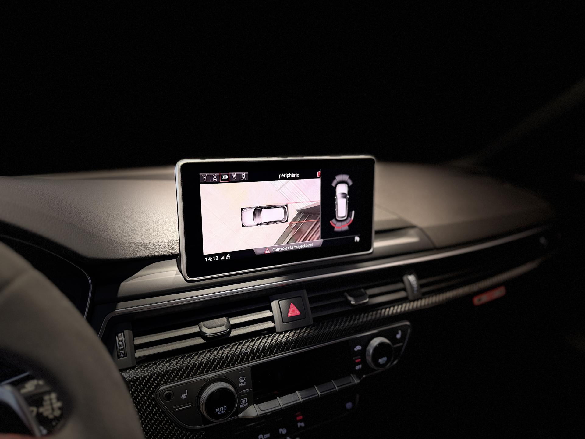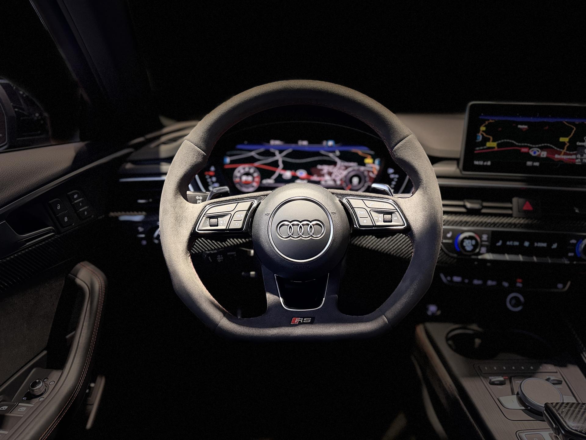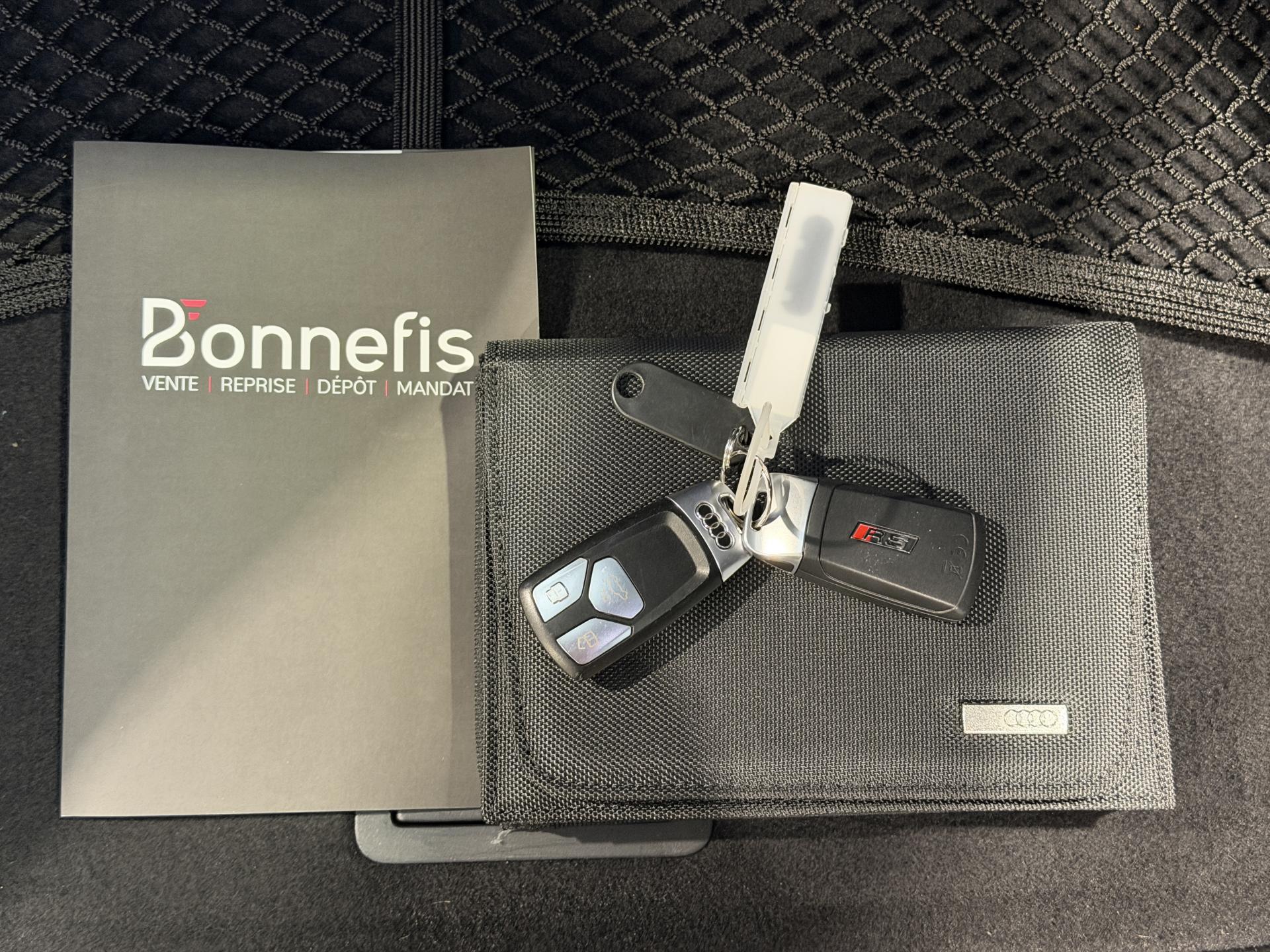 Nombreuses options : GPS, caméra périphériques à 360°, radars avants et arrières de détection d'obstacles, échappement Sport RS incluant sonorité encore plus travaillée et sorties d'échappement noires ( 1 250 € ), applications décoratives en Carbone ( 1 000 € ), affichage tête haute ( 991 € ), Bang & Olufsen Sound System avec son en 3D ( 858 € ), vitres surteintées (Privacy glass) : vitrage acoustique pour les vitres de portières AV, ainsi que vitres latérales AR et lunette AR surteintées ( 483 € ), réception radio numérique (DAB) ajoute à l'offre de radios analogiques la réception de stations numériques selon le standard DAB, incluant DAB+ et DMB Audio ( 341 € ), anneaux Audi et monogrammes en Noir Brillant ( 308 € ), coques de rétroviseurs extérieurs en couleur carrosserie ( 108 € ), fixation pour sièges enfants ISOFIX pour le siège passager AV avec commande de sécurité enfant électrique sur les portières AR et commande de désactivation de l’airbag passager AV ( 83 € ), Audi Hold Assist maintient le véhicule à l'arrêt aussi bien en côte qu’en descente au sein de la circulation routière, sans limite de temps ( 83 € ), Audi Park Assist incluant Audi Parking System Plus, Audi Pre Sense Front avec Assistant d'évitement collision et Assistant changement direction, châssis Sport RS plus avec Dynamic Ride Control (DRC) réglable sur 3 niveaux: comfort, auto, dynamic, Quattro avec différentiel Sport, différentiel Quattro Sport, répartition dynamique de couple droite/gauche sur l'essieu AR, direction Dynamique, Pack Audi Lane Assist, Adaptive Cruise Control Stop & Go avec assistant embouteillage ( ACC / Active Cruise Control ), Phares Audi Matrix LED, augmentation de la vitesse de pointe à 280 km/h, becquet AV, inserts dans les bas de caisse, becquet AR et insert dans le diffuseur AR en carbone, encadrement de calandre, lame AV et baguettes décoratives sur les vitres latérales, partie centrale du diffuseur AR en noir brillant et rampes de pavillon noir mat, rampes de pavillon Noires, système de lecture des panneaux de signalisation par caméra, assistant de conduite efficiente, Audi Park Assist, porte-boissons dans l'accoudoir central AR, 3 profils de couleur prédéfinis et un profil de couleur personnalisable via l'Audi drive select aux parties suivantes : porte-boissons à l'AV, zone des pieds à l’AV, vide-poches de portières et éclairage d'ambiance des portières, filet dans le logement gauche et sangles de serrage à gauche et à droite (dans le coffre), filet de coffre, filet de rangement au dos des sièges AV, vide-poches côté conducteur, boîte à gants verrouillable, ...