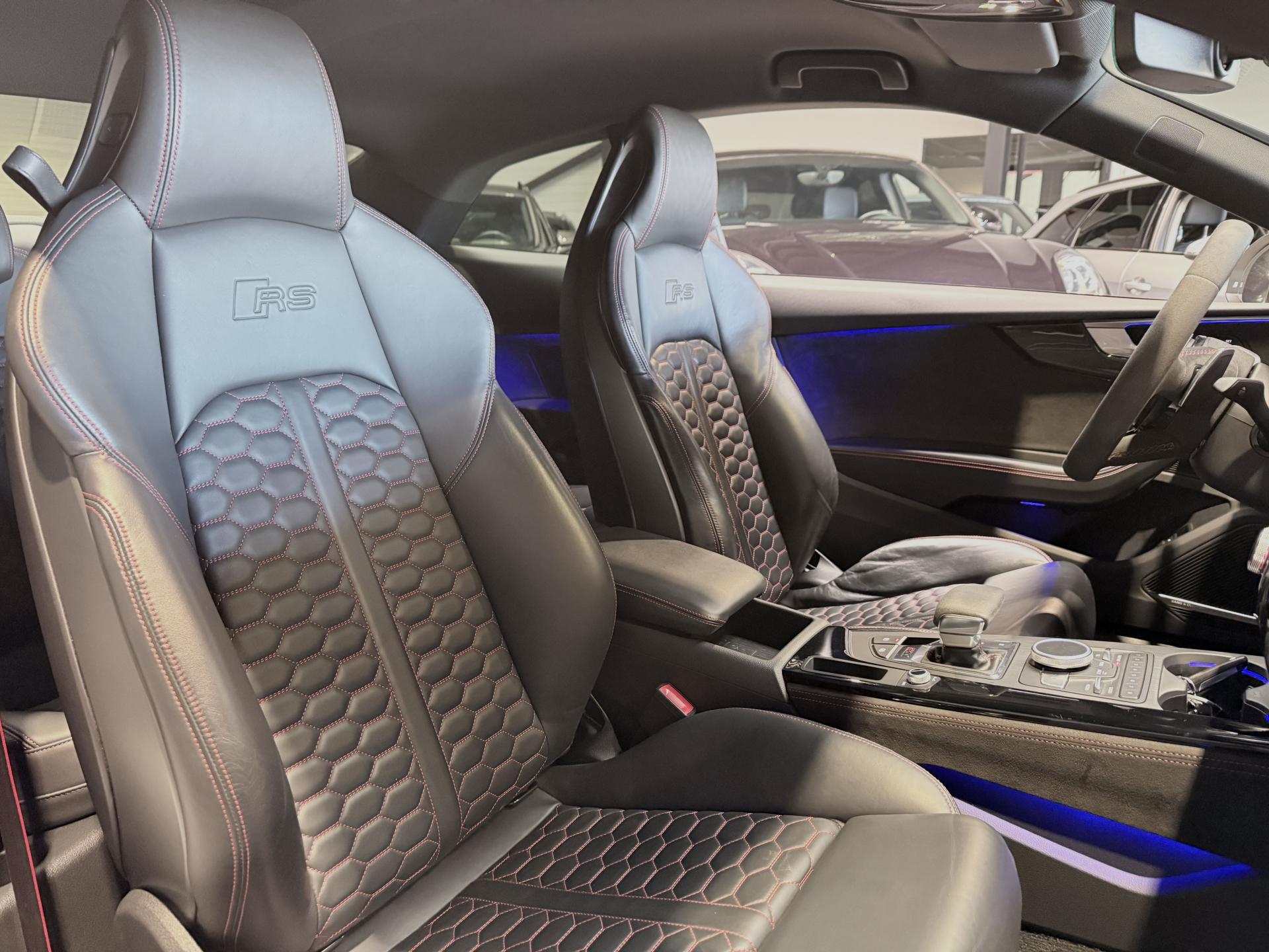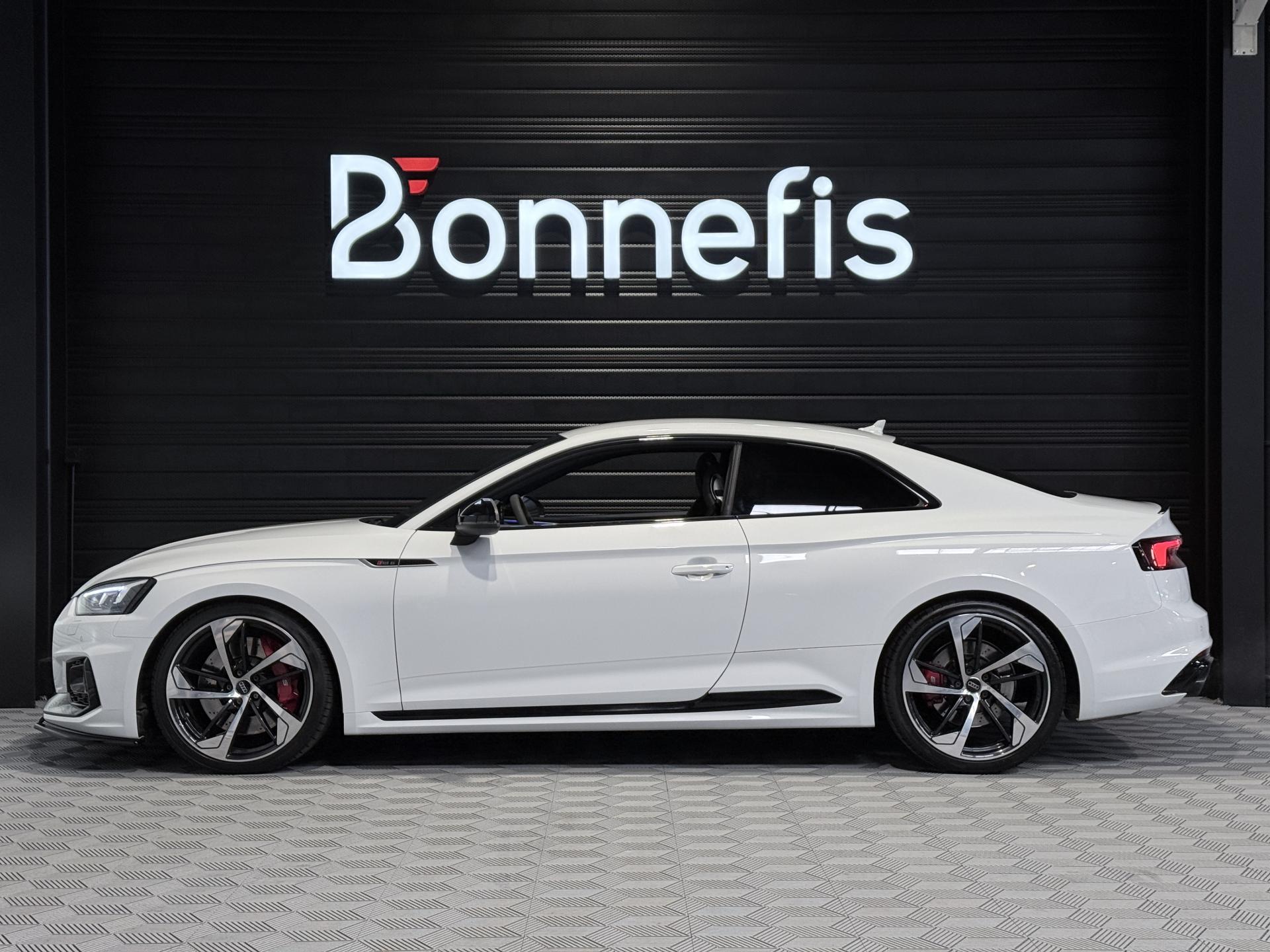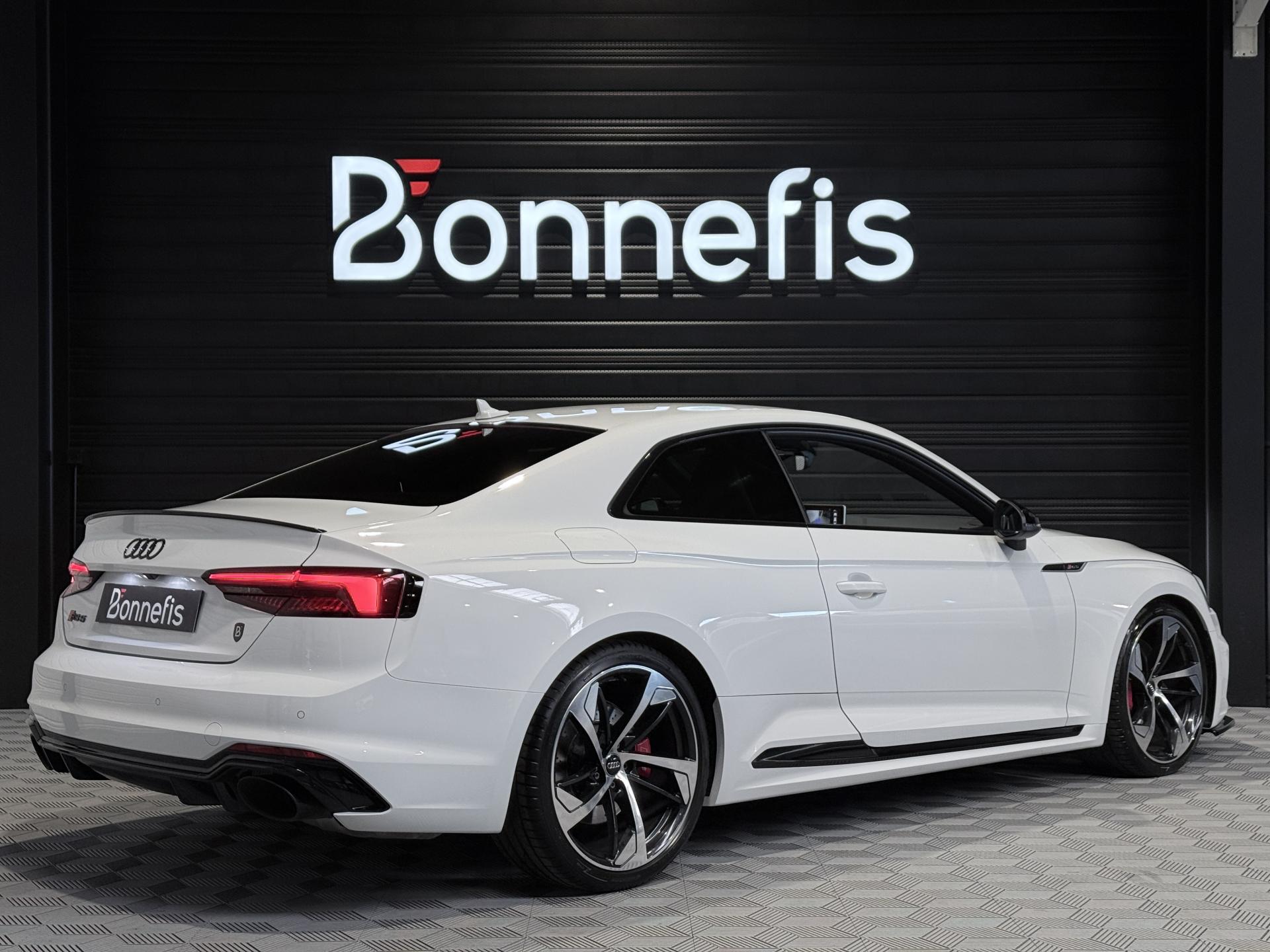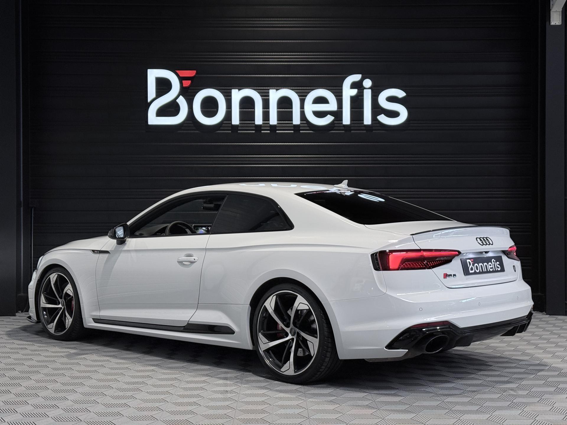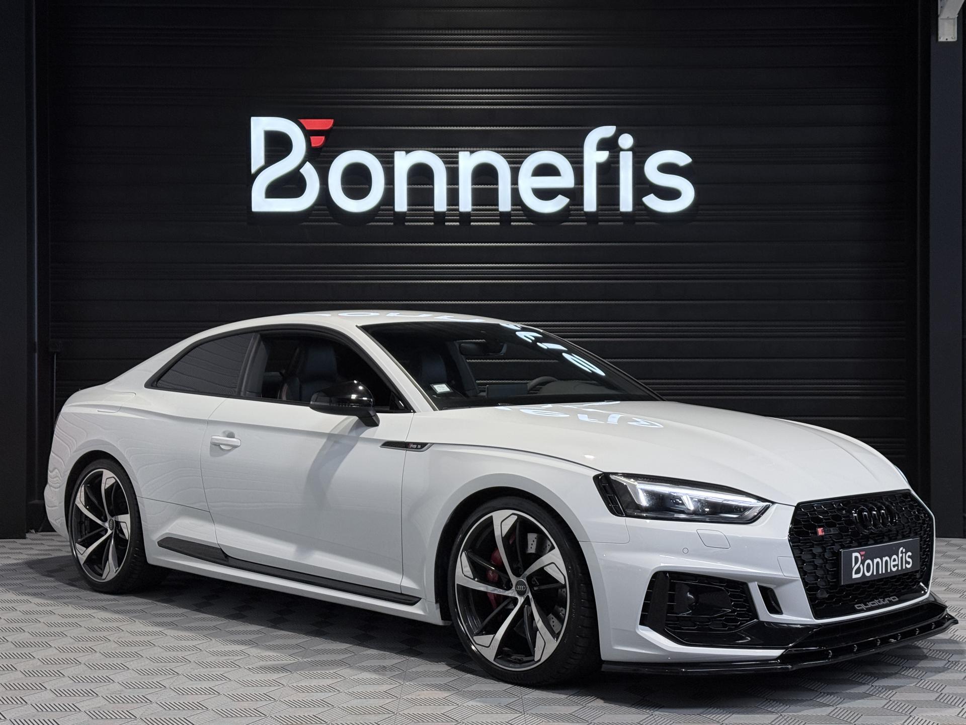 AUDI RS5 Coupé 2.9 V6 TFSi 450Ch BVA Tiptronic 8 Quattro, extérieur Blanc ( blanc Glacier métallisée ) ( 841 EUR ), intérieur Noir ( Sellerie en cuir Nappa fin noir ) ( 875 EUR ), 34 cv, 2 portes, première mise en circulation le 06/02/2018.