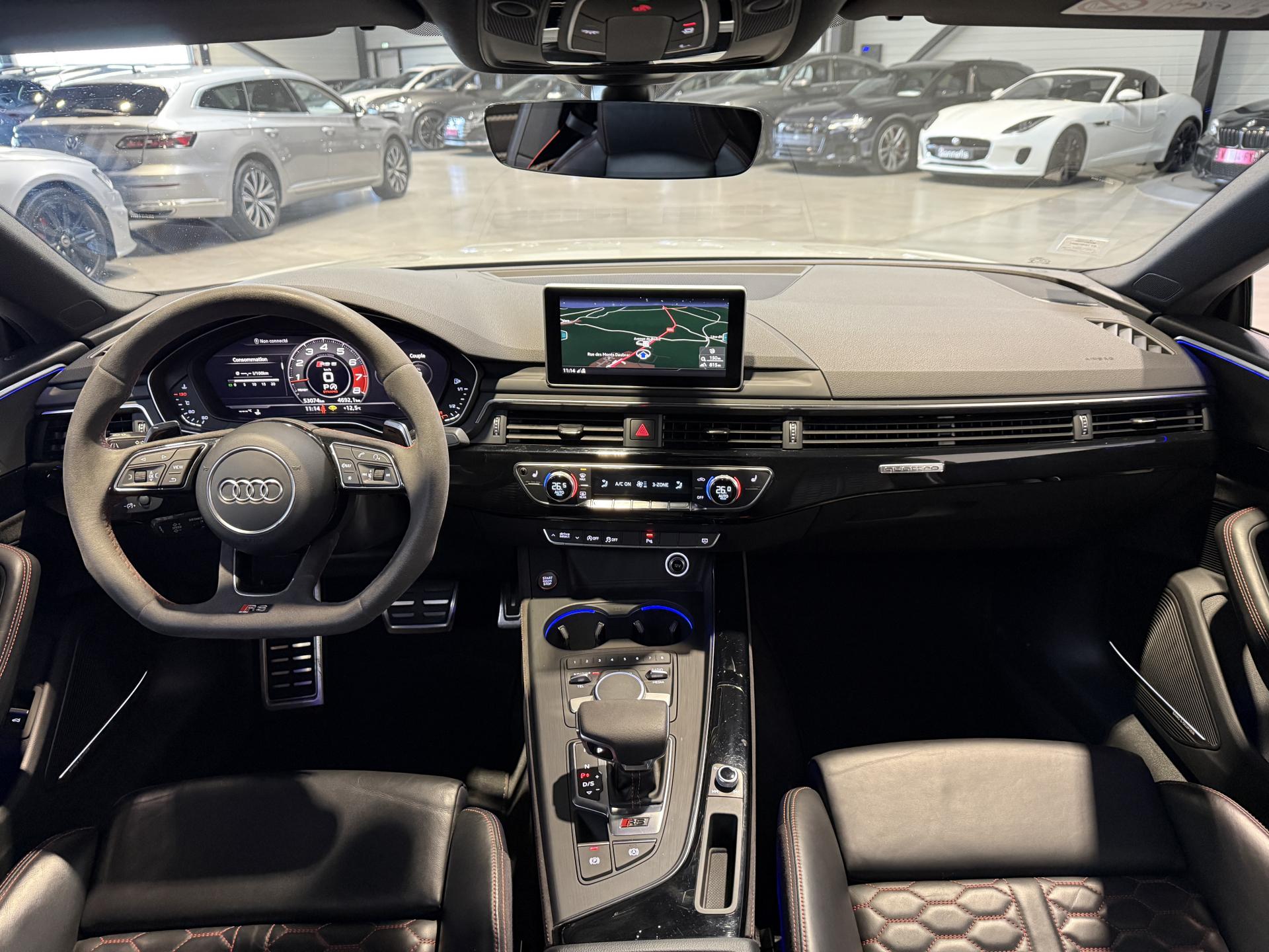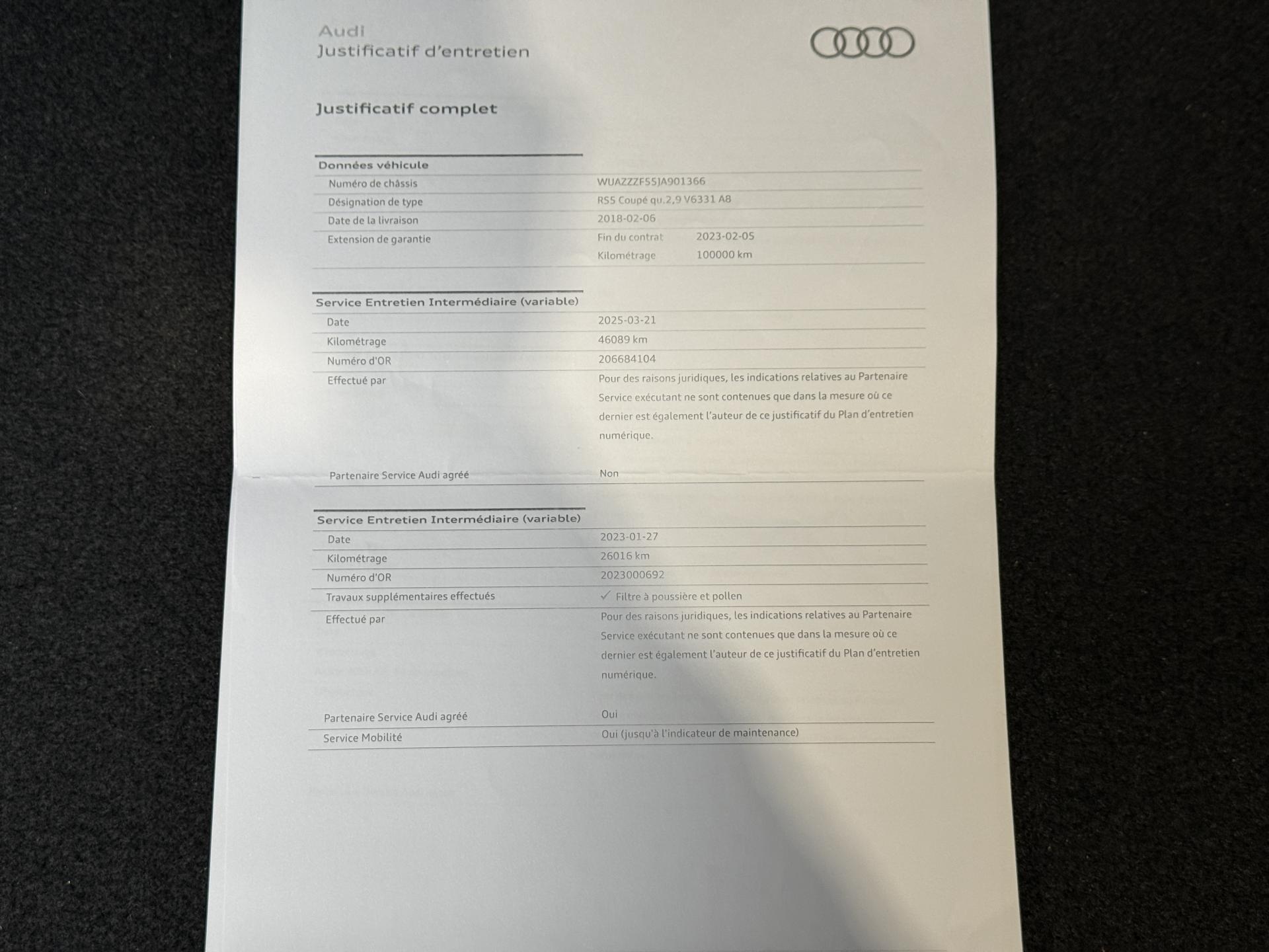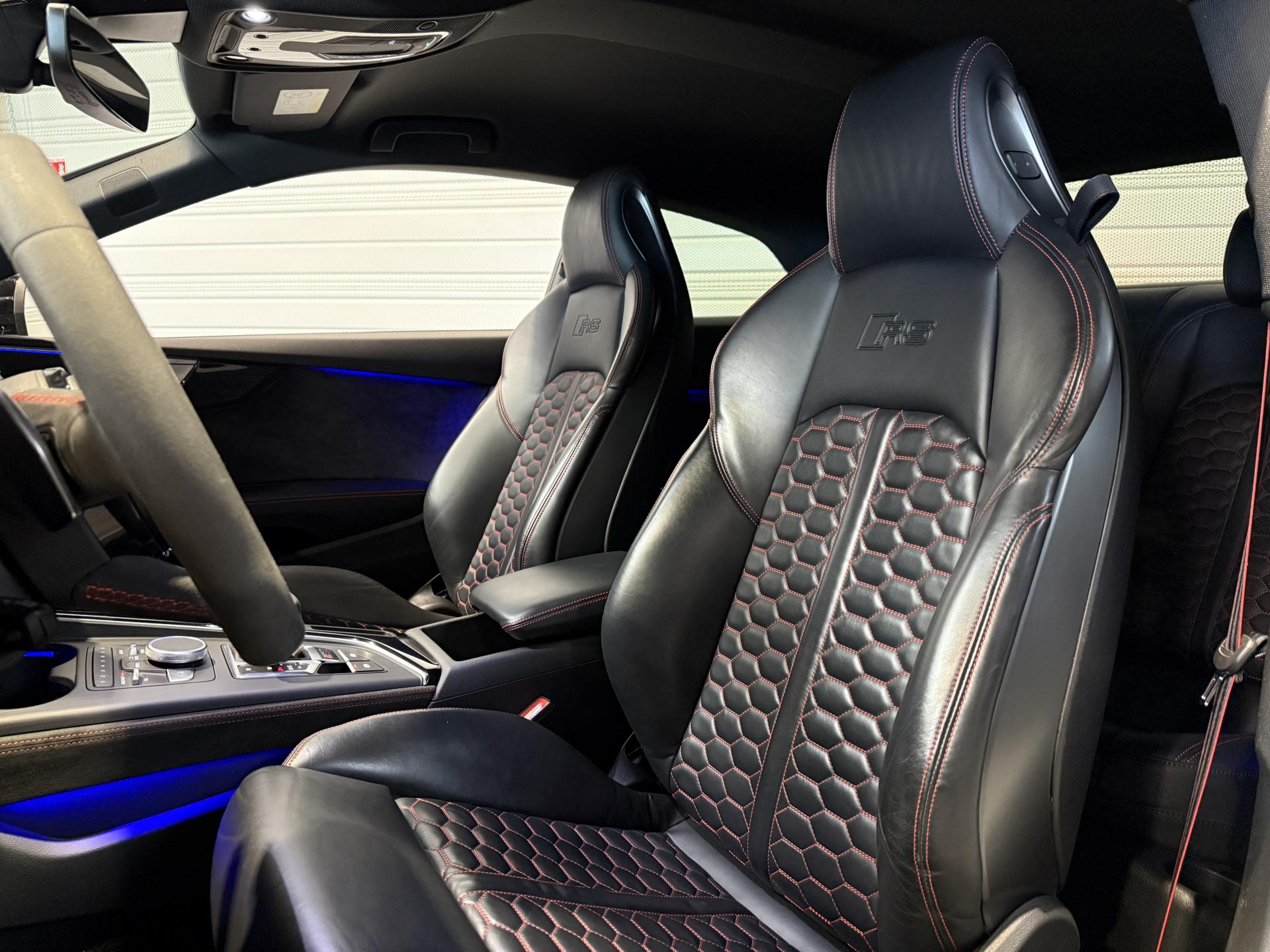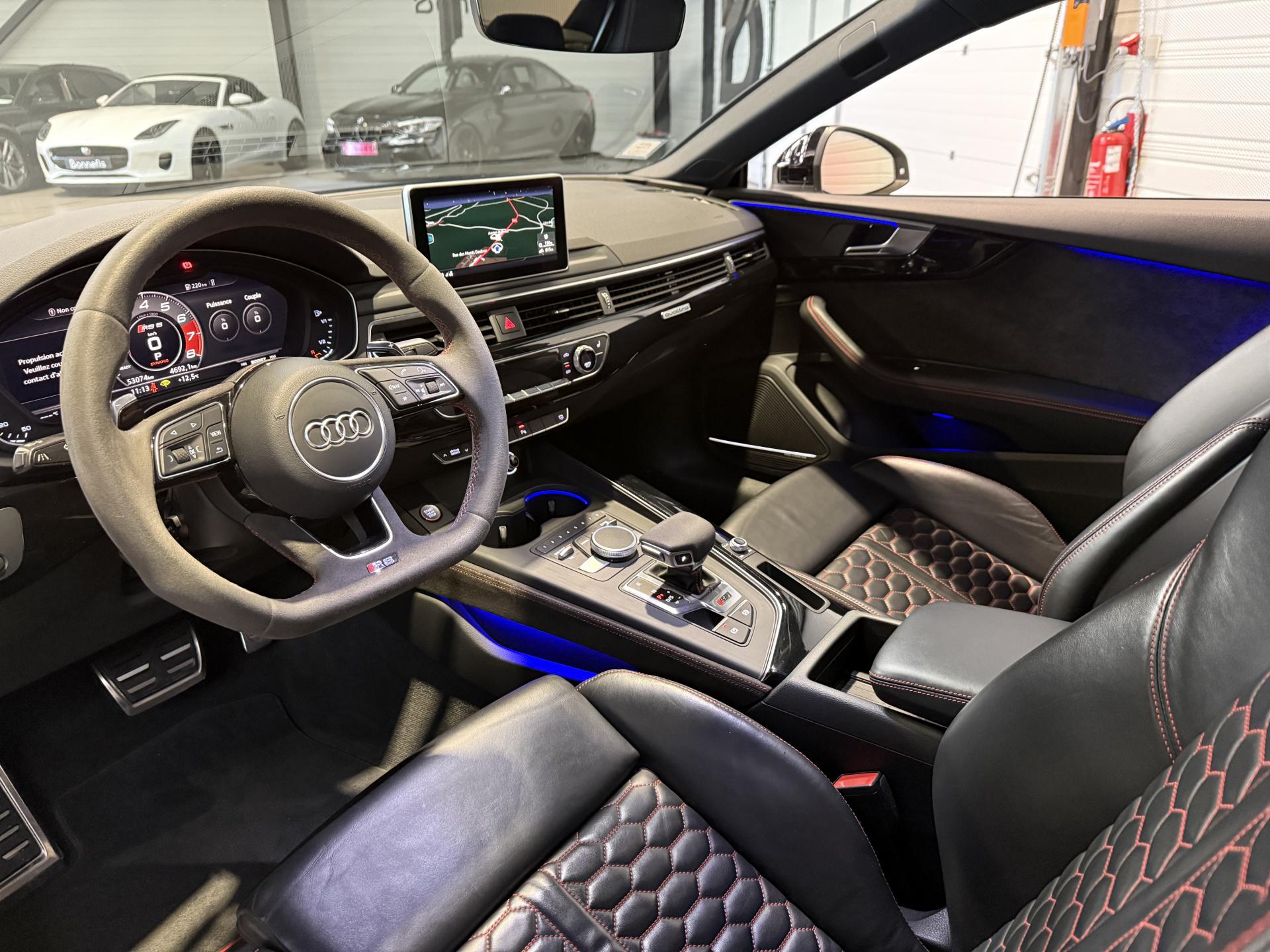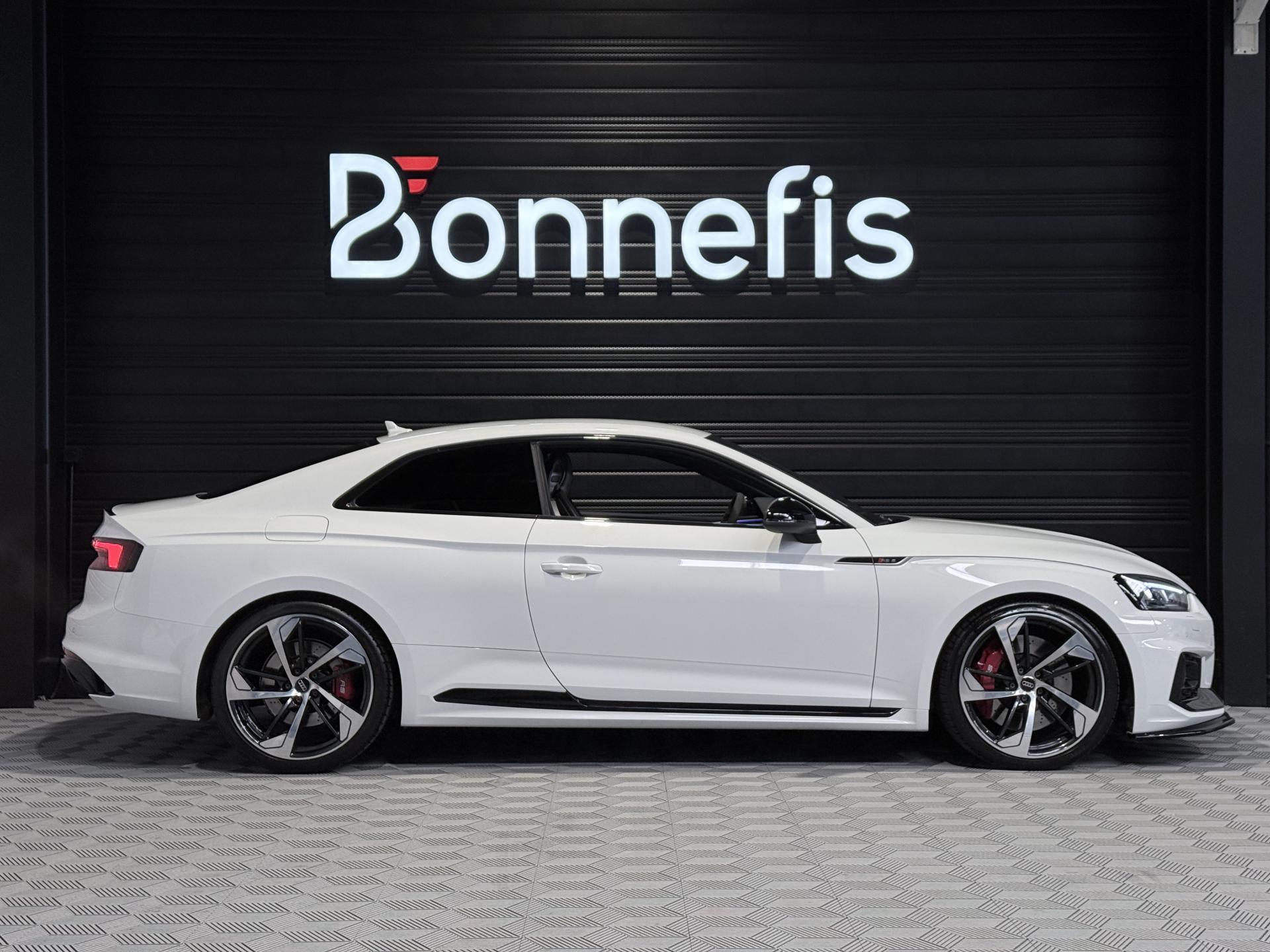 AUDI RS5 Coupé 2.9 V6 TFSi 450Ch BVA Tiptronic 8 Quattro, extérieur Blanc ( blanc Glacier métallisée ) ( 841 EUR ), intérieur Noir ( Sellerie en cuir Nappa fin noir ) ( 875 EUR ), 34 cv, 2 portes, première mise en circulation le 06/02/2018.