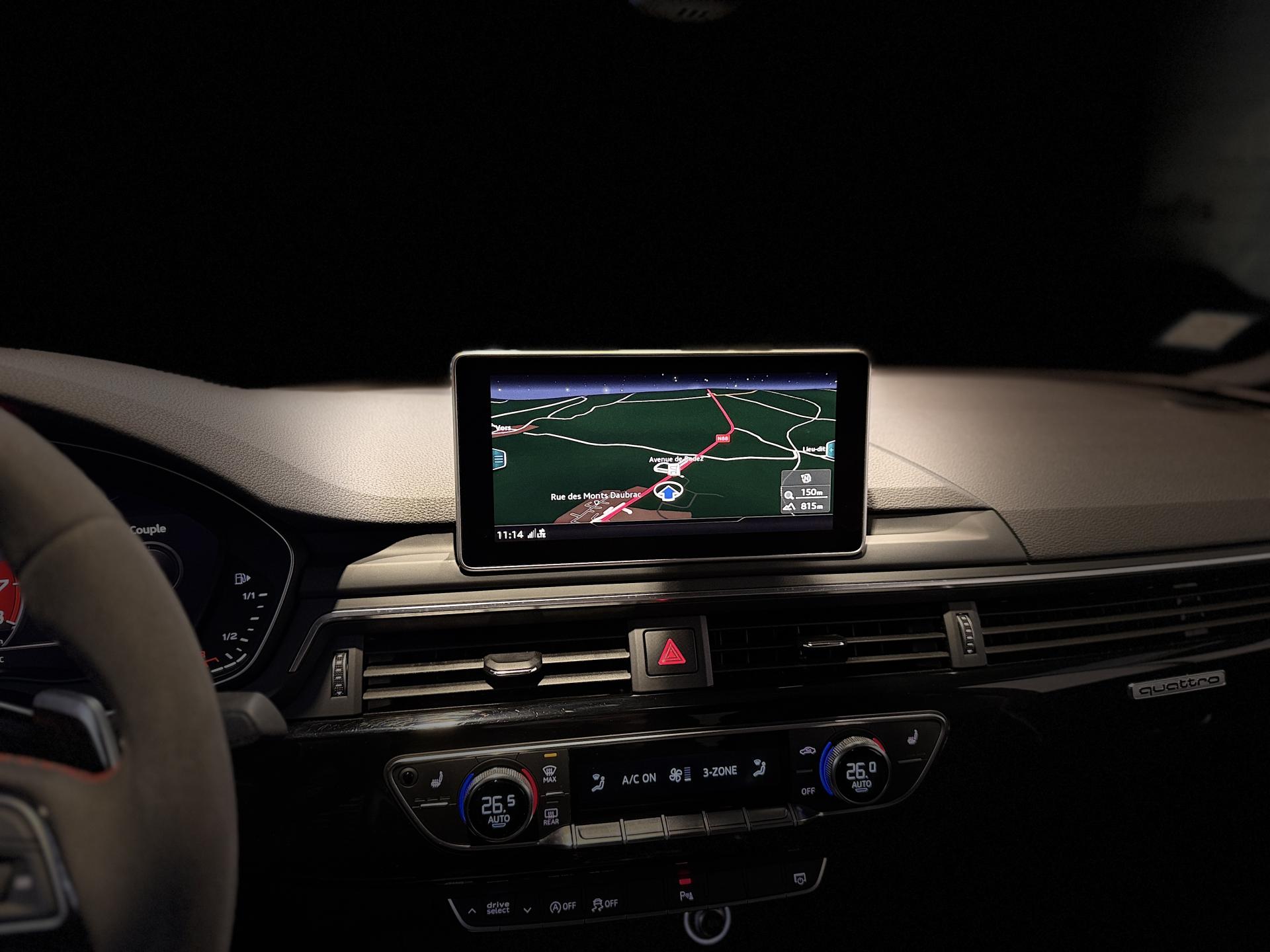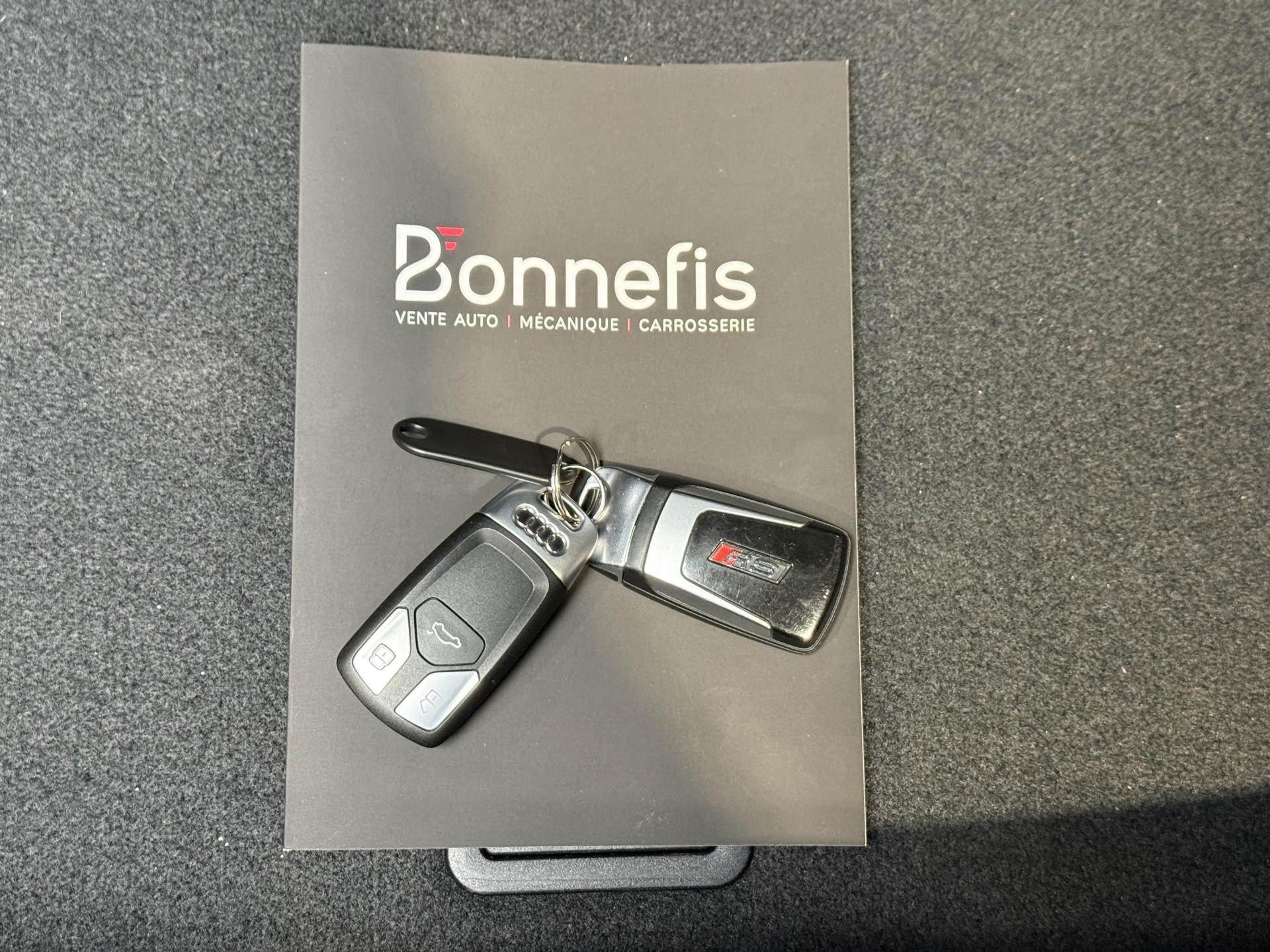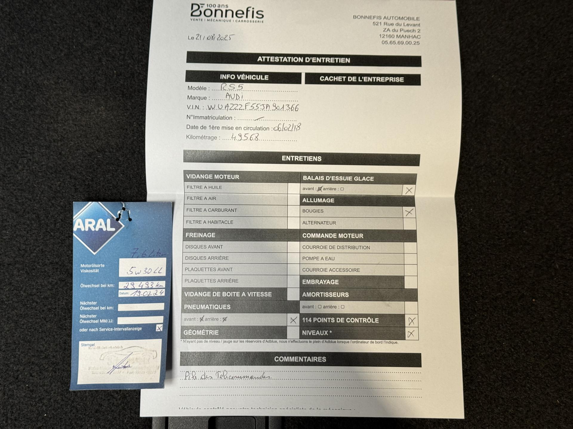 Nombreuses options : GPS, caméra de recul, radars avants et arrières de détection d'obstacles, Vitesse maximale relevée à 280km/h ( 1 500 EUR ), Différentiel Quattro Sport ( 1 358 EUR ), Jantes aluminium forgé, 5 branches trapézoïdales, noir anthracite brillant 20 ( 1 375 EUR ), Echappement Sport incluant sonorité encore plus travaillée et sorties d'échappement noires ( 1 250 EUR ), Bang & Olufsen Sound System avec son en 3D ( 858 EUR ), Clé confort + Alarme antivol avec fonction safelock +fonction d'ouverture du coffre à l'aide du pied ( 483 EUR ), Vitres surteintées (Privacy Glass) ( 425 EUR ), Réception radio numérique (DAB) ( 341 EUR ), Etriers de frein laqués rouge brillant avec inscription RS à l'AV et à l'AR ( 308 EUR ), Système de lecture des panneaux de signalisation par caméra ( 308 EUR ), Applications décoratives en Piano laqué noir ( 216 EUR ), Coques de rétroviseurs noir brillant ( 108 EUR ), Accoudoirs de porte en cuir Nappa fin noir avec surpiqûres rouge Dynamite, Active Lane Assist, Adaptive Cruise Control stop & go avec Assistant de conduite en embouteillage, Assistant de conduite efficiente, Audi Pre Sense Front avec Assistant d'évitement collision et Assistant changement direction, Augmentation de la vitesse de pointe à 280 km/h, Baguettes décoratives sur les vitres latérales noires, Becquet AV, Becquet AV en noir brillant, Ceintures de sécurité noires avec bordure rouge, Châssis Sport RS plus avec Dynamic Ride Control (DRC) réglable sur 3 niveaux: comfort, auto, dynamic, Diffuseur AR noir brillant, Direction Dynamique, Eléments de commande et repose genoux en Alcantara noir avec surpiqûres rouge Dynamite, Encadrement de calandre noir brillant, Lecture des panneaux de signalisation, Pack Eclairage, Phares Audi Matrix LED, Quattro avec différentiel Sport : sur la base d?une transmission intégrale permanente quattro à répartition asymétrique et dynamique du couple, le différentiel Sport régulé électroniquement répartit différemment la pu, Tapis de sol noir avec surpiqûres rouge Dynamite et inscription RS AV, ...