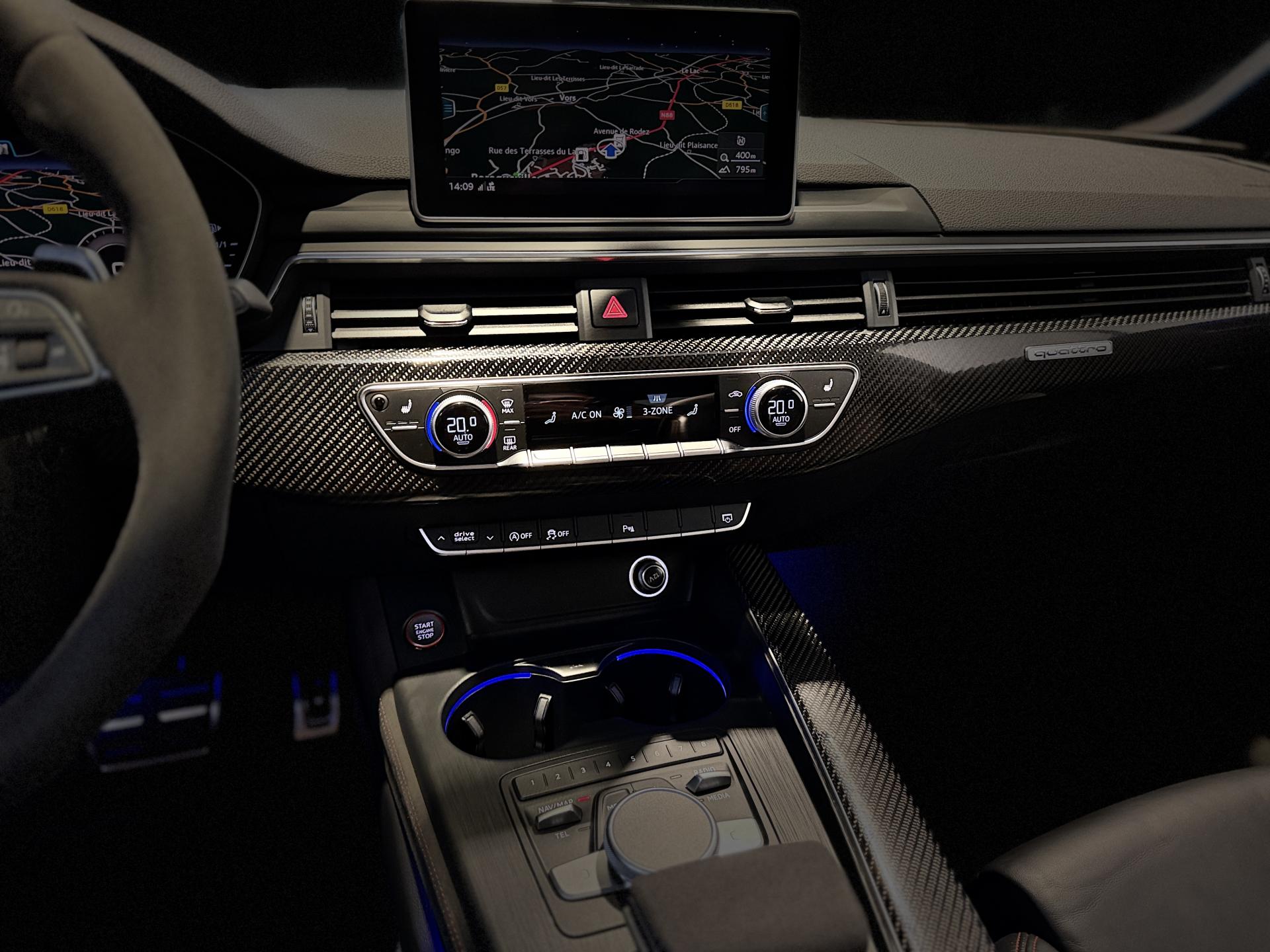Nombreuses options : GPS, caméra de recul, radars avants et arrières de détection d'obstacles, freins céramique 19" renforcés de fibres de carbone à l'AV : étriers laqués gris anthracite brillant à l'AV, avec inscription Audi céramique à l'AV et RS à l'AR ( 6 083 € ), différentiel Quattro Sport ( 1 358 € ), vitesse maximale relevée à 280km/h ( 1 500 € ), toit ouvrant coulissant/relevable électriquement en verre de sécurité, teinté et pare-soleil réglable en continu ( 1 300 € ), jantes aluminium forgé, 5 branches trapézoïdales, noir anthracite brillant 20'' ( 1 375 € ), échappement Sport incluant sonorité encore plus travaillée et sorties d'échappement noires ( 1 250 € ), applications décoratives en Carbone ( 1 000 € ), affichage tête haute ( 991 € ), système de lecture des panneaux de signalisation par caméra ( 308 € ), coques de rétroviseurs noir brillant ( 108 € ), vitres surteintées (Privacy Glass) ( 425 € ), châssis Sport RS plus avec Dynamic Ride Control (DRC) réglable sur 3 niveaux: comfort, auto, dynamic, direction Dynamique, phares Audi Matrix LED, pack Eclairage, Quattro avec différentiel Sport : sur la base d’une transmission intégrale permanente quattro à répartition asymétrique et dynamique du couple, le différentiel Sport régulé électroniquement répartit différemment la puissance, 3 profils de couleur prédéfinis et un profil de couleur personnalisable via l'Audi drive select aux parties suivantes : porte-boissons à l'AV, zone des pieds à l’AV, vide-poches de portières et éclairage d'ambiance des portières, accoudoirs de porte en cuir Nappa fin noir avec surpiqûres rouge Dynamite, ceintures de sécurité noires avec bordure rouge, éléments de commande et repose genoux en Alcantara noir avec surpiqûres rouge Dynamite, tapis de sol noir avec surpiqûres rouge Dynamite et inscription RS AV, becquet AV en noir brillant, diffuseur AR noir brillant, encadrement de calandre noir brillant, baguettes décoratives sur les vitres latérales noires, ...