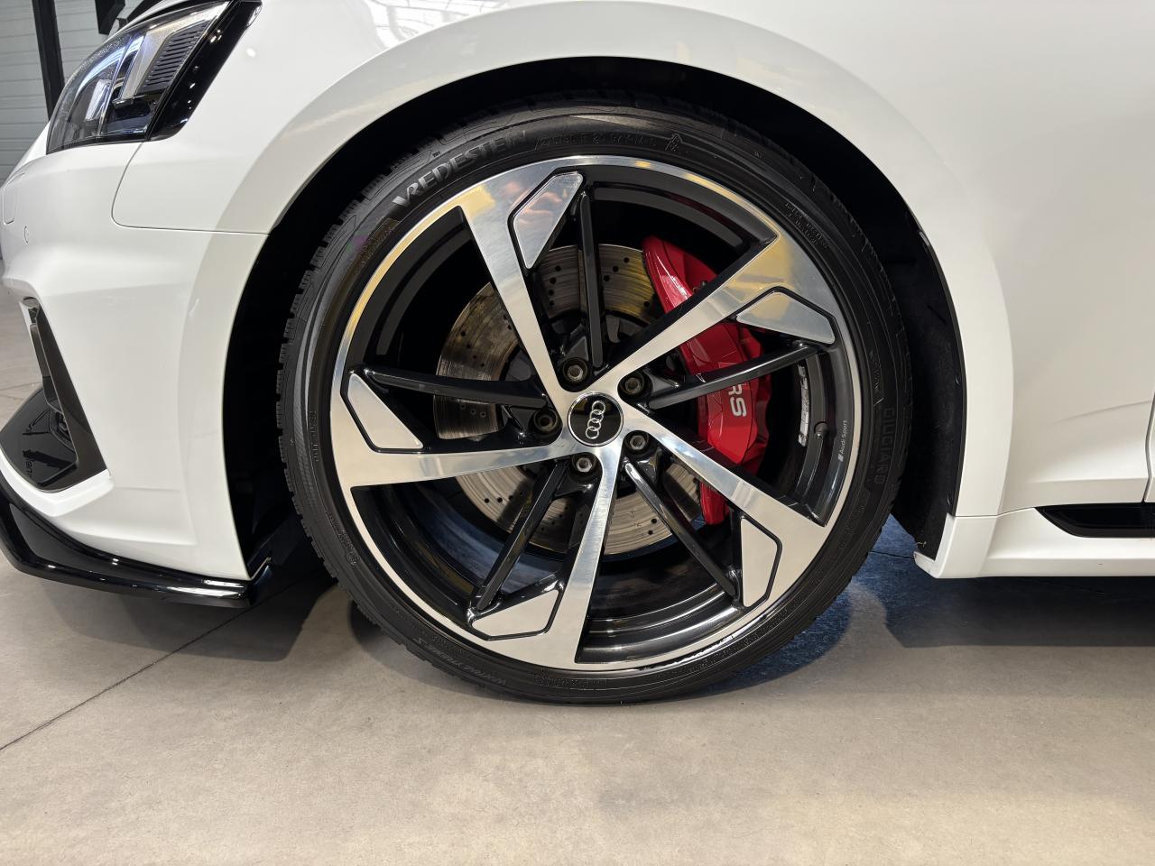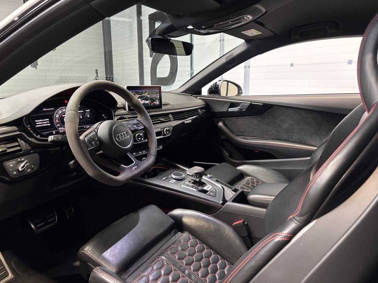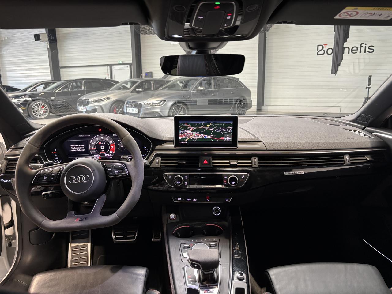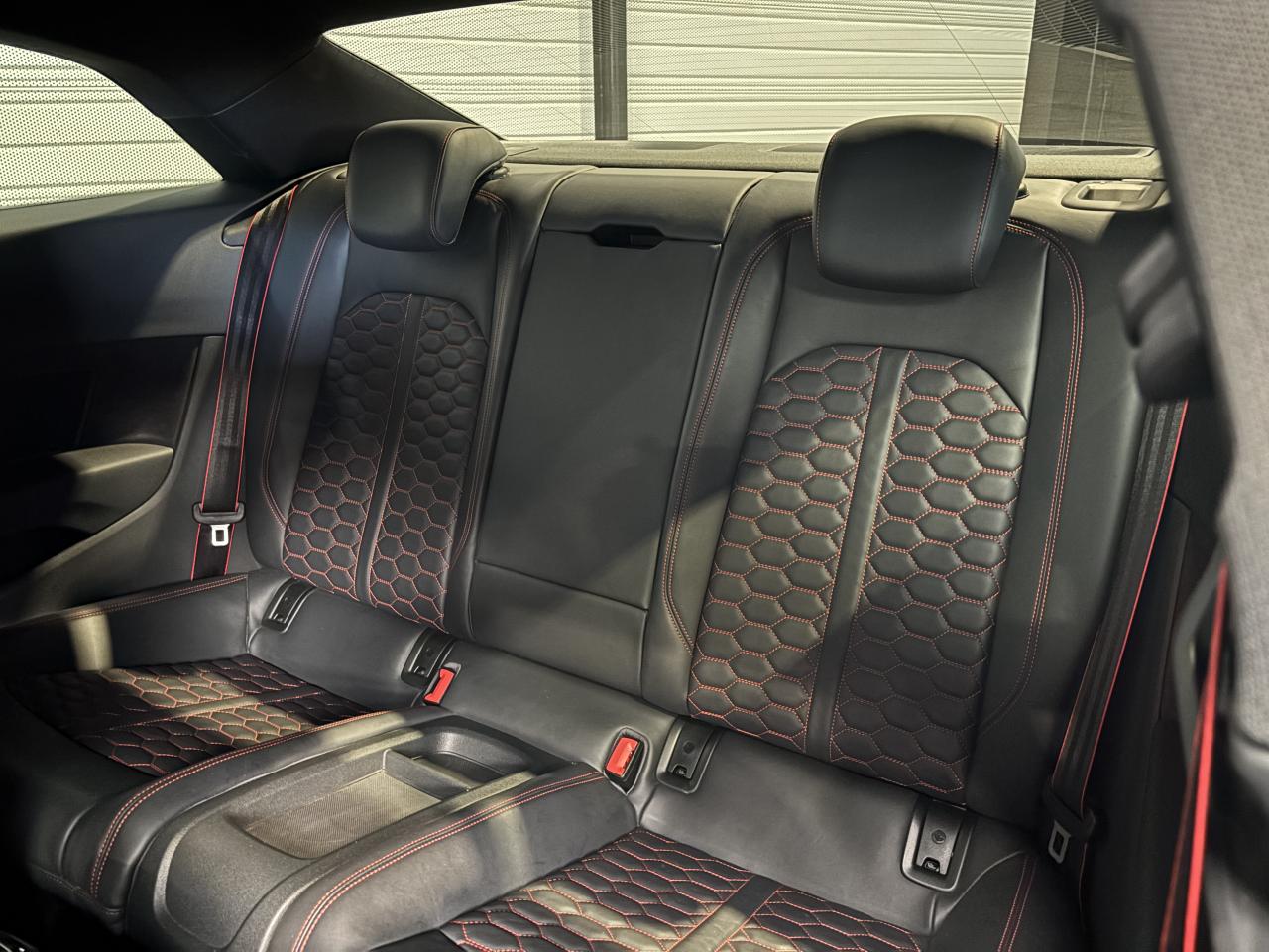 Nombreuses options : GPS, caméra de recul, radars avants et arrières de détection d'obstacles, Vitesse maximale relevée à 280km/h ( 1 500 € ), Jantes aluminium forgé 20'' ( 1 375 € ), Différentiel Quattro Sport ( 1 358 € ), Echappement Sport incluant sonorité encore plus travaillée et sorties d'échappement noires ( 1 250 € ), Bang & Olufsen Sound System avec son en 3D ( 858 € ), Peinture métallisée ( 841 € ), Sellerie en cuir Nappa fin ( 875 € ), Clé confort + Alarme antivol avec fonction safelock + fonction d'ouverture du coffre à l'aide du pied ( 483 € ), Vitres surteintées (Privacy Glass) ( 425 € ), Réception radio numérique (DAB) ( 341 € ), Système de lecture des panneaux de signalisation par caméra ( 308 € ), Etriers de frein laqués rouge brillant avec inscription RS à l'AV et à l'AR ( 308 € ), Applications décoratives en Piano laqué noir ( 216 € ), Coques de rétroviseurs noir brillant ( 108 € ), 3 profils de couleur prédéfinis et un profil de couleur personnalisable via l'Audi drive select aux parties suivantes : porte-boissons à l'AV, zone des pieds à l’AV, vide-poches de portières et éclairage d'ambiance des portières, Accoudoirs de porte en cuir Nappa fin noir avec surpiqûres rouge Dynamite, Active Lane Assist, ACC / Adaptive Cruise Control stop & go avec Assistant de conduite en embouteillage, Assistant de conduite efficiente, Audi Pre Sense Front avec Assistant d'évitement collision et Assistant changement direction, Augmentation de la vitesse de pointe à 280 km/h, Baguettes décoratives sur les vitres latérales noires, Becquet AV, Becquet AV en noir brillant, Ceintures de sécurité noires avec bordure rouge, Châssis Sport RS plus avec Dynamic Ride Control (DRC) réglable sur 3 niveaux: comfort, auto, dynamic, Diffuseur AR noir brillant, Direction Dynamique, Eléments de commande et repose genoux en Alcantara noir avec surpiqûres rouge Dynamite, Encadrement de calandre noir brillant, Lecture des panneaux de signalisation, Pack Eclairage, Phares Audi Matrix LED, Quattro avec différentiel Sport : sur la base d’une transmission intégrale permanente quattro à répartition asymétrique et dynamique du couple, le différentiel Sport régulé électroniquement répartit différemment la puissance, Tapis de sol noir avec surpiqûres rouge Dynamite et inscription RS AV...