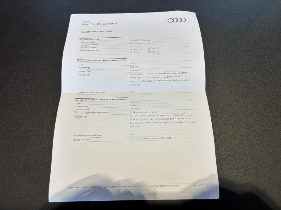- 6ème entretien fait le 21/03/2025 à 46 089Km chez Audi. ( Vidange moteur )