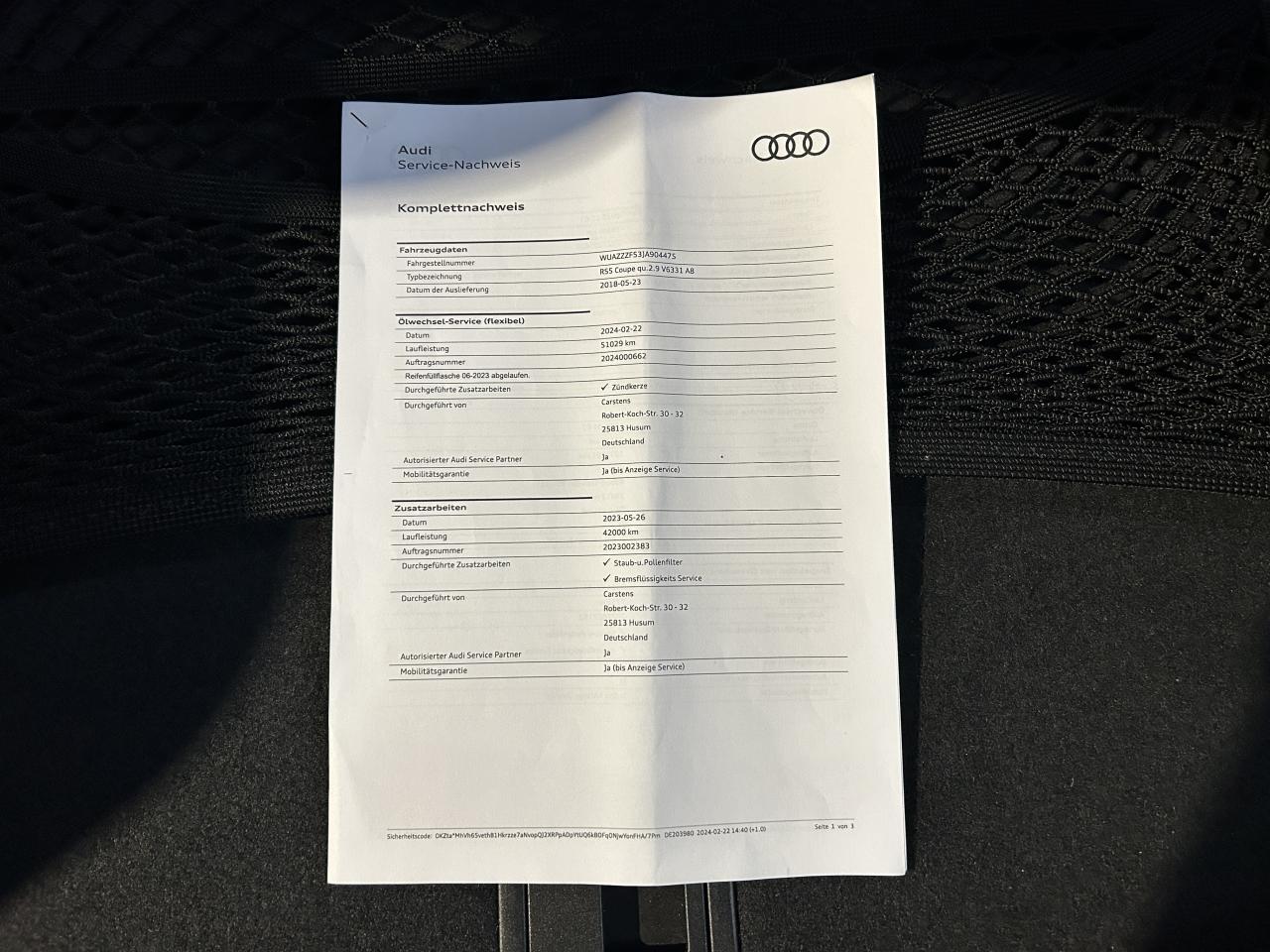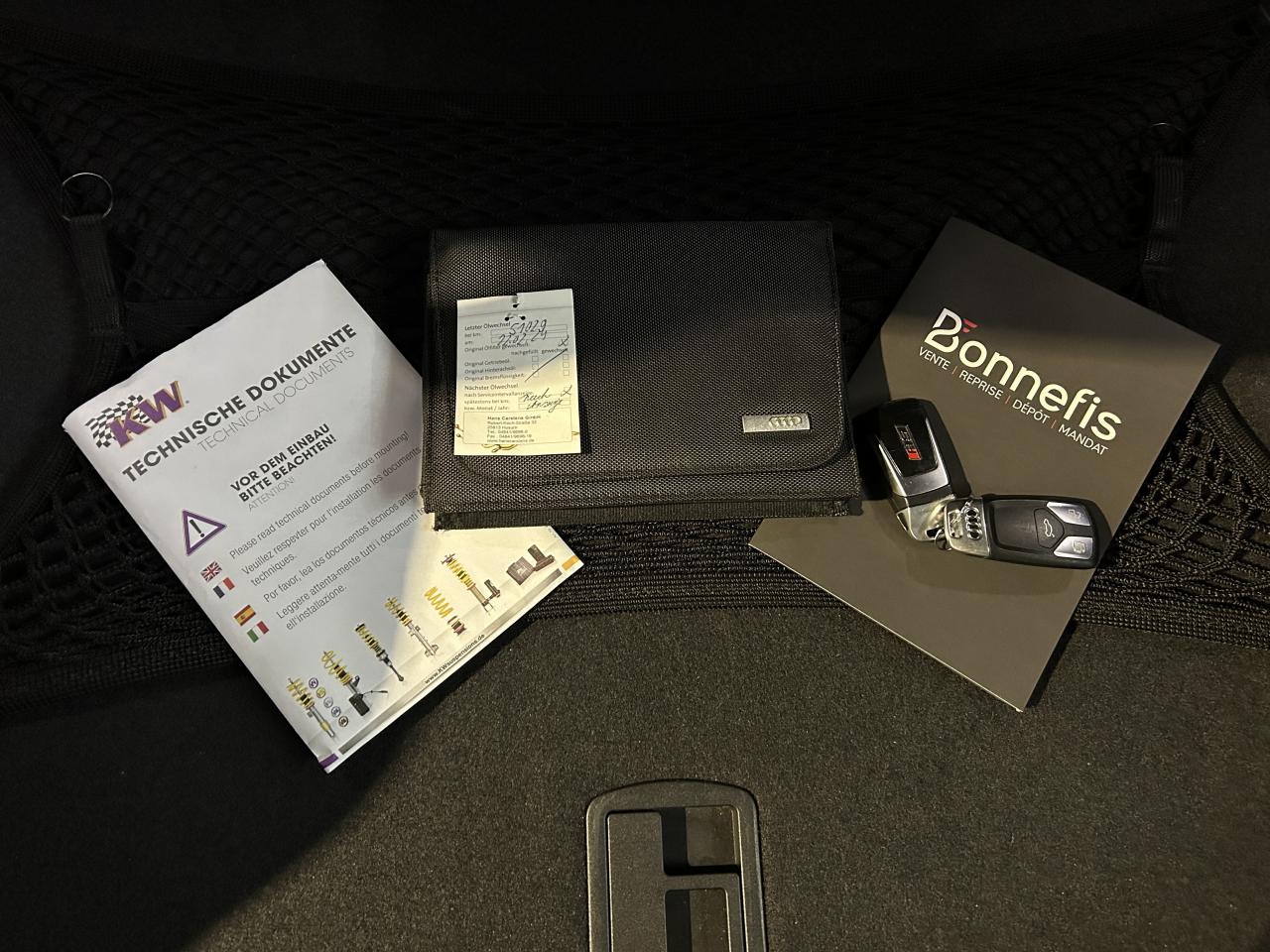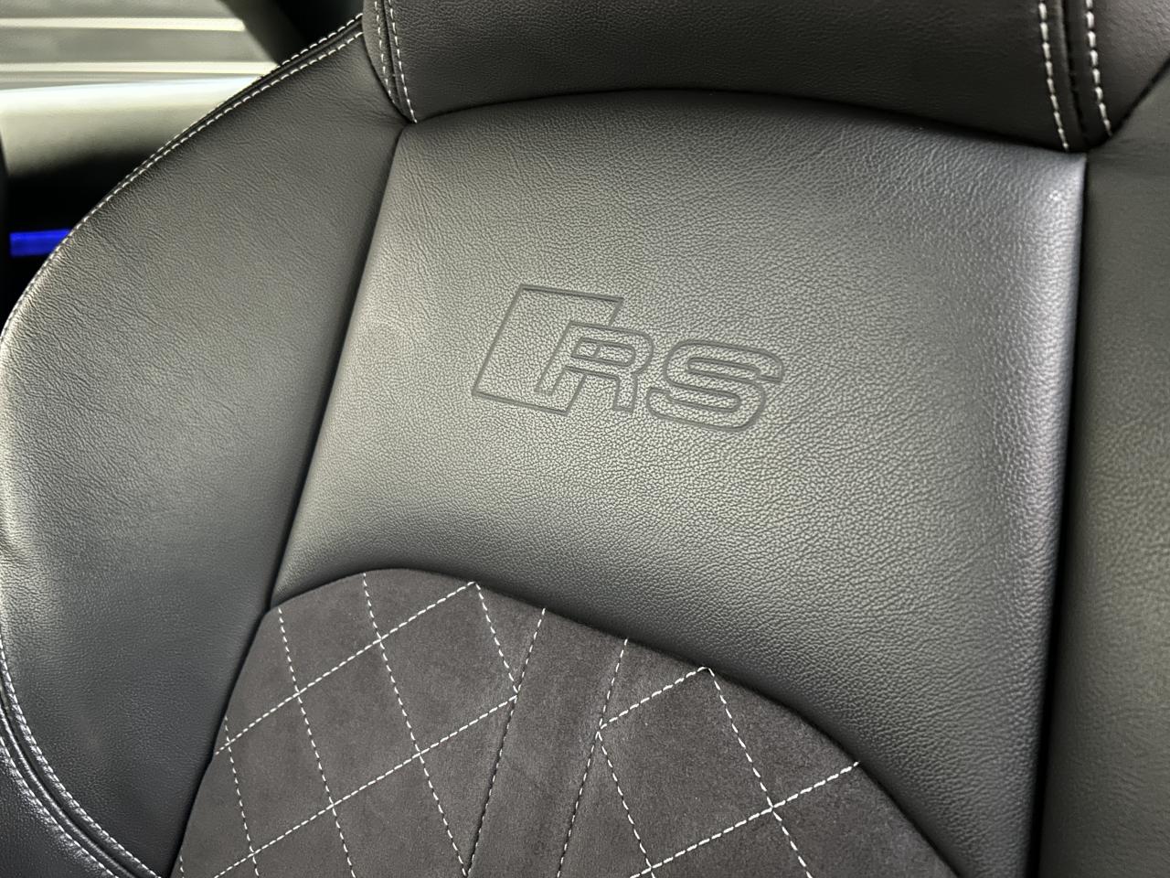 Nombreuses options : GPS, caméra de recul, radars avants et arrières de détection d'obstacles, différentiel Quattro Sport ( 1 358 € ), échappement Sport incluant sonorité travaillée et sorties noires ( 1 250 € ), direction Dynamique ( 1 008 € ), affichage tête haute ( 991 € ), Bang & Olufsen Sound System avec son en 3D ( 858 € ), phares Audi Matrix LED ( 712 € ), clé confort + alarme antivol avec fonction Safelock et ouverture du coffre avec le pied ( 483 € ), éléments de l’habitacle en simili-cuir ( 366 € ), réception radio numérique DAB ( 341 € ), applications décoratives en Aluminium Racing anthracite ( 350 € ), sièges AV/AR chauffants ( 333 € ), système de lecture des panneaux de signalisation par caméra ( 308 € ), étriers de frein laqués rouge brillant avec inscription RS AV et AR ( 308 € ), système de contrôle de pression des pneus ( 250 € ), commande d'ouverture de porte de garage HomeLink ( 237 € ), volant 3 branches multifonctions plus en cuir chauffant avec palettes et logo RS ( 91 € ), 3 profils de couleur prédéfinis et un personnalisable via Audi drive select, baguettes décoratives sur les vitres latérales noires, becquet AV noir brillant, boîte à gants verrouillable, coques de rétroviseurs noir brillant, crochets pour sacs dans le coffre, diffuseur AR noir brillant, encadrement de calandre noir brillant, filet dans le logement gauche du coffre, filet de coffre, filet de rangement au dos des sièges AV, pack Éclairage, porte-boissons dans l’accoudoir central AR, prise 12V dans le coffre, sellerie mixte cuir / Alcantara estampillée RS, vide-poches côté conducteur, ...