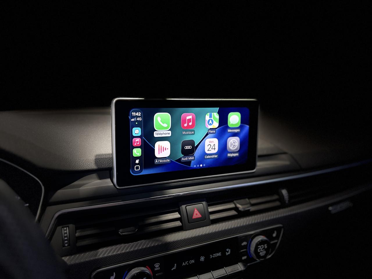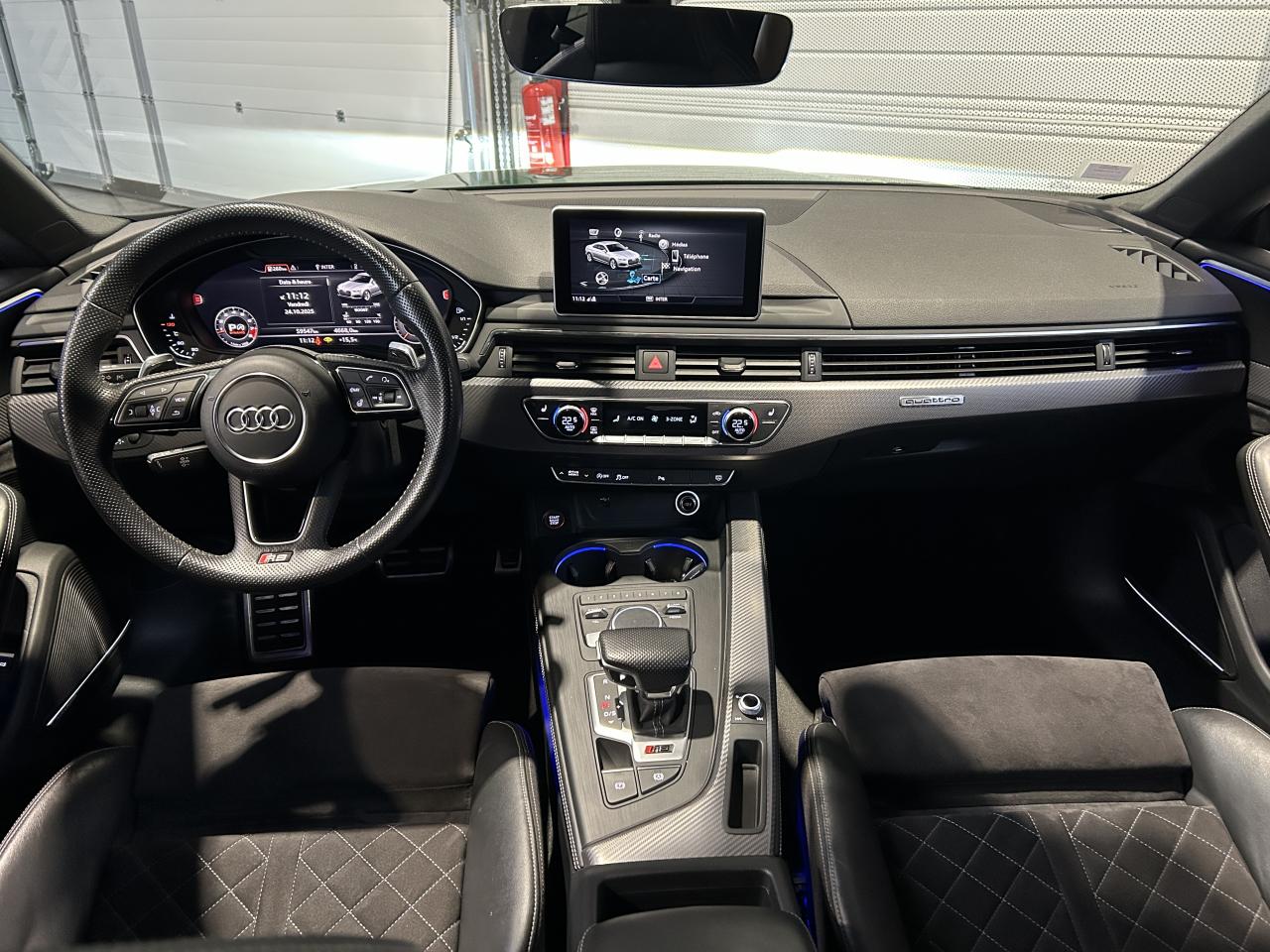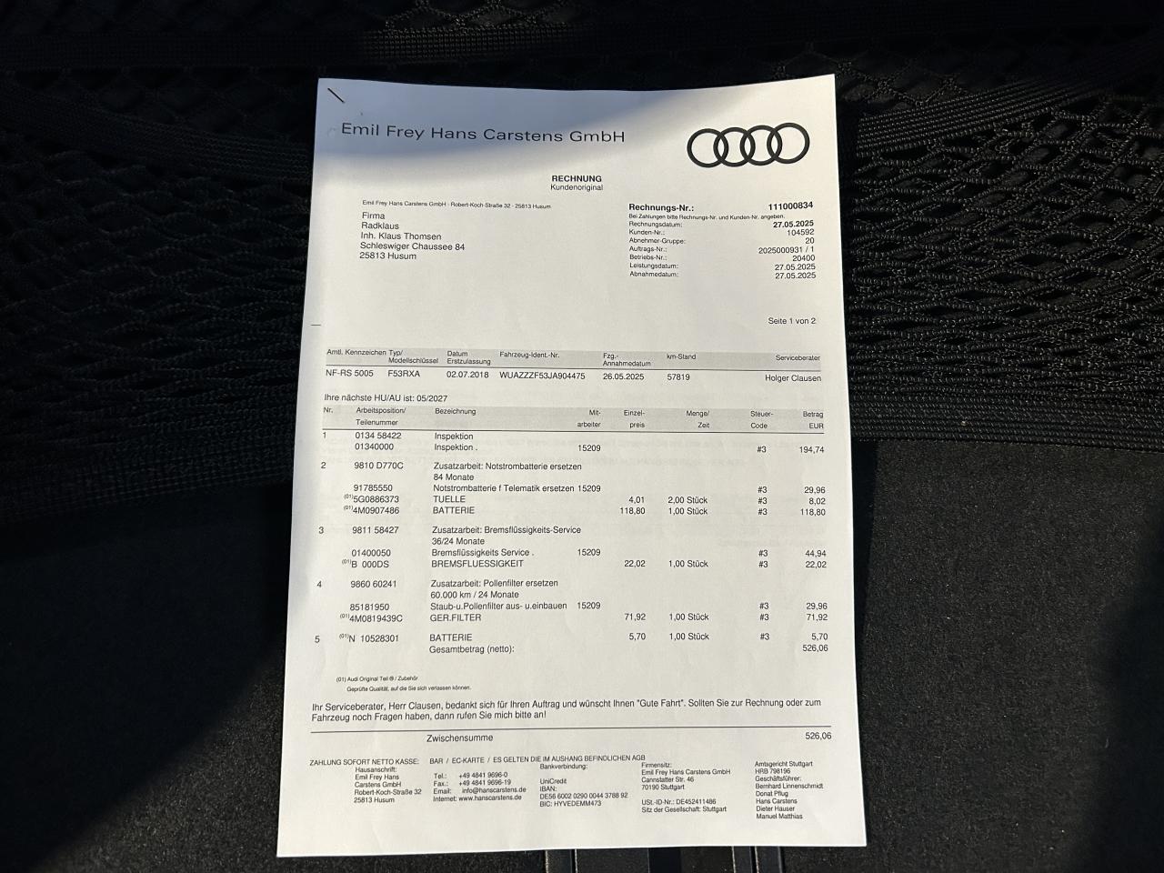 Nombreuses options : GPS, caméra de recul, radars avants et arrières de détection d'obstacles, différentiel Quattro Sport ( 1 358 € ), échappement Sport incluant sonorité travaillée et sorties noires ( 1 250 € ), direction Dynamique ( 1 008 € ), affichage tête haute ( 991 € ), Bang & Olufsen Sound System avec son en 3D ( 858 € ), phares Audi Matrix LED ( 712 € ), clé confort + alarme antivol avec fonction Safelock et ouverture du coffre avec le pied ( 483 € ), éléments de l’habitacle en simili-cuir ( 366 € ), réception radio numérique DAB ( 341 € ), applications décoratives en Aluminium Racing anthracite ( 350 € ), sièges AV/AR chauffants ( 333 € ), système de lecture des panneaux de signalisation par caméra ( 308 € ), étriers de frein laqués rouge brillant avec inscription RS AV et AR ( 308 € ), système de contrôle de pression des pneus ( 250 € ), commande d'ouverture de porte de garage HomeLink ( 237 € ), volant 3 branches multifonctions plus en cuir chauffant avec palettes et logo RS ( 91 € ), 3 profils de couleur prédéfinis et un personnalisable via Audi drive select, baguettes décoratives sur les vitres latérales noires, becquet AV noir brillant, boîte à gants verrouillable, coques de rétroviseurs noir brillant, crochets pour sacs dans le coffre, diffuseur AR noir brillant, encadrement de calandre noir brillant, filet dans le logement gauche du coffre, filet de coffre, filet de rangement au dos des sièges AV, pack Éclairage, porte-boissons dans l’accoudoir central AR, prise 12V dans le coffre, sellerie mixte cuir / Alcantara estampillée RS, vide-poches côté conducteur, ...
