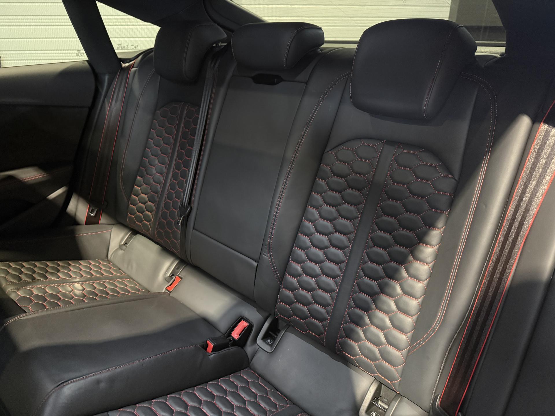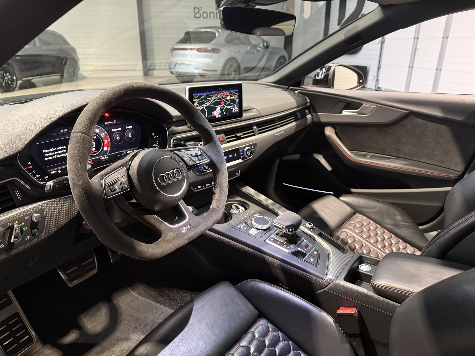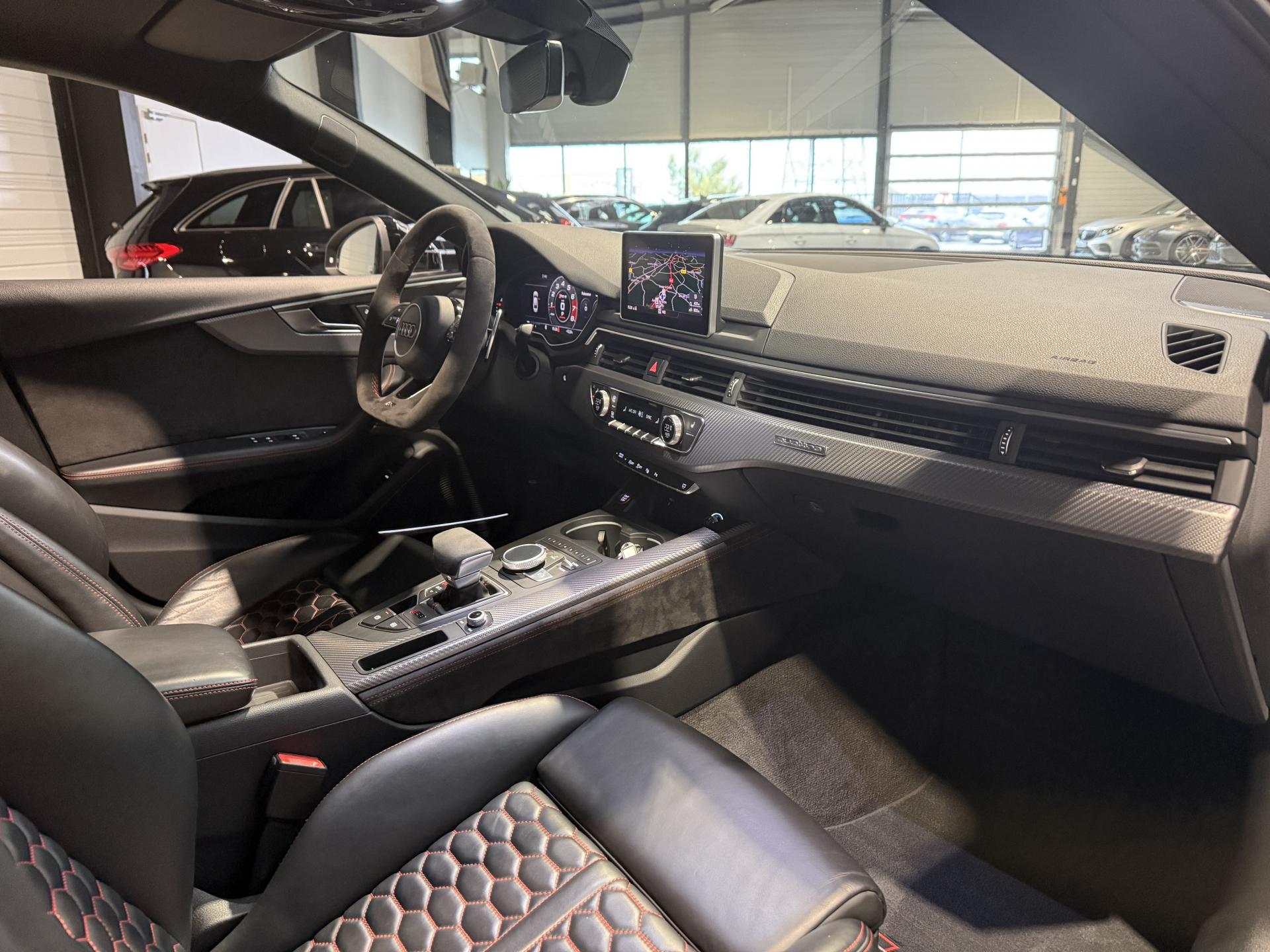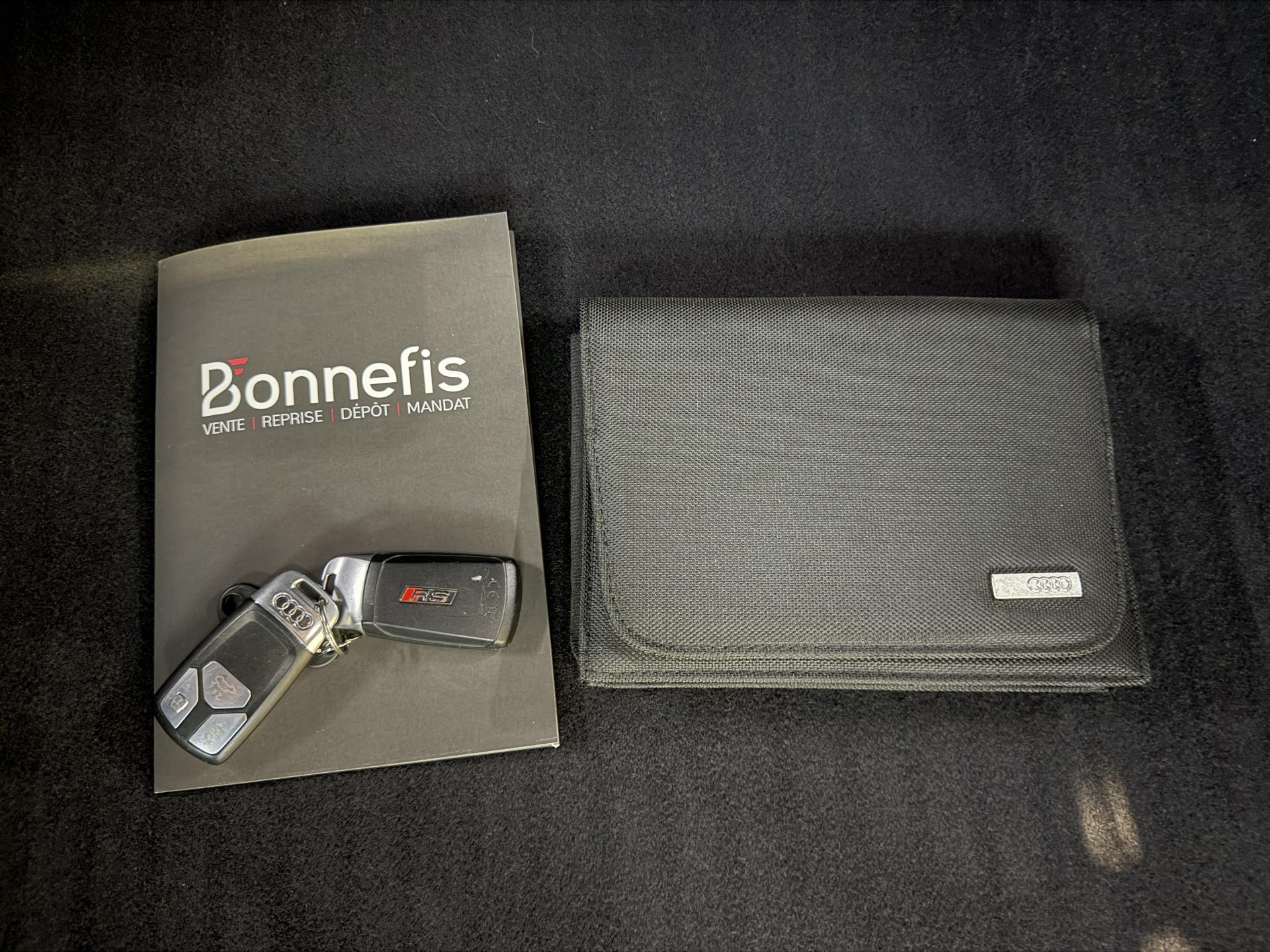 Nombreuses options : GPS, caméra de recul, Apple Carplay, radars avants et arrières de détection d'obstacles, Jantes aluminium forgé 20'' 5 branches en drapeau noir anthracite brillant ( 2 354 € ), Toit ouvrant coulissant/relevable électriquement en verre de sécurité teinté avec pare-soleil réglable en continu ( 1 341 € ), Échappement Sport avec sonorité travaillée et sorties d’échappement noires ( 1 250 € ), Affichage tête haute ( 991 € ), Bang & Olufsen Sound System avec son 3D ( 858 € ), Clé confort avec alarme antivol, fonction safelock et ouverture du coffre par mouvement du pied ( 483 € ), Airbags latéraux AR ( 375 € ), Applications décoratives en Aluminium Racing anthracite ( 350 € ), Réception radio numérique DAB ( 341 € ), Sièges AV et AR chauffants ( 333 € ), Étriers de frein laqués rouge brillant avec inscription RS à l’AV et à l’AR ( 308 € ), Audi Park Assist ( 275 € ), Système de contrôle de pression des pneus ( 250 € ), Commande d’ouverture de porte de garage HomeLink ( 237 € ), Coques de rétroviseurs noir brillant ( 108 € ), Fixation ISOFIX pour siège passager AV avec désactivation de l’airbag et sécurité enfant électrique ( 83 € ), ACC / Active Cruise Control stop & go avec assistant de conduite en embouteillage, Active Lane Assist, Assistant de conduite efficiente, Audi Pre Sense Front avec assistant d’évitement de collision et assistant de changement de direction, Châssis Sport RS plus avec Dynamic Ride Control DRC réglable sur 3 niveaux, Différentiel Quattro Sport, Direction Dynamique, Phares Audi Matrix LED, Pack Éclairage, Lecture des panneaux de signalisation, Système de lecture des panneaux de signalisation par caméra, Vitesse maximale relevée à 280 km/h, Volant 3 branches multifonctions plus en Alcantara avec méplat et logo RS, Accoudoirs de porte en cuir Nappa fin noir avec surpiqûres rouge Dynamite, Éléments de commande et repose-genoux en Alcantara noir avec surpiqûres rouge Dynamite, Ceintures de sécurité noires avec liseré rouge, Tapis de sol noir avec surpiqûres rouge Dynamite et inscription RS AV, Porte-boissons dans l’accoudoir central AR, Boîte à gants verrouillable, Prise 12V dans le coffre, Vide-poches côté conducteur, Crochets pour sacs dans le coffre, Filet de coffre, Filet dans le logement gauche du coffre, Filet de rangement au dos des sièges AV, Éclairage d’ambiance personnalisable avec profils de couleur via Audi drive select, ....