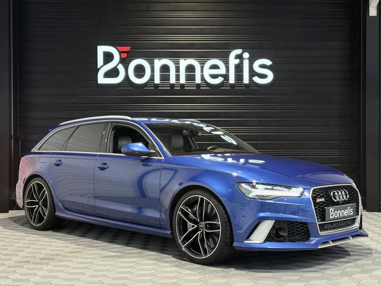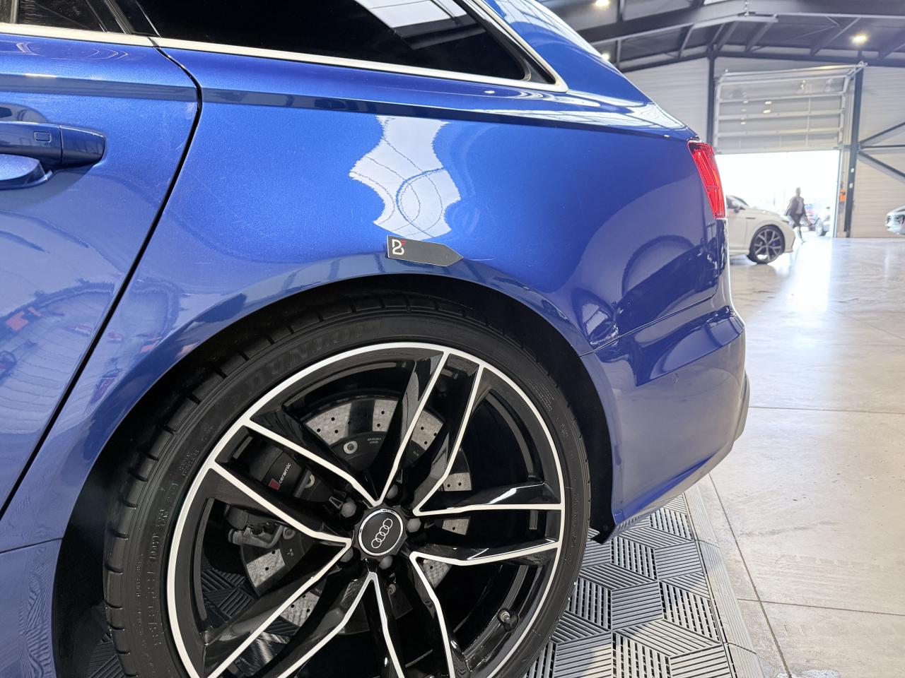 Audi RS6 Avant C7 Performance 4.0 V8 TFSI 605 Ch Quattro BVA Tiptronic 8 Pack RS Dynamic +, break, 52 cv, 5 portes, extérieur bleu ( bleu Sepang nacré ), intérieur Sellerie cuir Valcona : sièges, appuie-tête, contre-portes et accoudoir central AV en cuir Valcona, première mise en circulation le 01/04/2017.
