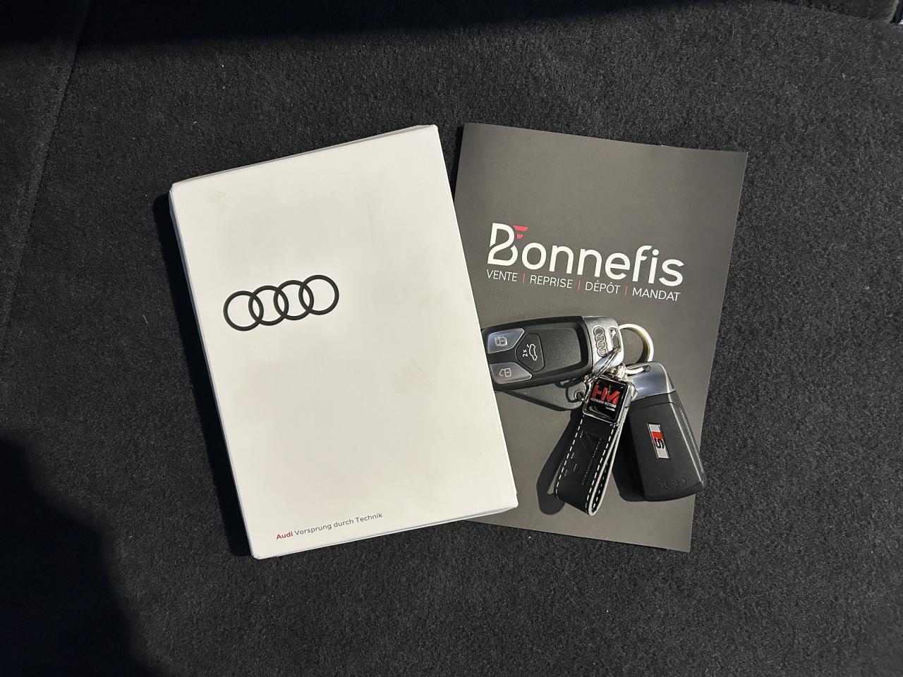 Nombreuses options : GPS, caméra de recul, radars avants et arrières de détection d'obstacles, Bang & Olufsen Sound System avec son en 3D ( 858 € ), Pack Audi Lane Assist ( 608 € ), Pack Esthétique Noir ( 566 € ), Pare-brise confort climatique/acoustique, sans résistances, chauffant ( 437 € ), Etriers de frein laqués rouges ( 333 € ), Sièges AV avec fonction massage ( 216 € ), Assistant de feux de route, activation et désactivation automatique des feux de route ( 158 € ), Stores pare-soleil manuels pour les vitres de portières AR ( 154 € ), Vitrage acoustique pour les vitres de portières AV ( 154 € ), Audi Drive Select permettant de sélectionner différents modes de conduite : Efficiency, Confort, Dynamic, Lift, Individual. Les systèmes et équipements du véhicule s'adaptent suivant le mode sélectionné, Audi Virtual Cockpit, Ciel de pavillon en tissu noir, Coffre à ouverture et fermeture électriques, Feux AR à LED avec clignotants dynamiques, Phares AV Full LED, Rétroviseur intérieur sans encadrement jour/nuit automatique, Rétroviseurs extérieurs réglables et escamotables électriquement, jour/nuit automatique, dégivrants des deux côtés et buses de lave-glaces dégivrantes, Rampes de pavillon Noires, Sellerie Alcantara Fréquence/Cuir combinés (pour sièges Sport), Sièges AV chauffants, Sièges AV réglables électriquement avec fonction mémoire pour le siège conducteur, Affichage de contrôle de pression des pneus, Système de lecture des panneaux de signalisation par caméra, ...