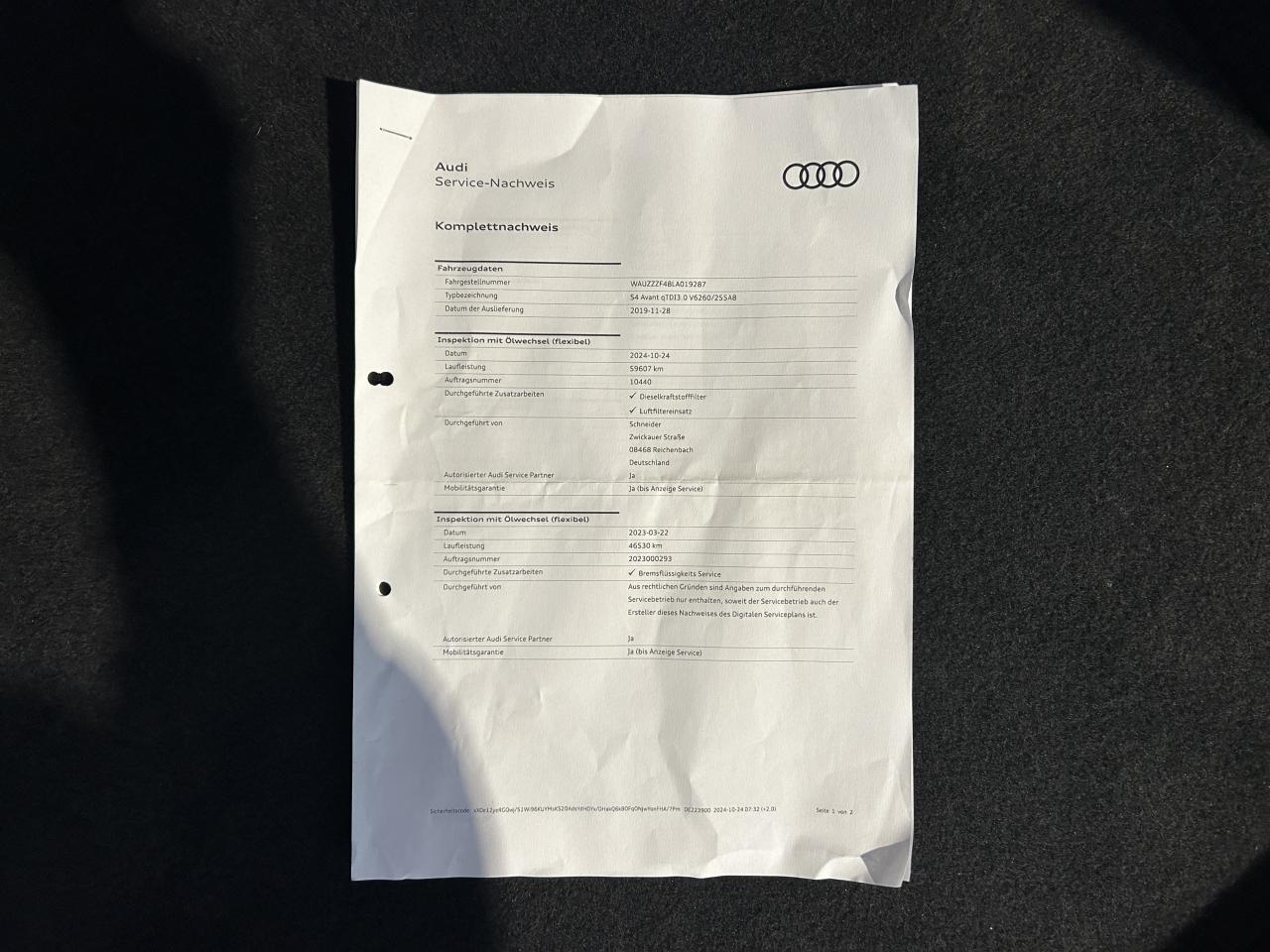 - 4ème entretien fait le 24/10/2024 à 59 607Km chez Audi. ( Vidange moteur + filtre à carburant + filtre à air )