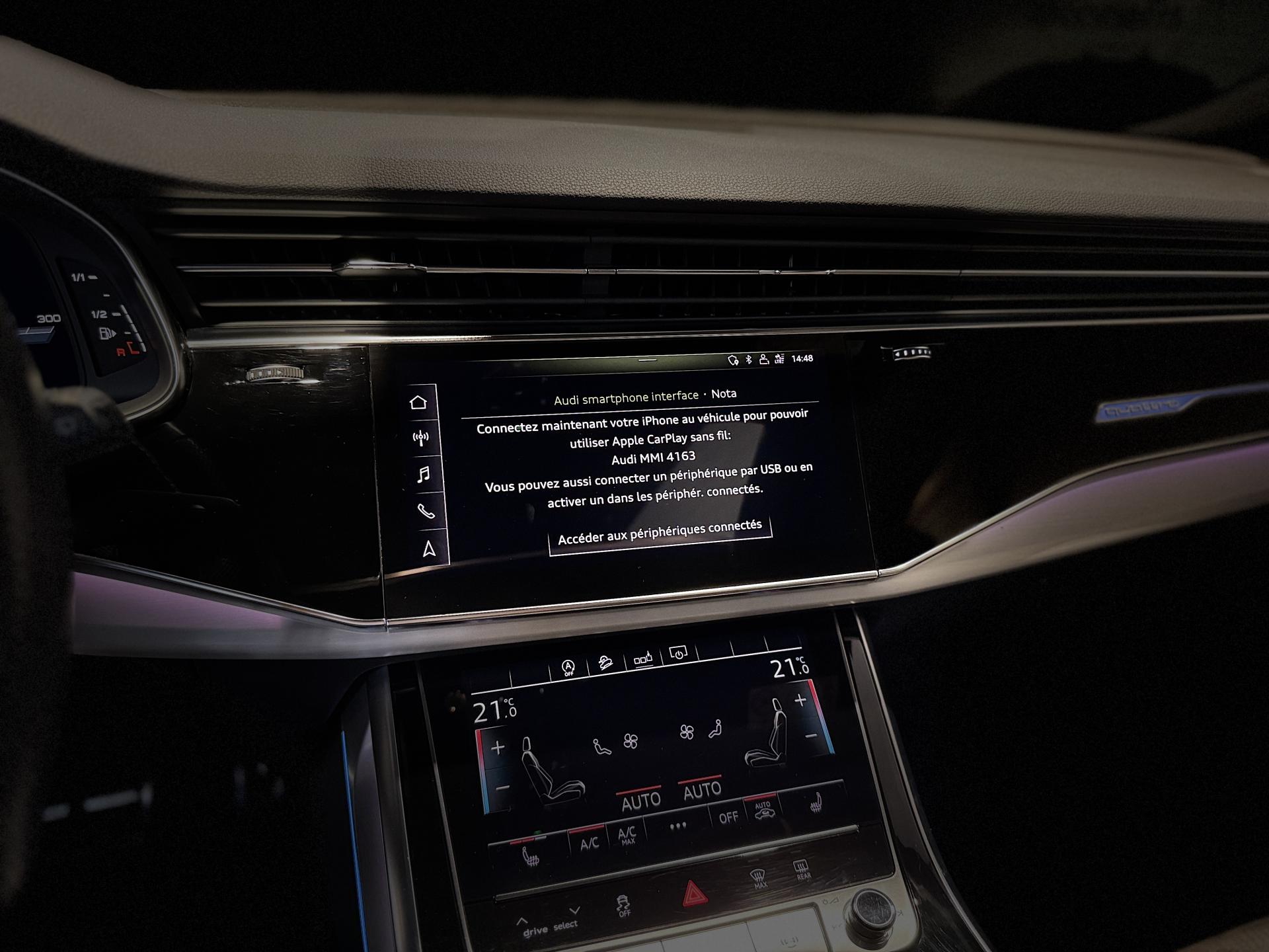 Nombreuses options : GPS, Caméras périphériques 360°, Apple Carplay, radars avants et arrières de détection d'obstacles, Toit panoramique en verre ( 1 541 € ), Jantes 22" Audi Sport en aluminium forgé style 5 branches doubles en "V" ( 1 416 € ), Direction intégrale (4 roues motrices) ( 1 208 € ), Pack Esthétique Noir ( 745 € ), Masque Singleframe en noir brillant ( 708 € ), Ouverture et fermeture assistées des portières (Soft Close) ( 666 € ), Crochet d'attelage électrique ( 700 € ), Etriers de freins laqués Rouges ( 416 € ), Rampes de pavillon laquées noires ( 416 € ), Sièges AV/AR chauffants ( 415 € ), Banquette AR plus ( 250 € ), Filet de séparation ( 104 € ), Lecteur CD / DVD ( 190 € ), Caméra de reconnaissance et lecture des panneaux de circulation ( 208 € ), Assistant de maintien de la vitesse adaptatif ( ACC / Active Cruise Control ), Audi parking system plus avec protection latérale active, 4 caméras périphériques grand angle couvrent l’intégralité de la zone tout autour du véhicule, Visualisation virtuelle en 3D du véhicule et de son environnement, Assistant d'évitement d'urgence, Assistant de changement de direction, Assistant d'efficience prédictive, Assistant de conduite adaptatif incluant assistant de conduite en embouteillage, Avertissement de franchissement de ligne incluant assistant de freinage d'urgence, Audi Virtual Cockpit combiné d’instruments entièrement numérique de 12.3" avec affichage haute résolution, Bang & Olufsen Premium Sound System avec son en 3D, Ciel de pavillon en Tissu Noir, Climatisation automatique Confort 4 zones AV/AR, Contrôle des caméras via le système MMI, Lave-phares haute pression, Pare-brise en verre de sécurité feuilleté athermique, ...